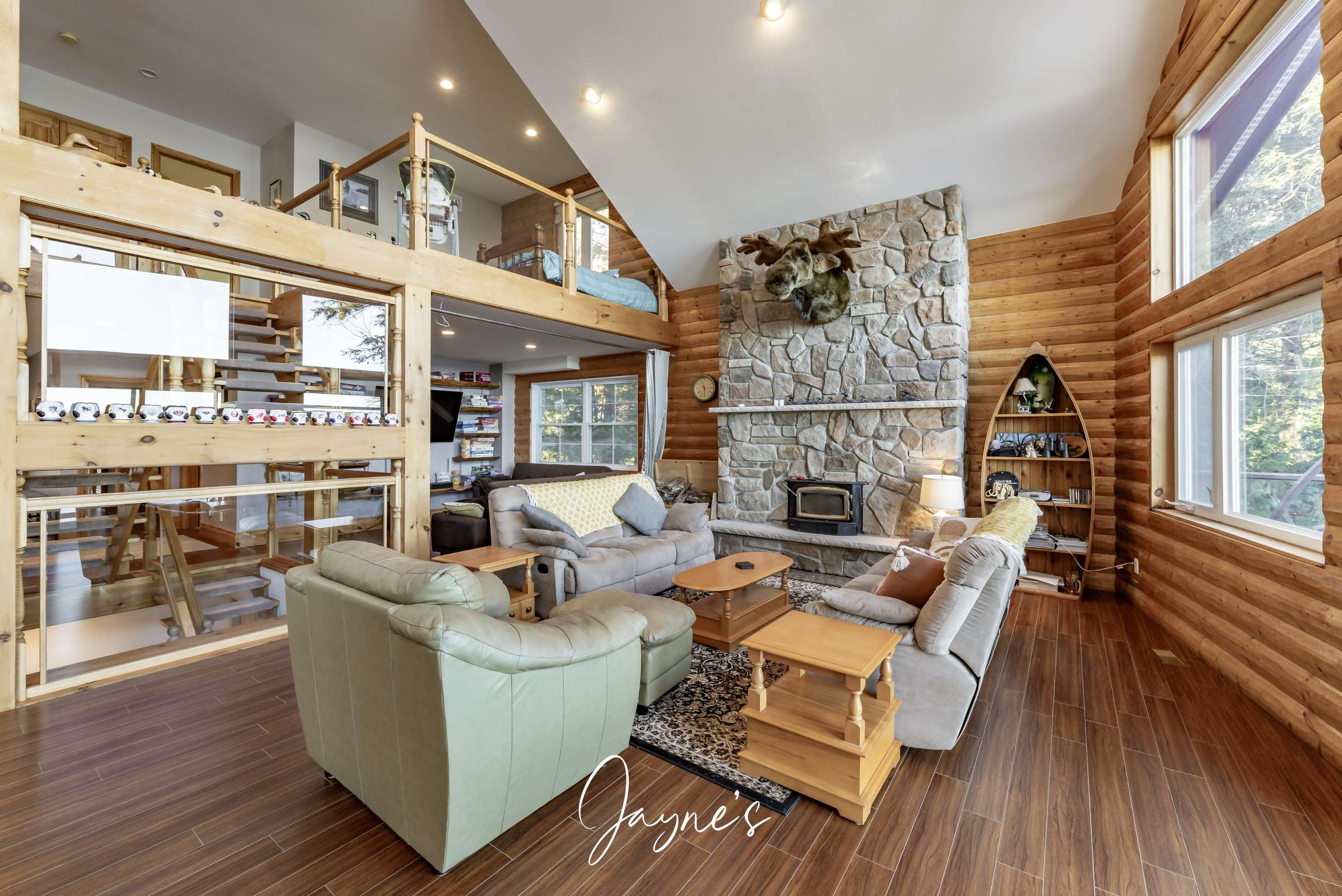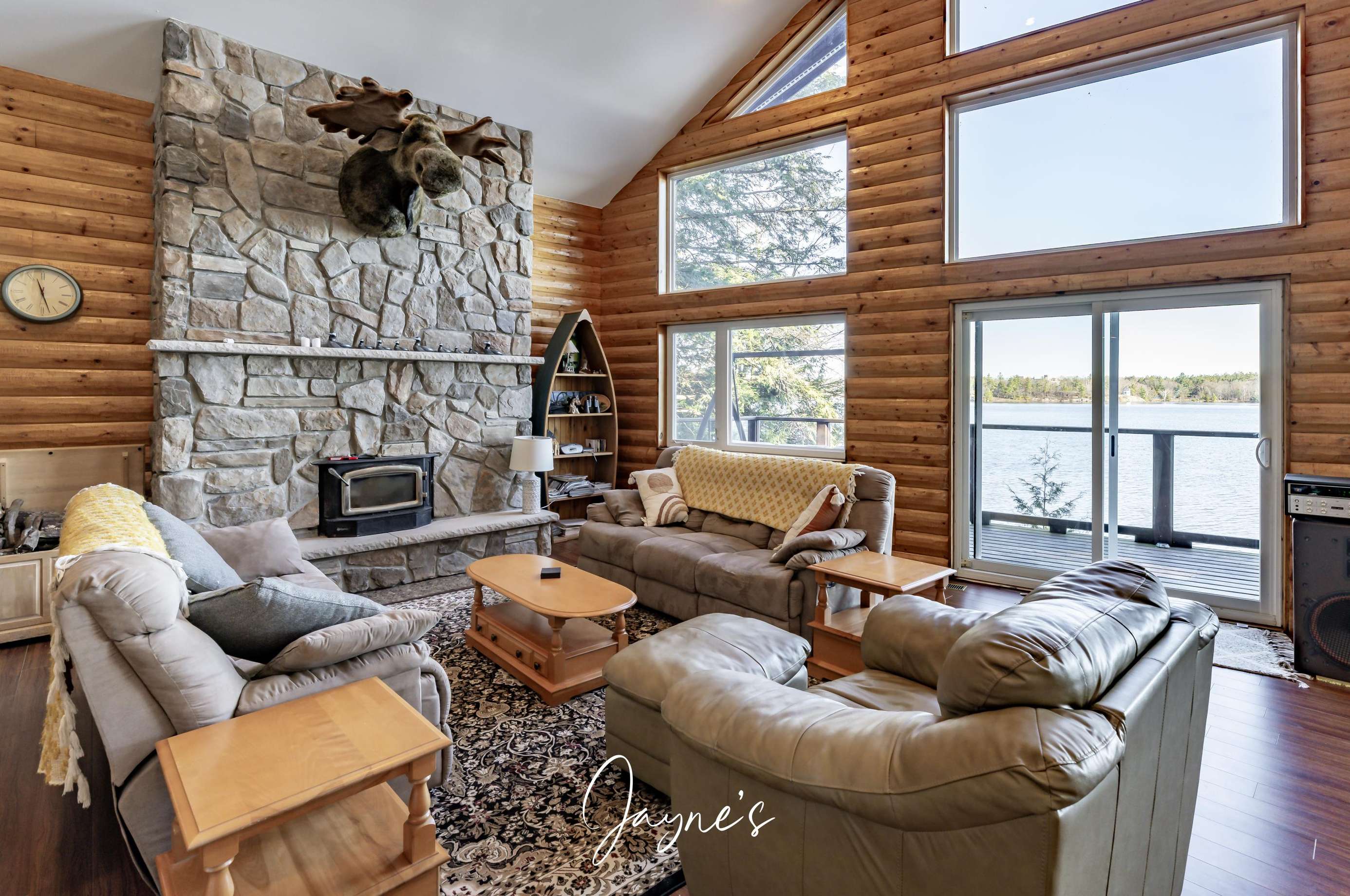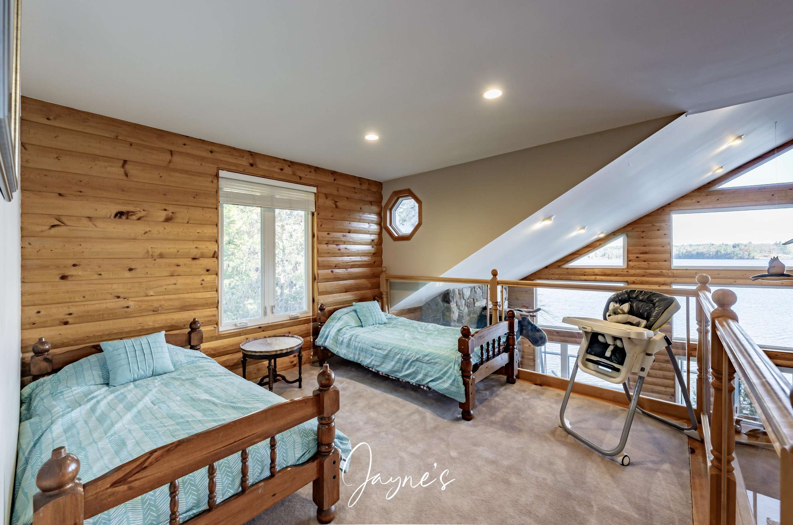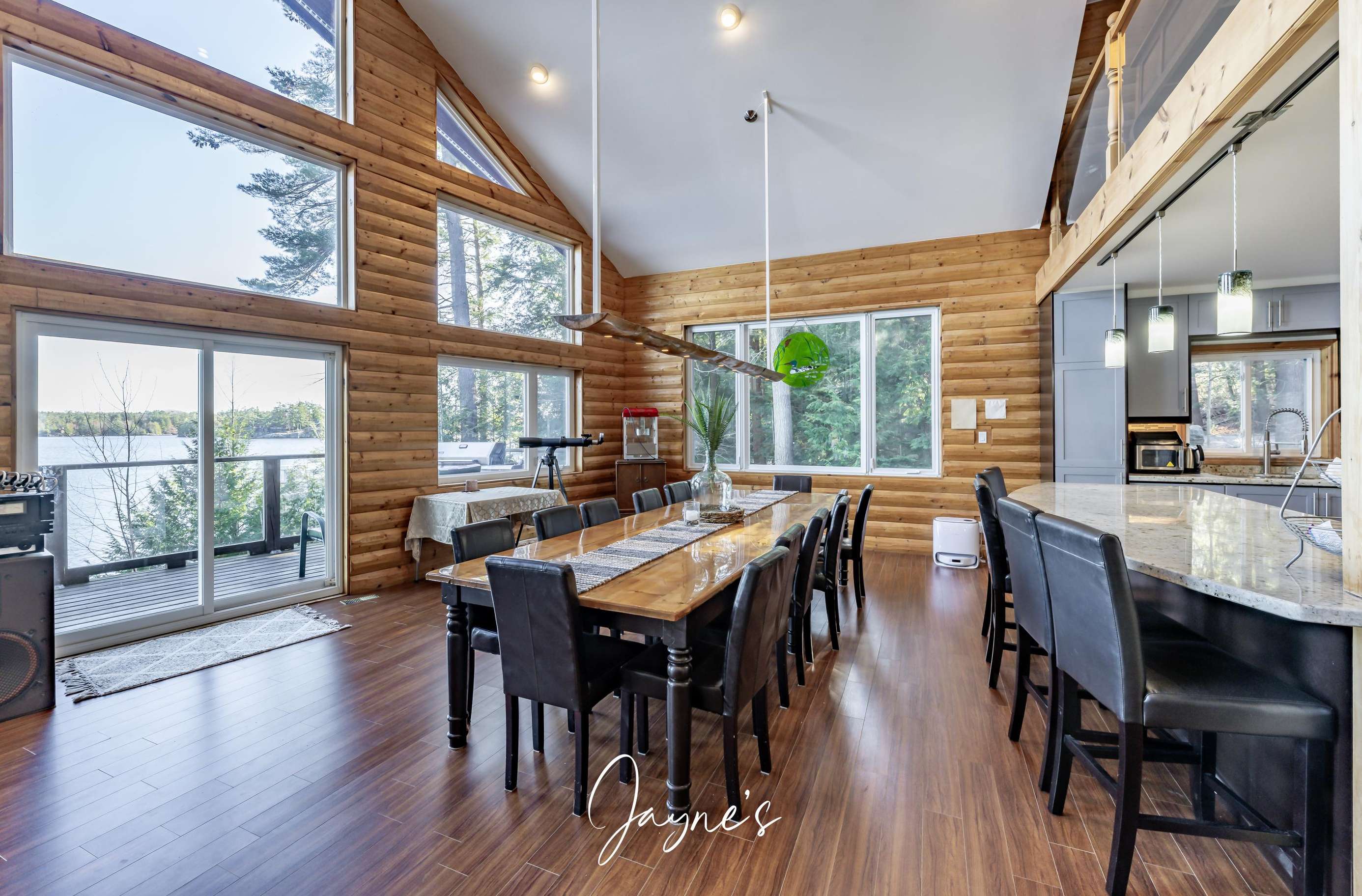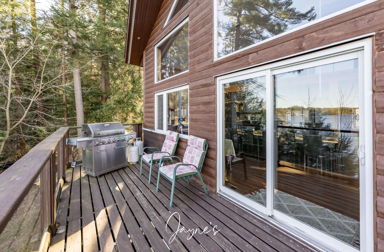 COMFORT ZONE - This exquisite four-bedroom, three-bathroom main cottage features a thoughtfully designed open concept layout that seamlessly integrates living spaces while enhancing the sense of spaciousness. The inviting loft area serves as an ideal retreat for relaxation or recreational activities. An expansive upper deck provides breathtaking views, while the charming patio is complemented by a luxurious hot tub, perfect for unwinding after a day of outdoor adventures. A brief stroll leads to the waterfront, where residents can indulge in various water sports and utilize the convenient boat lift for docking. Additionally, the two-storey bunkie offers a multifunctional space, complete with a kitchenette, a cozy living area equipped with a fireplace, a bedroom, and a loft area, making it an excellent accommodation for guests. For further enjoyment, a well-appointed rec room resides below, ensuring ample opportunities for entertainment and leisure.