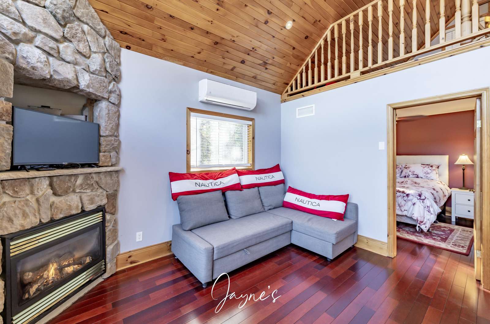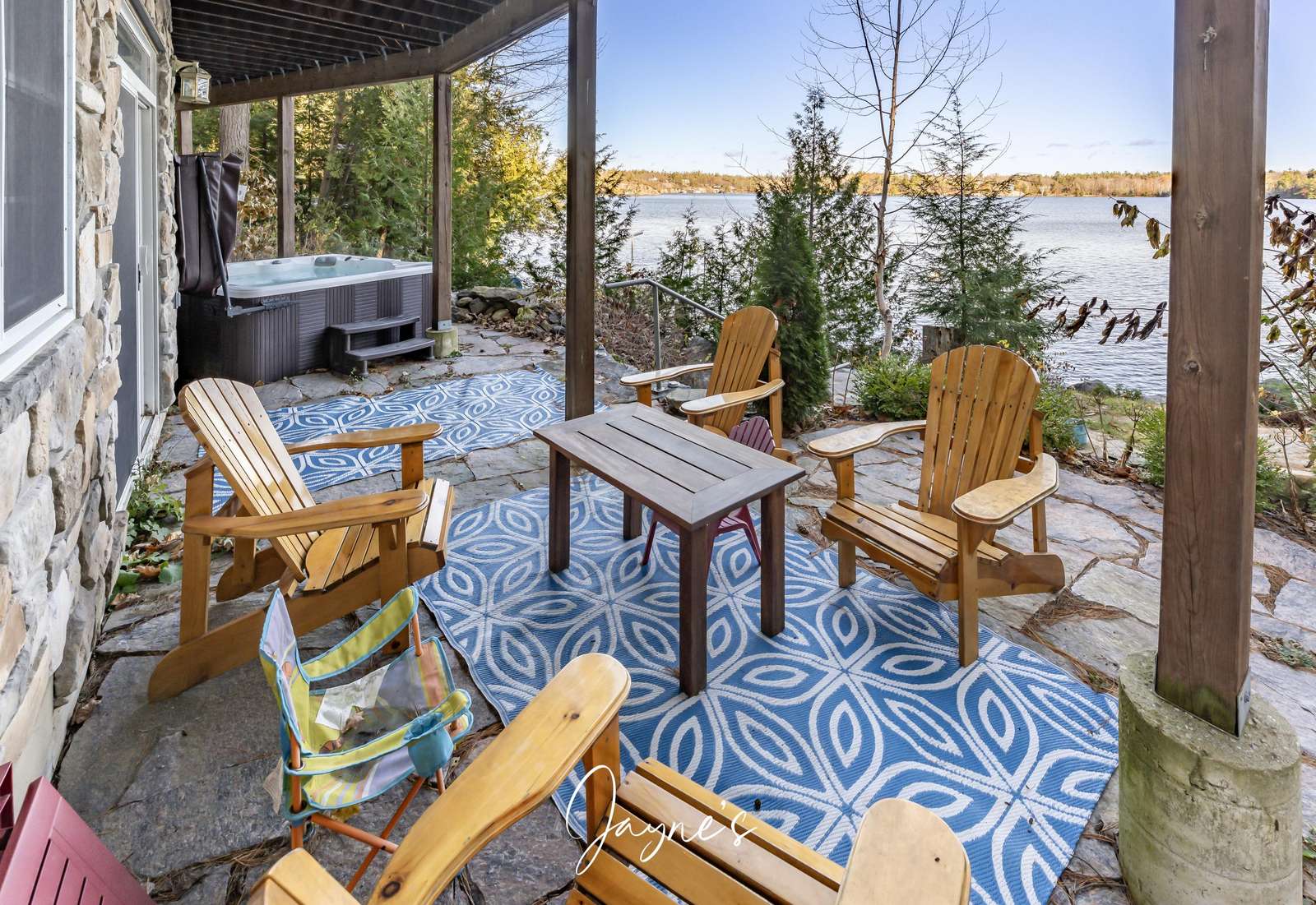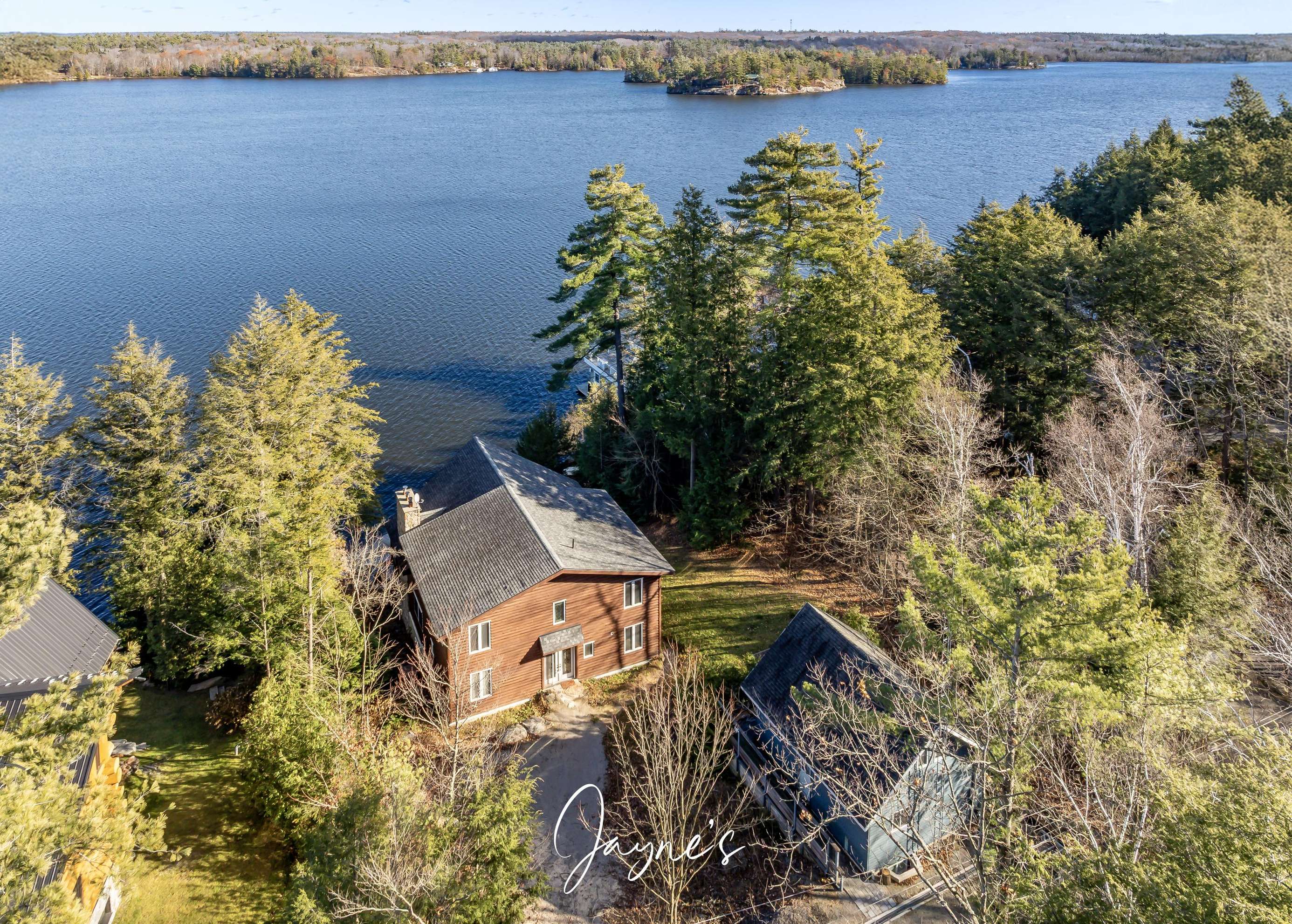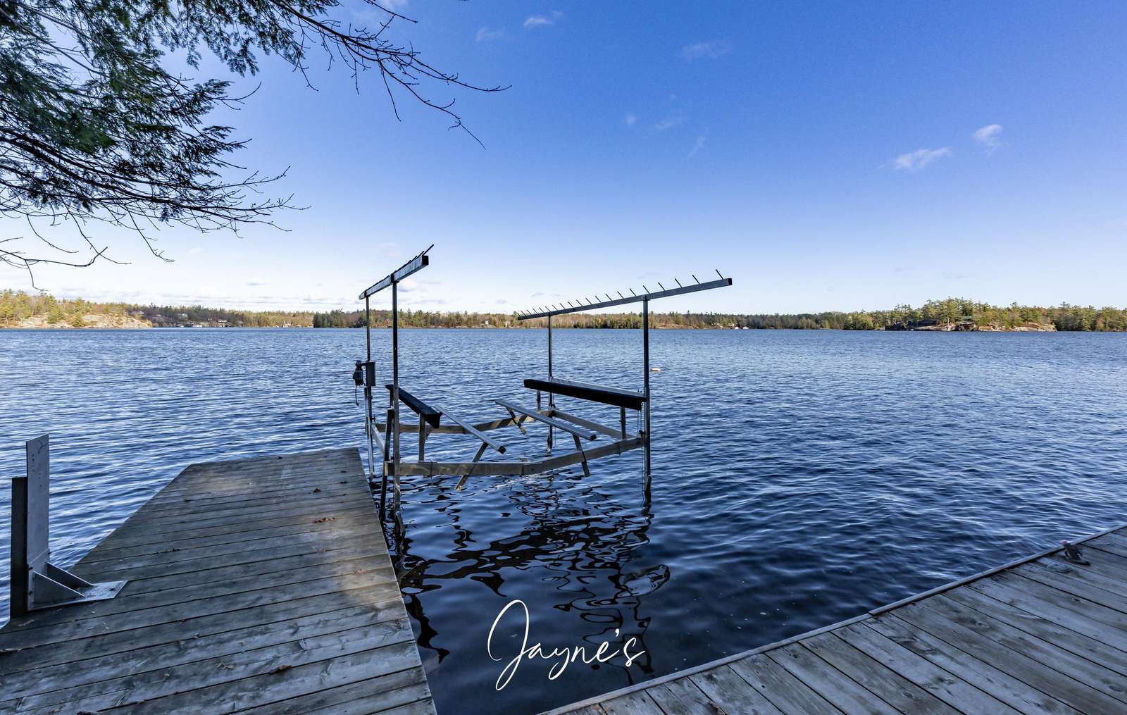 COMFORT ZONE - This exquisite four-bedroom, three-bathroom main cottage features a thoughtfully designed open concept layout that seamlessly integrates living spaces while enhancing the sense of spaciousness. The inviting loft area serves as an ideal retreat for relaxation or recreational activities. An expansive upper deck provides breathtaking views, while the charming patio is complemented by a luxurious hot tub, perfect for unwinding after a day of outdoor adventures. A brief stroll leads to the waterfront, where residents can indulge in various water sports and utilize the convenient boat lift for docking. Additionally, the two-storey bunkie offers a multifunctional space, complete with a kitchenette, a cozy living area equipped with a fireplace, a bedroom, and a loft area, making it an excellent accommodation for guests. For further enjoyment, a well-appointed rec room resides below, ensuring ample opportunities for entertainment and leisure.