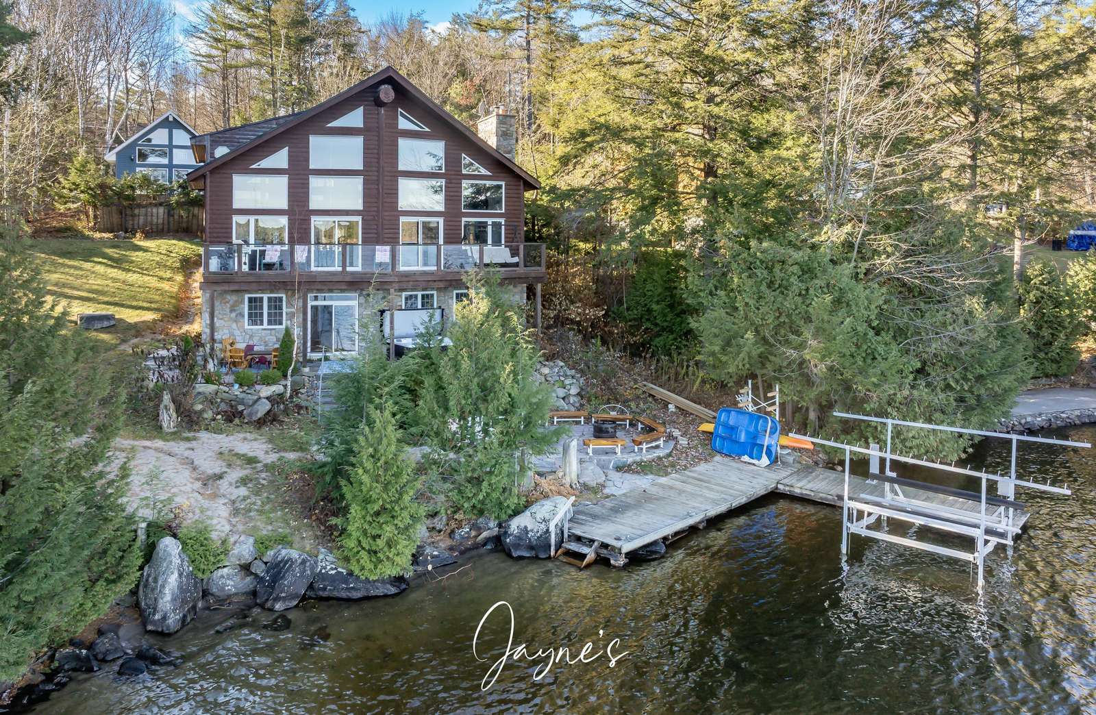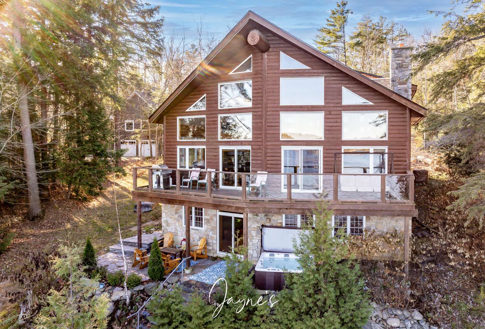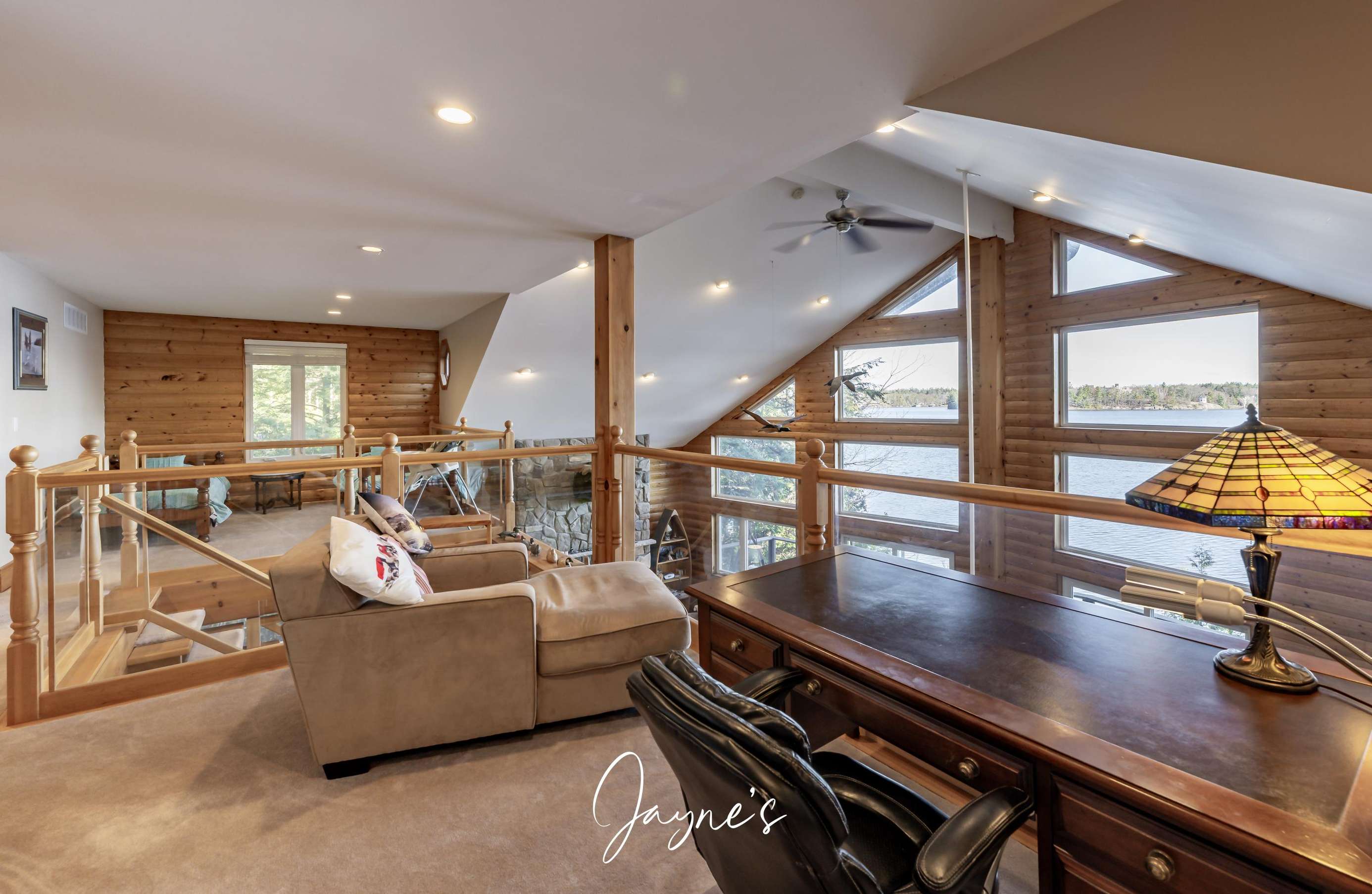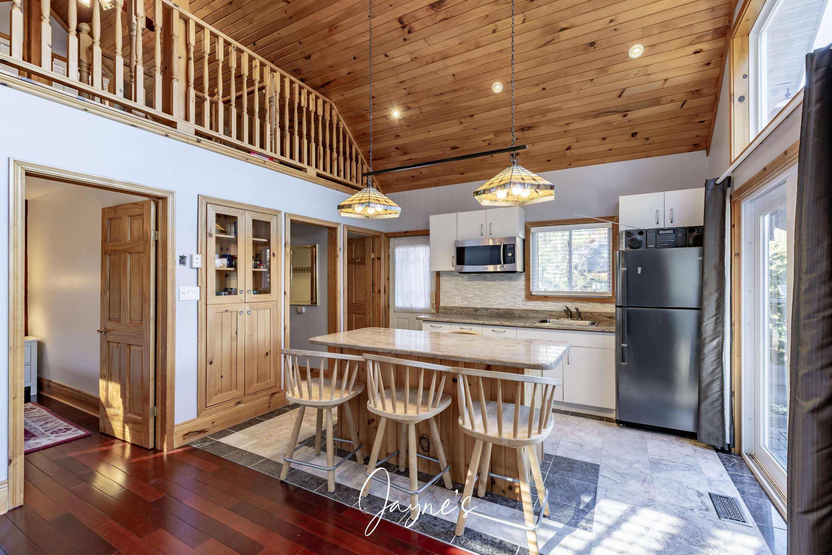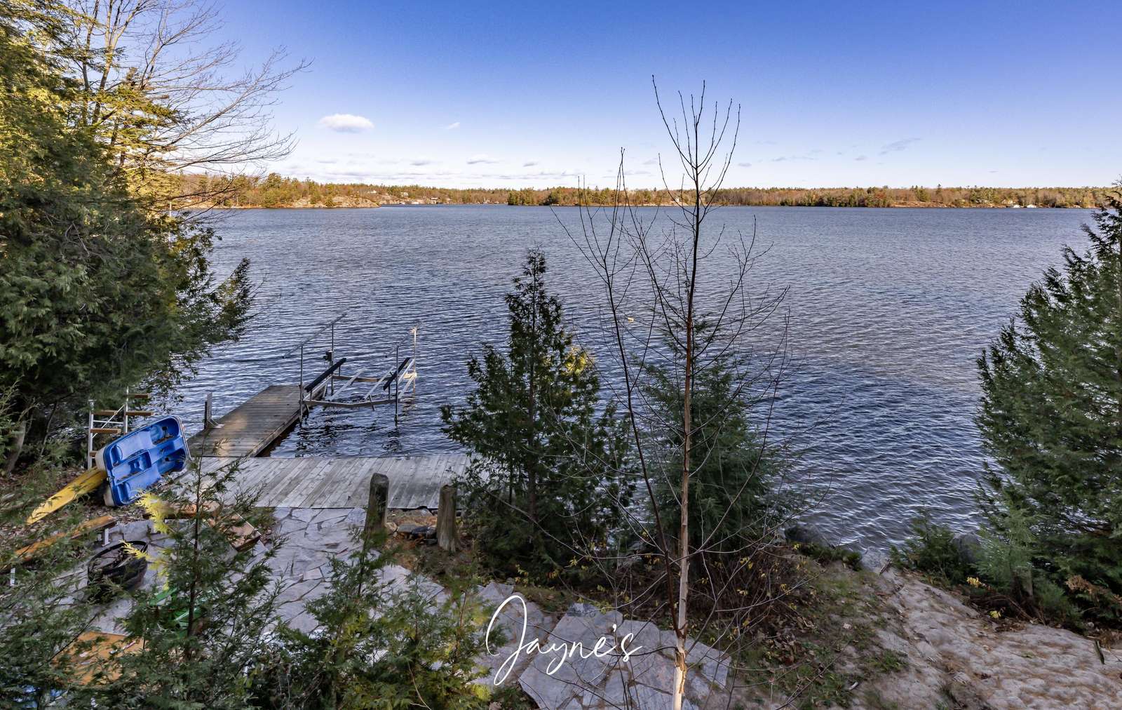 COMFORT ZONE - This exquisite four-bedroom, three-bathroom main cottage features a thoughtfully designed open concept layout that seamlessly integrates living spaces while enhancing the sense of spaciousness. The inviting loft area serves as an ideal retreat for relaxation or recreational activities. An expansive upper deck provides breathtaking views, while the charming patio is complemented by a luxurious hot tub, perfect for unwinding after a day of outdoor adventures. A brief stroll leads to the waterfront, where residents can indulge in various water sports and utilize the convenient boat lift for docking. Additionally, the two-storey bunkie offers a multifunctional space, complete with a kitchenette, a cozy living area equipped with a fireplace, a bedroom, and a loft area, making it an excellent accommodation for guests. For further enjoyment, a well-appointed rec room resides below, ensuring ample opportunities for entertainment and leisure.