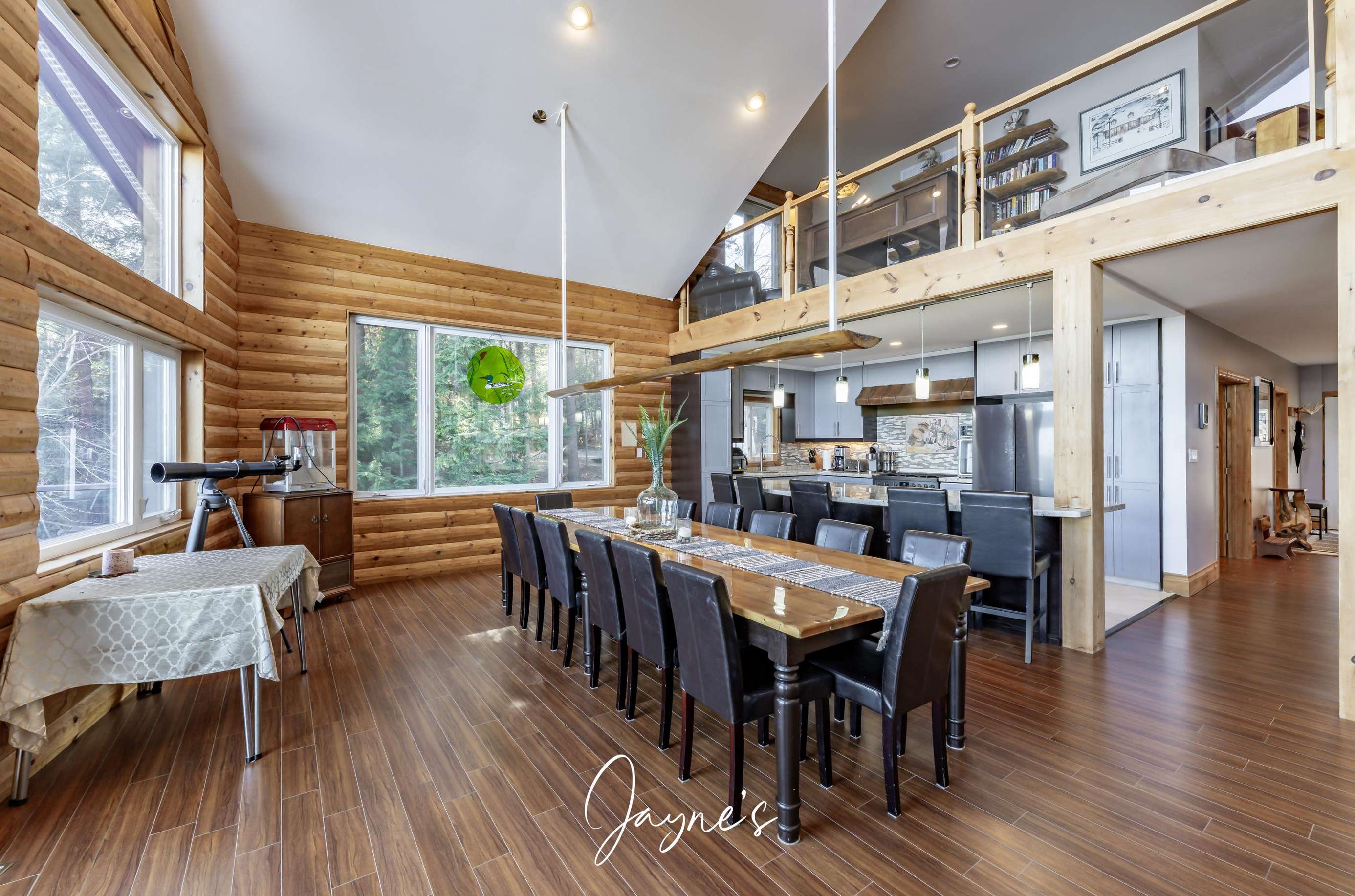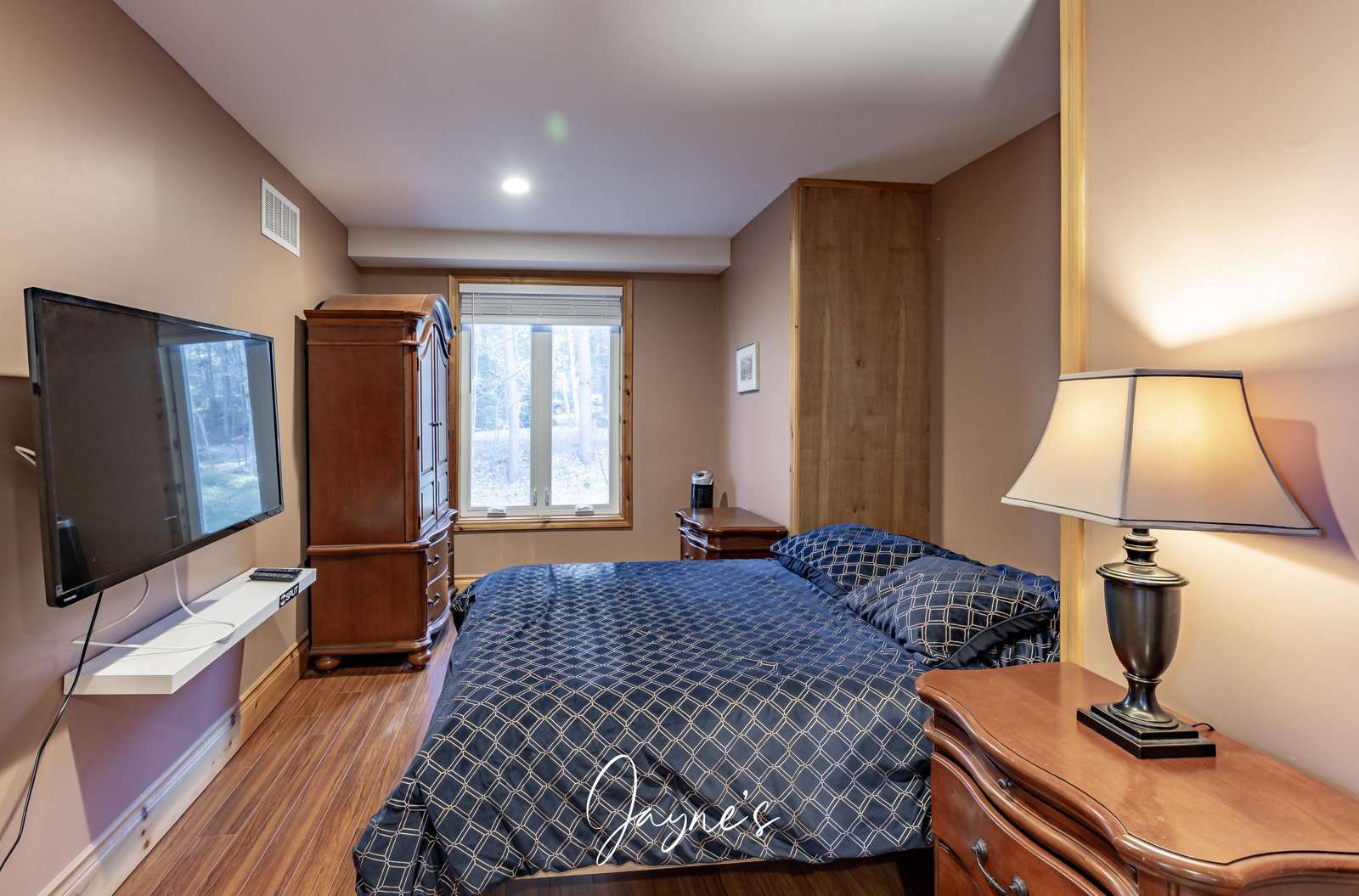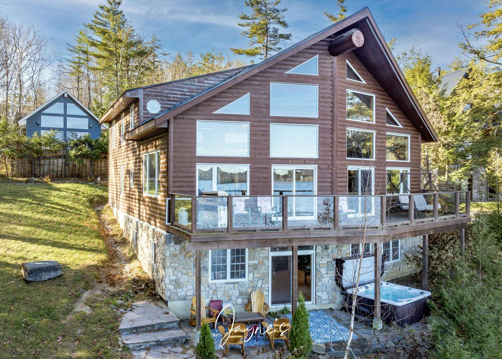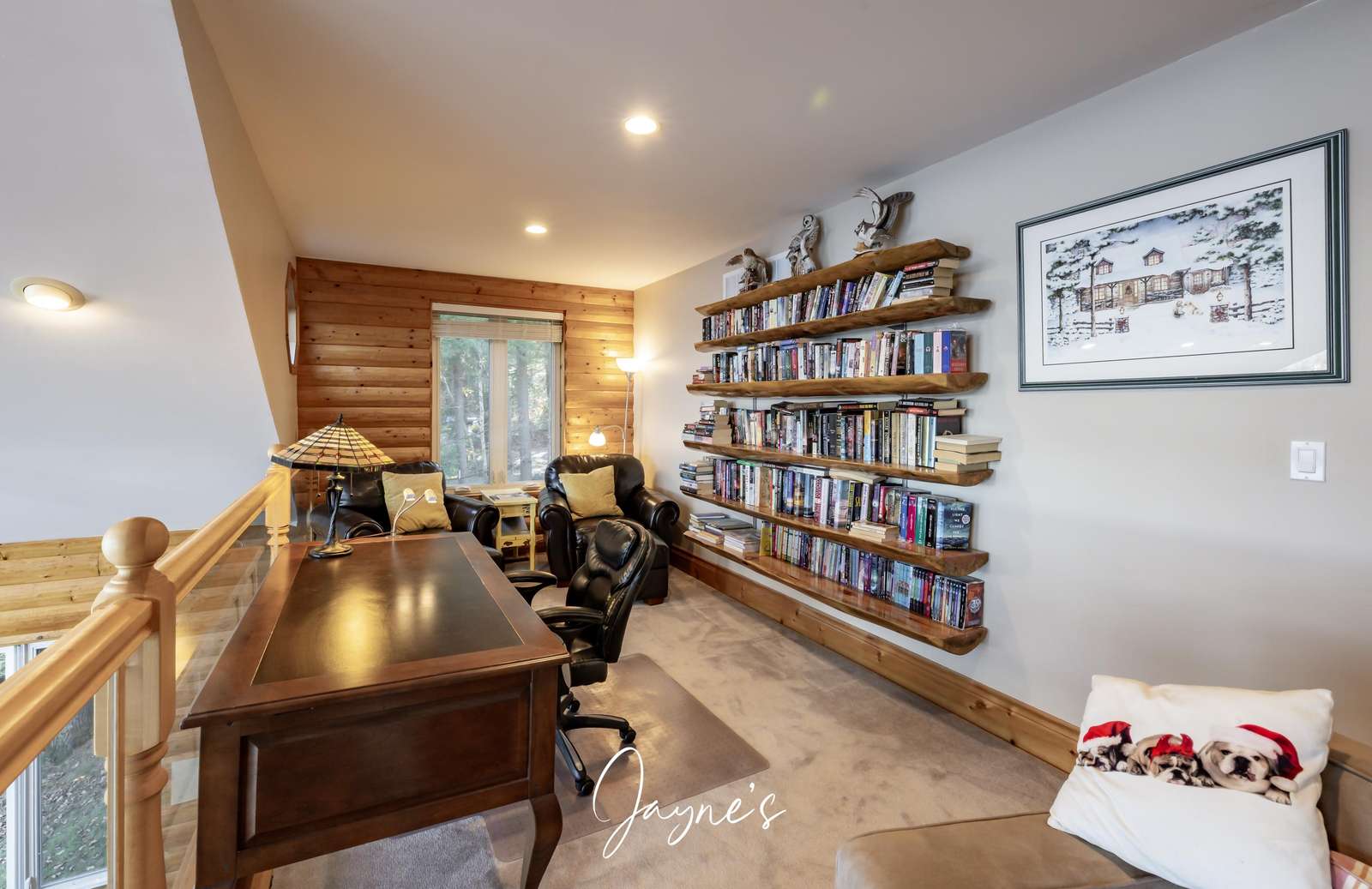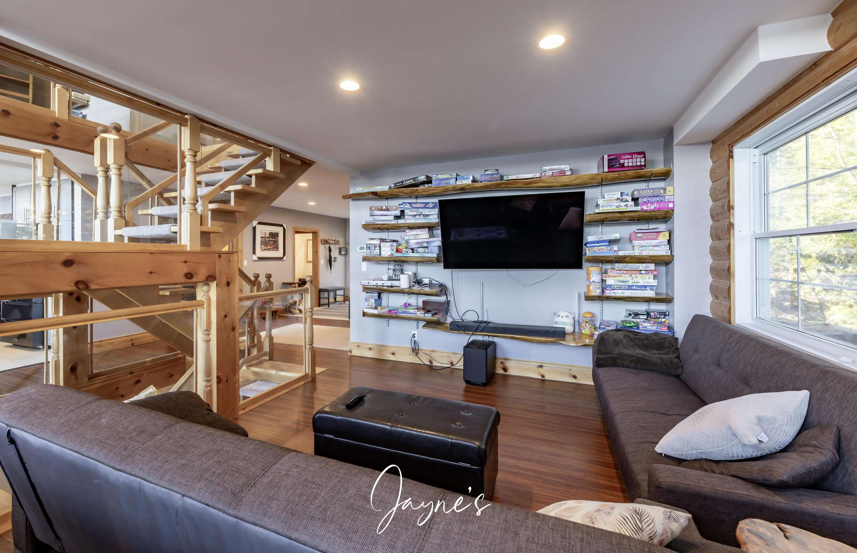 COMFORT ZONE - This exquisite four-bedroom, three-bathroom main cottage features a thoughtfully designed open concept layout that seamlessly integrates living spaces while enhancing the sense of spaciousness. The inviting loft area serves as an ideal retreat for relaxation or recreational activities. An expansive upper deck provides breathtaking views, while the charming patio is complemented by a luxurious hot tub, perfect for unwinding after a day of outdoor adventures. A brief stroll leads to the waterfront, where residents can indulge in various water sports and utilize the convenient boat lift for docking. Additionally, the two-storey bunkie offers a multifunctional space, complete with a kitchenette, a cozy living area equipped with a fireplace, a bedroom, and a loft area, making it an excellent accommodation for guests. For further enjoyment, a well-appointed rec room resides below, ensuring ample opportunities for entertainment and leisure.