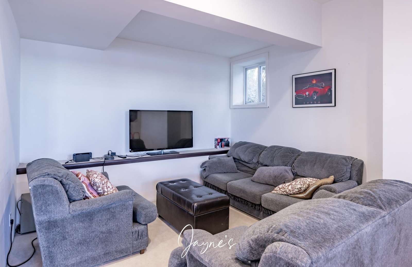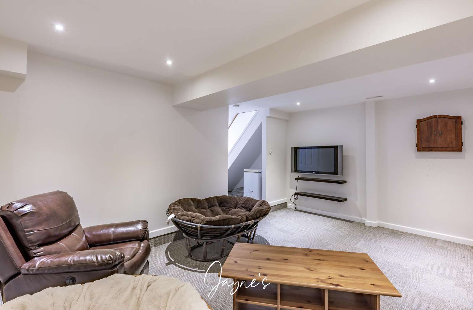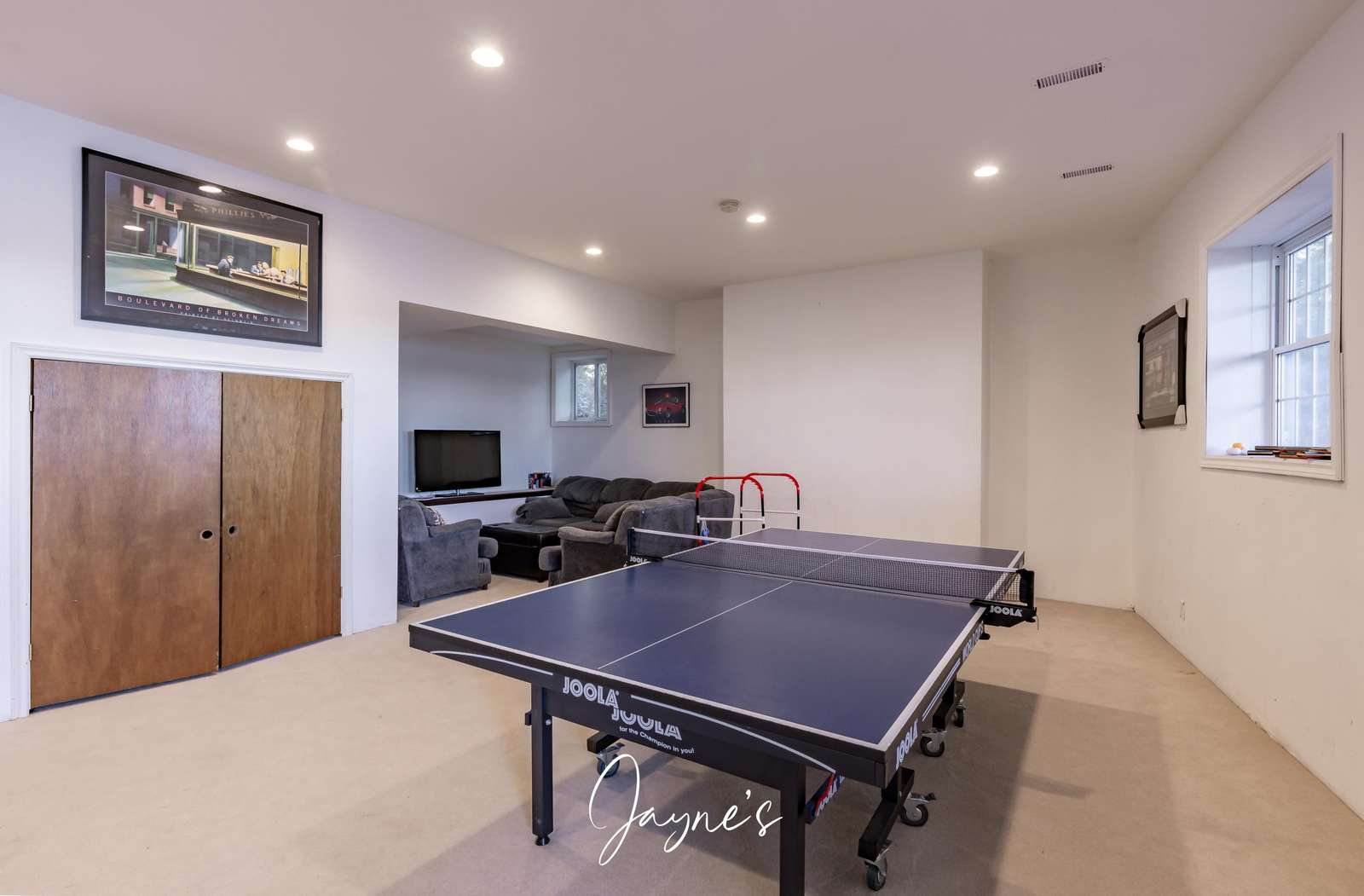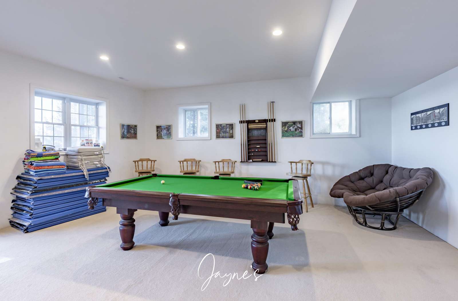 Large games area with pool table, ping pong table, gym mats and karaoke machine, media area with 3 seater sofa, loveseat, chair, TV and Nintendo switch