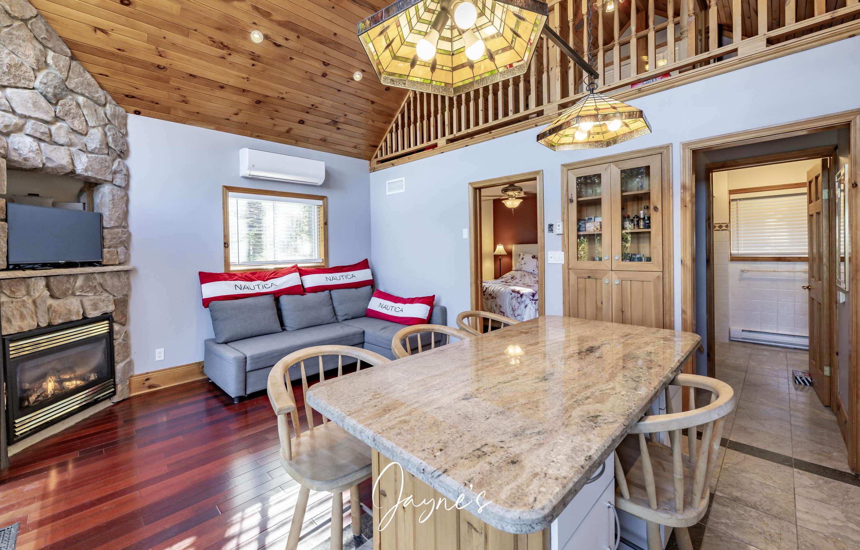 Bright with L-shaped sofa and trundle, TV, gas fireplace and walkout to deck
