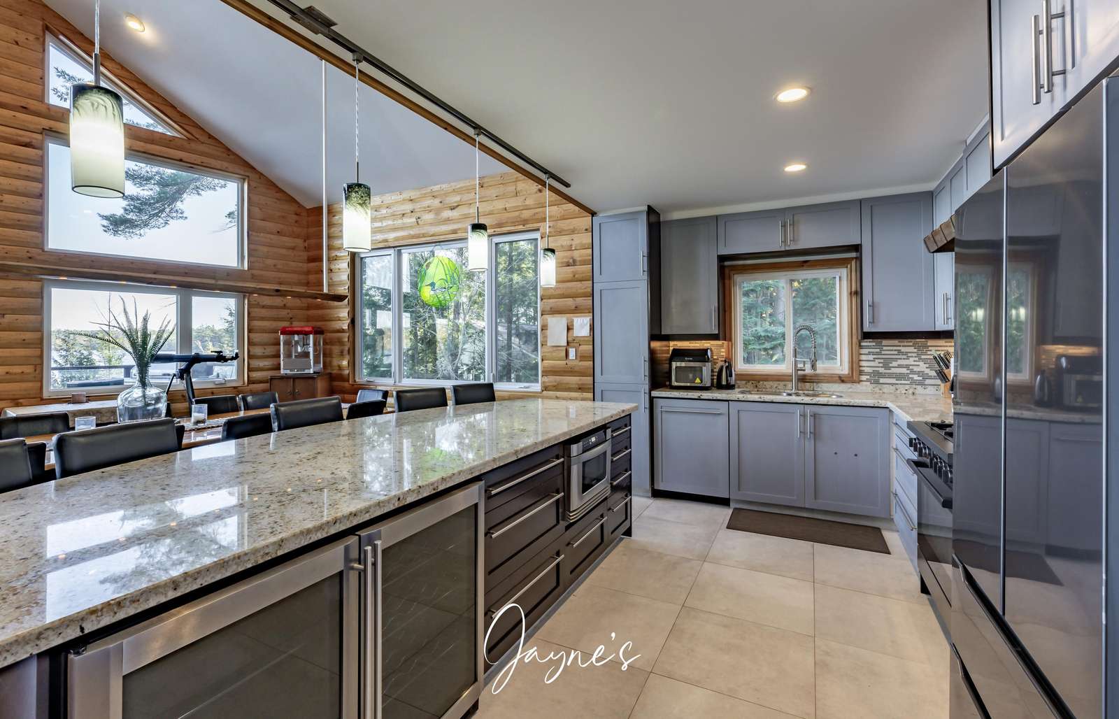 Expansive open concept with high end appliances, gas stove, beverage fridge and an island with seating for 5