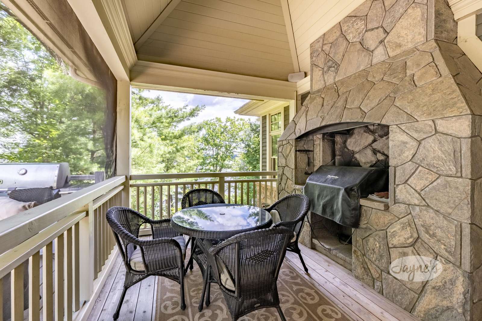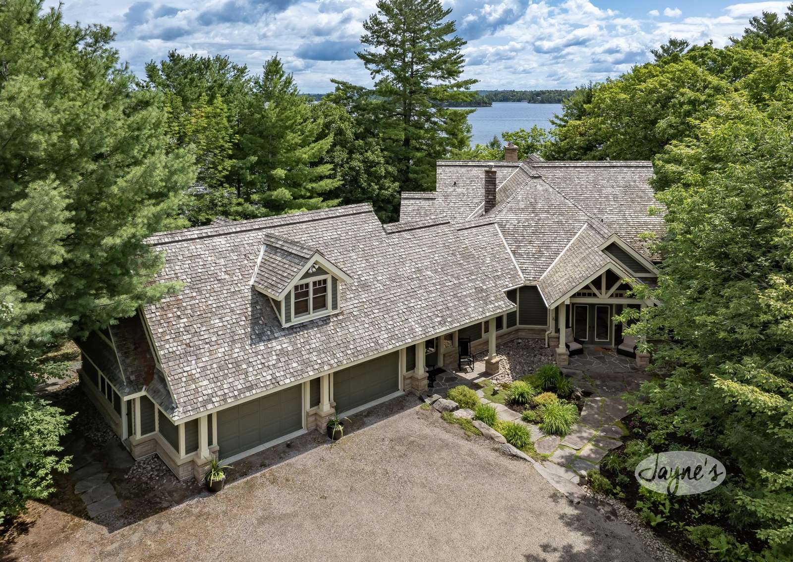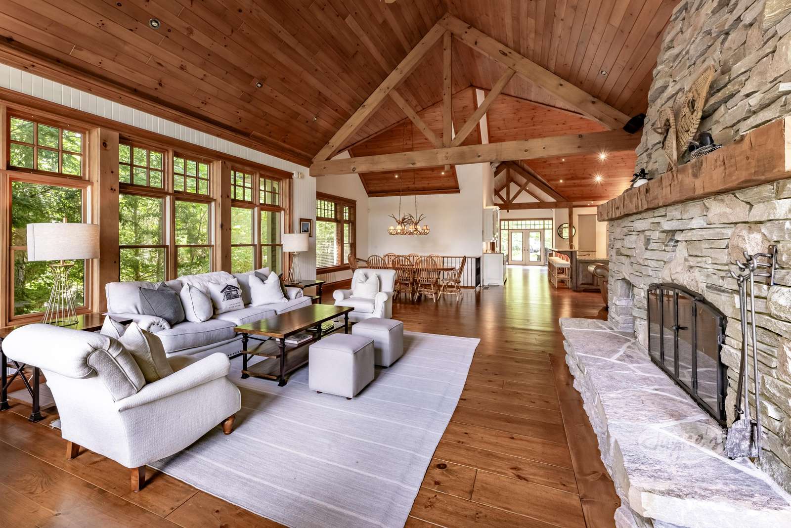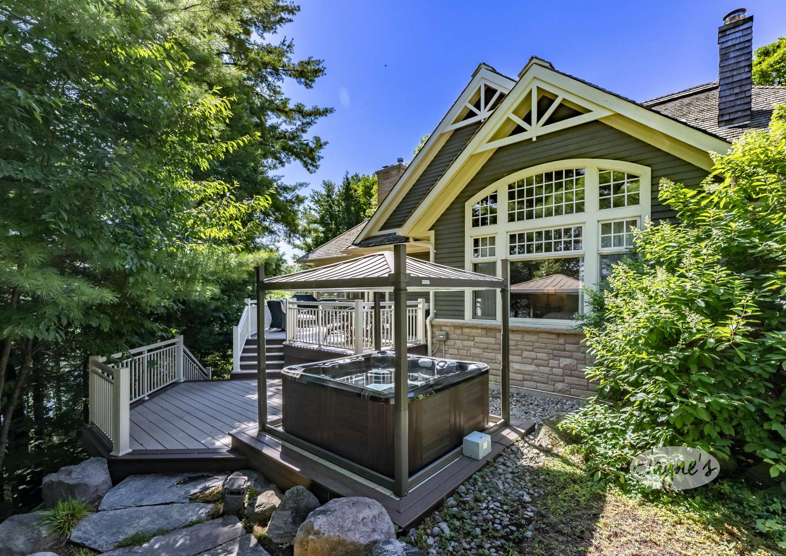 The custom build has soaring cathedral ceilings, huge open concept main floor with long island with bar stools, large Great Room around stone fireplace with lake views and smaller second sitting area for TV viewing. Kitchen has top of the line appliances with 4 burner Thermidor stove with griddle, Sub-Zero panel refrigerator/freezer. Behind fireplace is Muskoka Room leading out to deck overlooking hot tub below. Main floor has Master with ensuite as well as Queen Bedroom with ensuite.