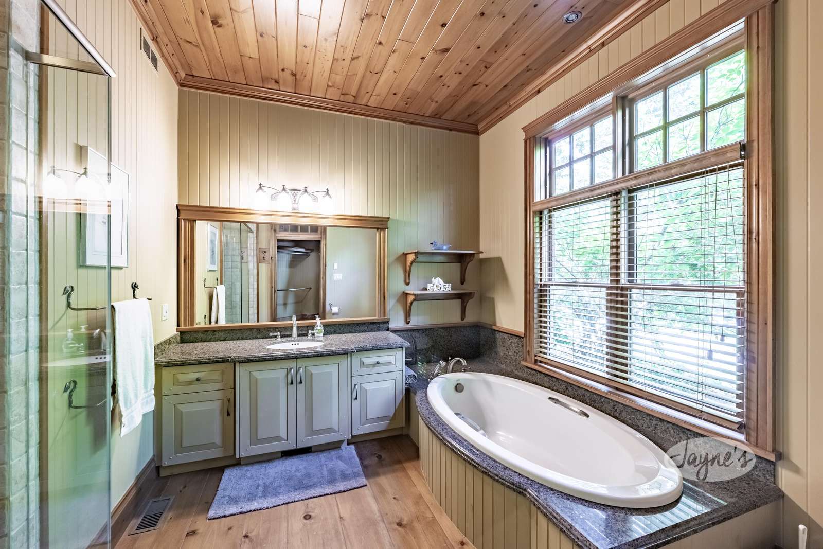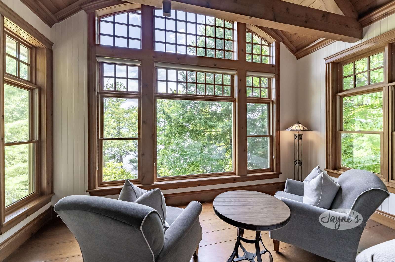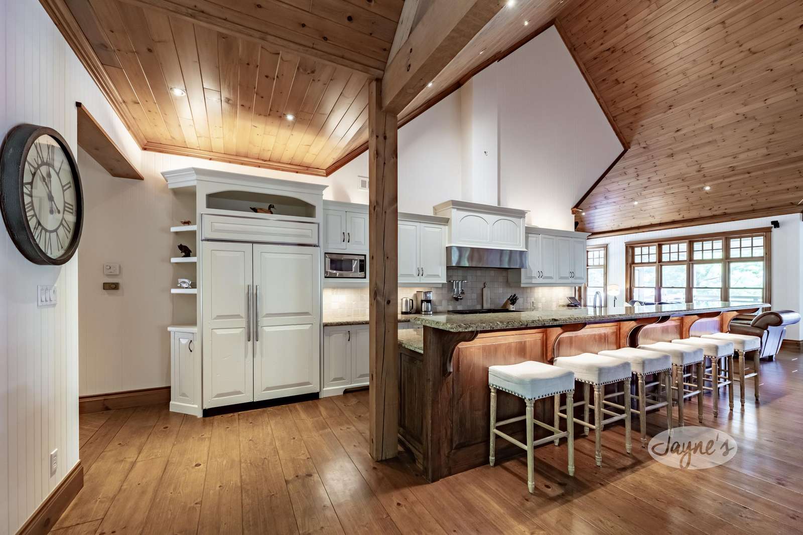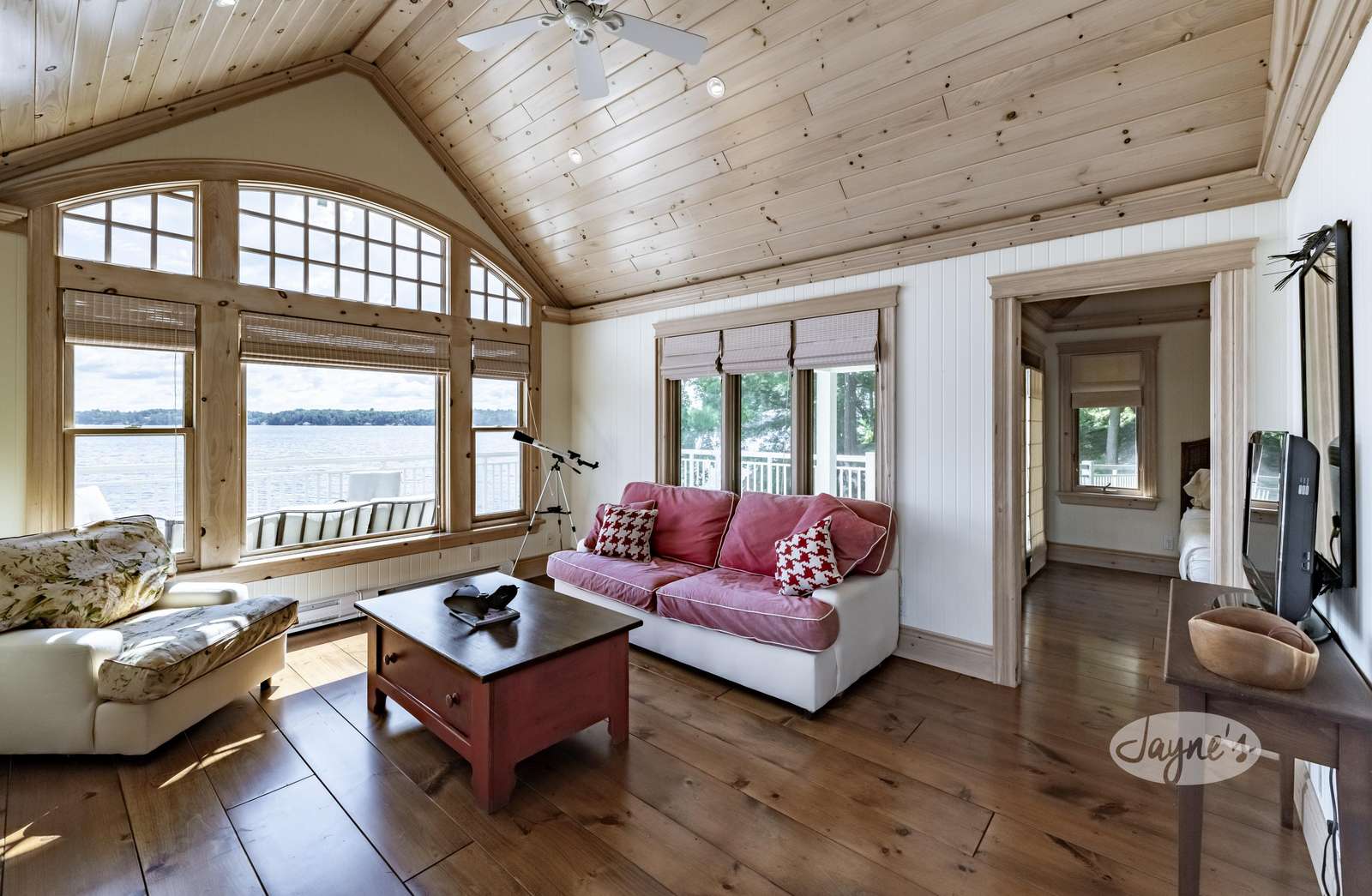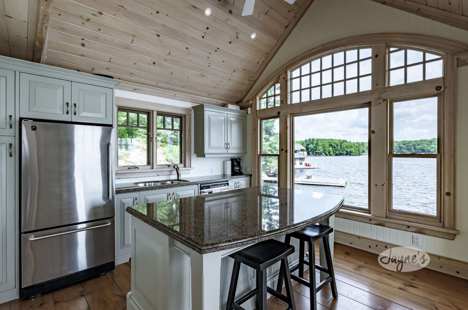 The custom build has soaring cathedral ceilings, huge open concept main floor with long island with bar stools, large Great Room around stone fireplace with lake views and smaller second sitting area for TV viewing. Kitchen has top of the line appliances with 4 burner Thermidor stove with griddle, Sub-Zero panel refrigerator/freezer. Behind fireplace is Muskoka Room leading out to deck overlooking hot tub below. Main floor has Master with ensuite as well as Queen Bedroom with ensuite.