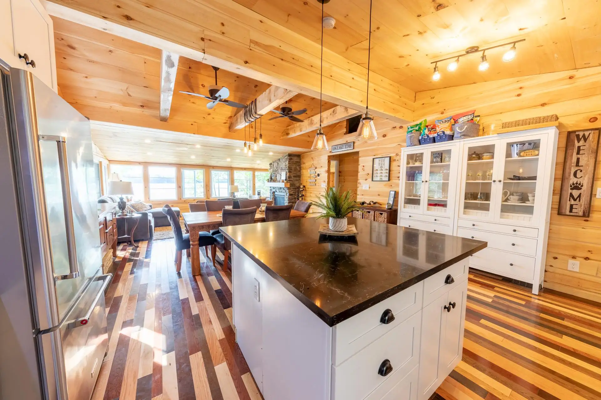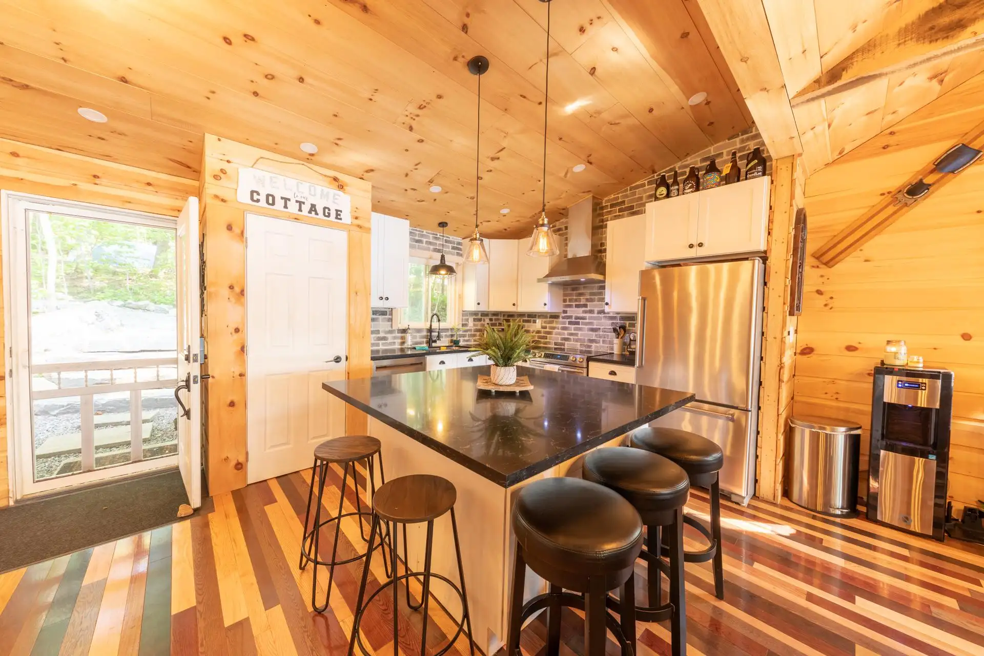 This 3 bedroom, 1 bathroom cottage is the perfect destination for an intimate getaway. Welcomed by an open-concept floor plan, you enter into the kitchen which is equipped with new appliances and a square island, with seating for 5. Transition into the dining area, framed by wooden beams and accommodates 6 comfortably. Off to the right, you will find 2 bedrooms equipped with queen beds and another room with a king. Wake-up to stunning views of the lake from your king bed!! In the living room enjoy those same panoramic view from your couch while the gas fireplace flickers away.