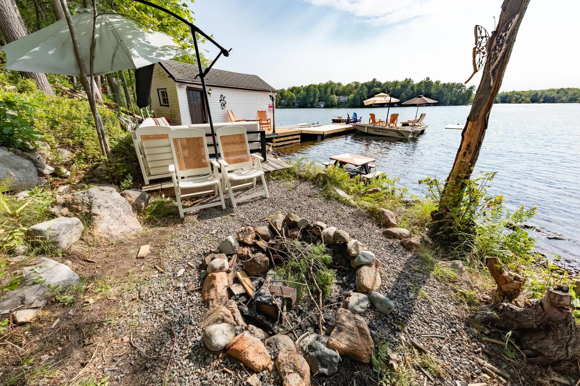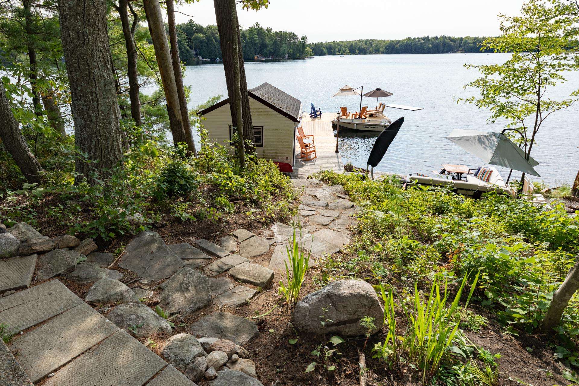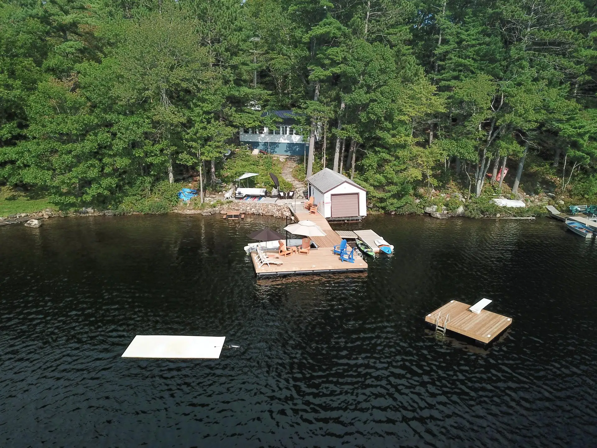 DEJA BLUE is perched up above water level on gently sloping land, surrounded by tall towering trees and green vegetation. From the driveway, the main cottage is situated a few short steps down a stone path to the Main Cottage. Follow another stoney path that wraps around the right side of the main cottage, and down stairs to the rocky shoreline. Here guests will find an outdoor living area equipped with 2 umbrellas, a couch and wicker chair set! The L-shaped dock offers plenty of boat parking and areas to relax. 2 loungers and 4 Muskoka chairs can be used to enjoy the view from under the shade of a large umbrella. Deep water off the end of the dock allows for diving and swimming out to the floating platform! Swim back to shore and bask in the all day sun while enjoying a drink from the swim-up table. End your day encircled around the shoreline fire pit while watching the sun set along the horizon!