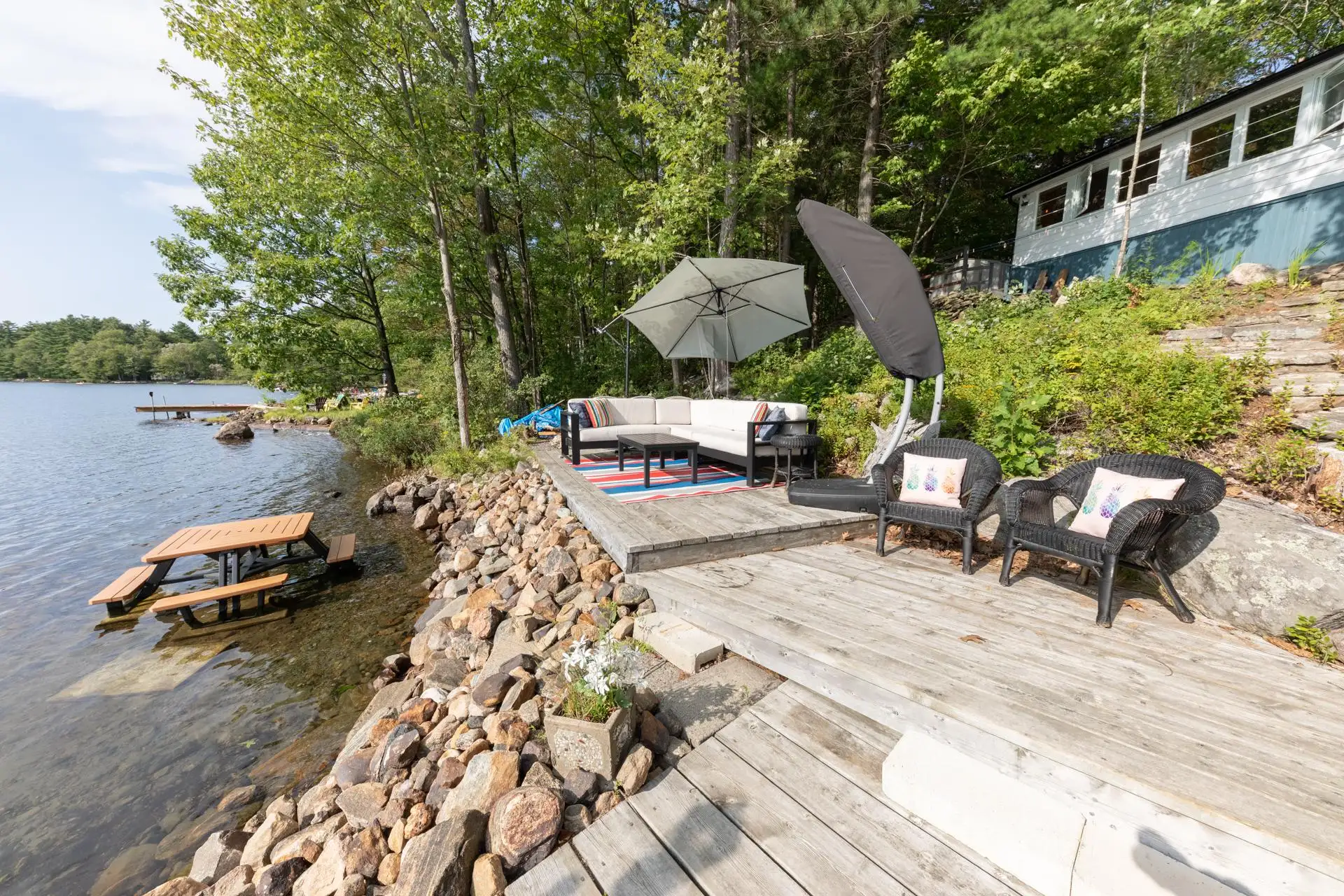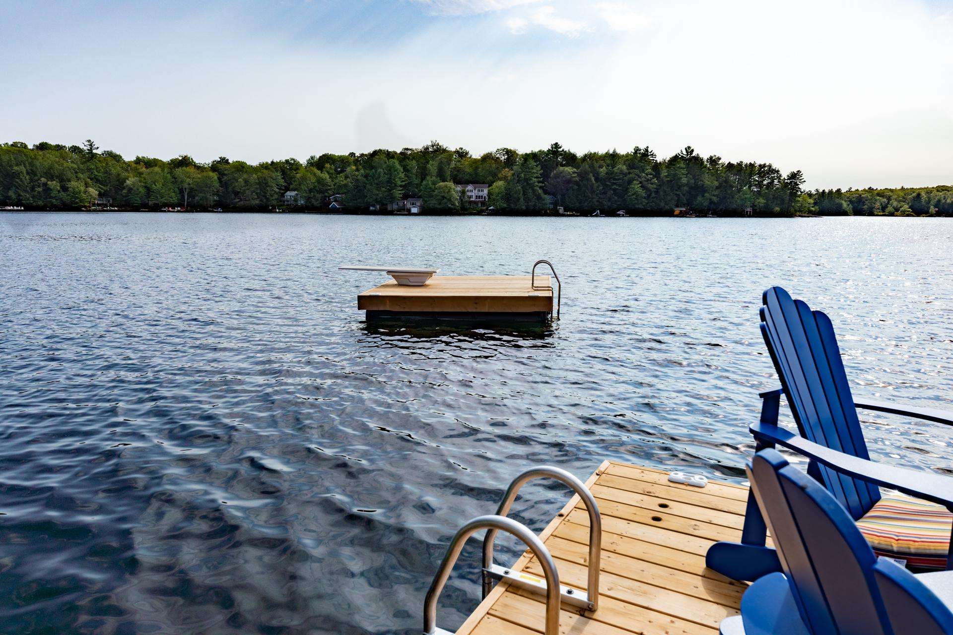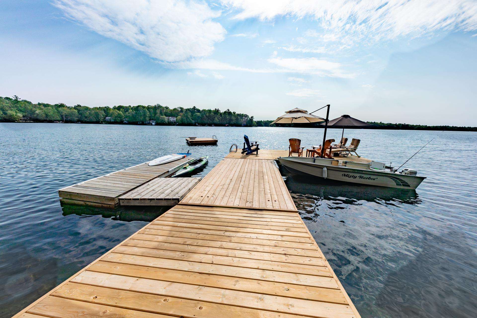 DEJA BLUE is perched up above water level on gently sloping land, surrounded by tall towering trees and green vegetation. From the driveway, the main cottage is situated a few short steps down a stone path to the Main Cottage. Follow another stoney path that wraps around the right side of the main cottage, and down stairs to the rocky shoreline. Here guests will find an outdoor living area equipped with 2 umbrellas, a couch and wicker chair set! The L-shaped dock offers plenty of boat parking and areas to relax. 2 loungers and 4 Muskoka chairs can be used to enjoy the view from under the shade of a large umbrella. Deep water off the end of the dock allows for diving and swimming out to the floating platform! Swim back to shore and bask in the all day sun while enjoying a drink from the swim-up table. End your day encircled around the shoreline fire pit while watching the sun set along the horizon!