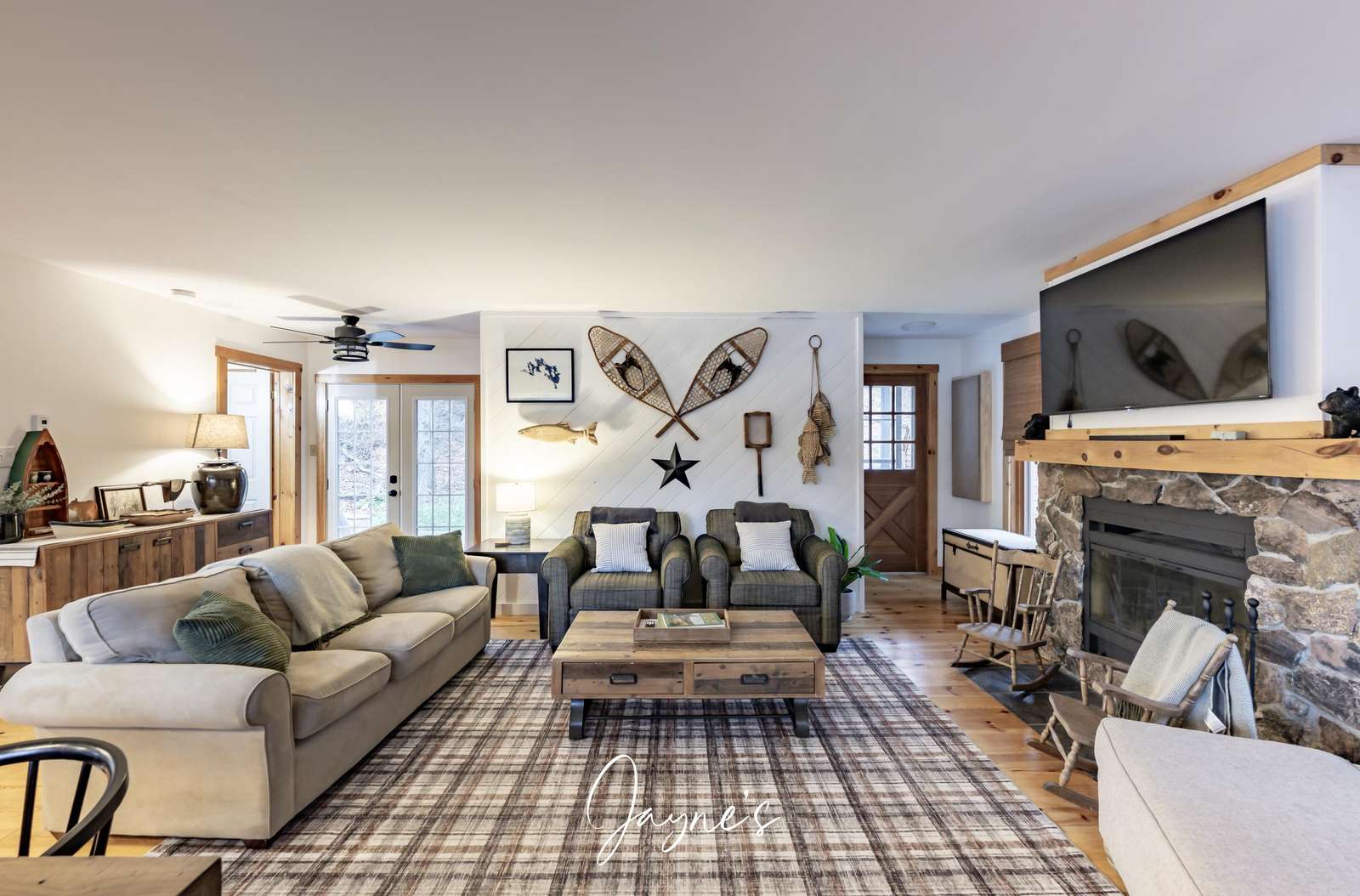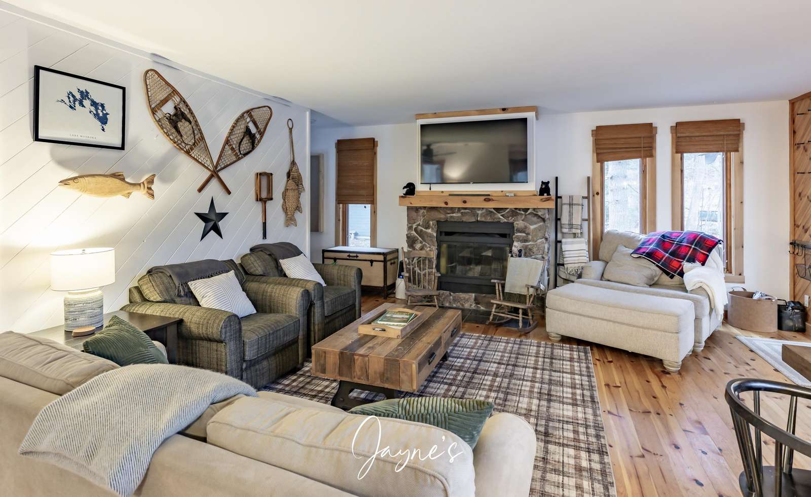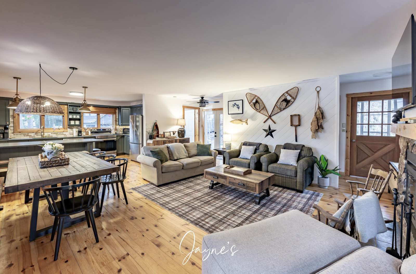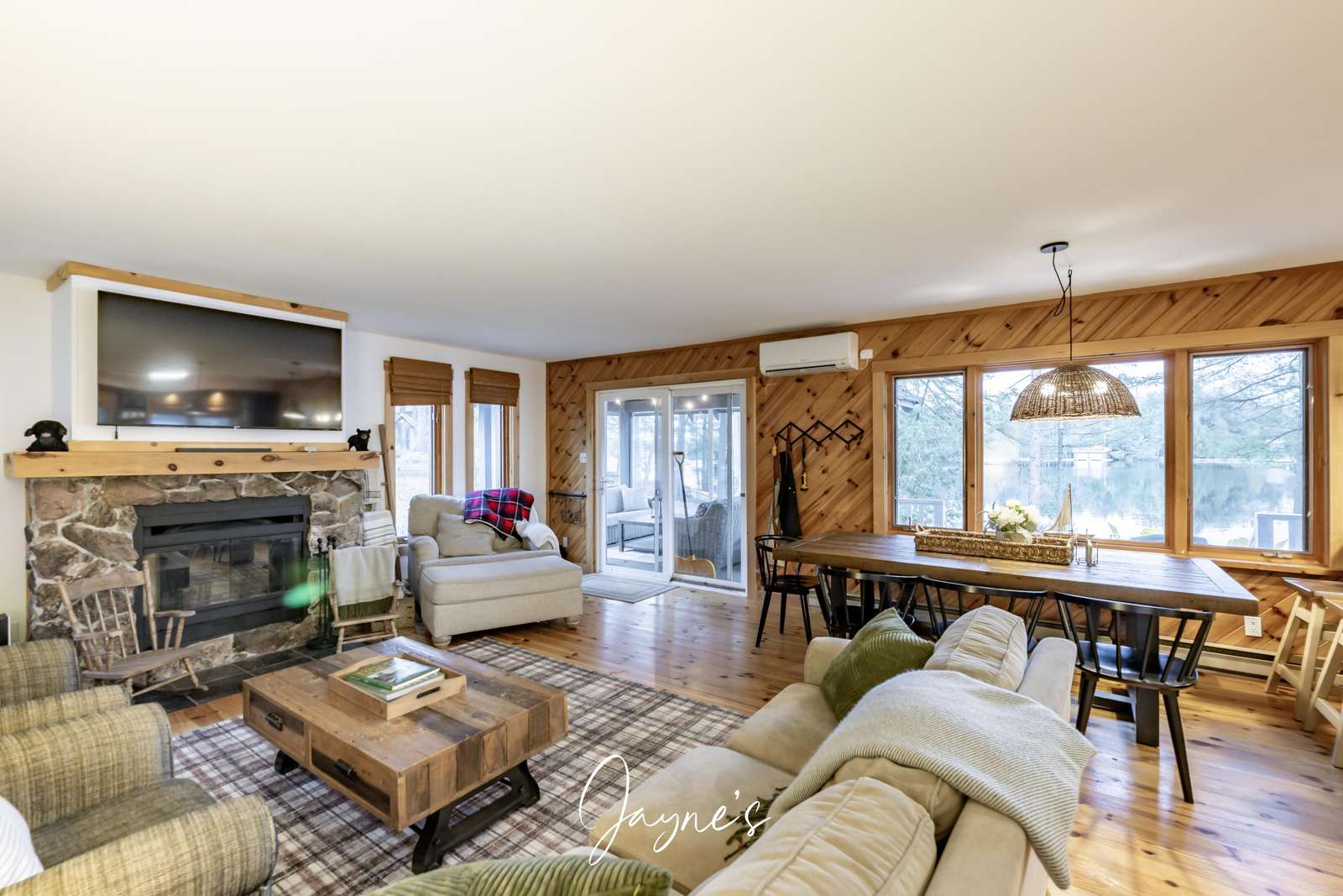 Spacious with a 3-seater sofa, two chairs, double wide chair, wood fireplace, TV and walkout to Muskoka room