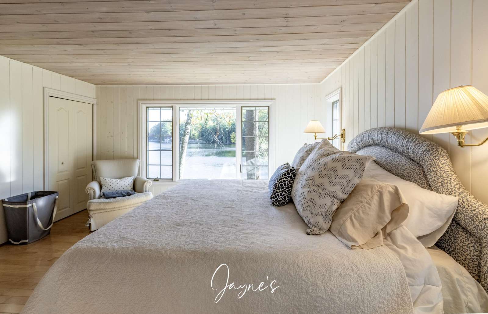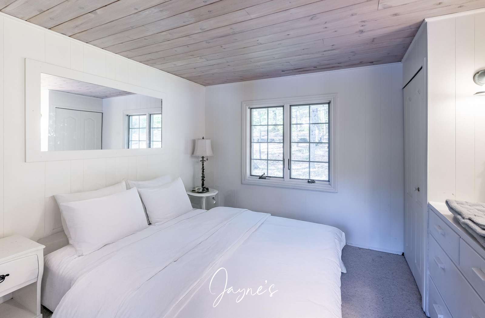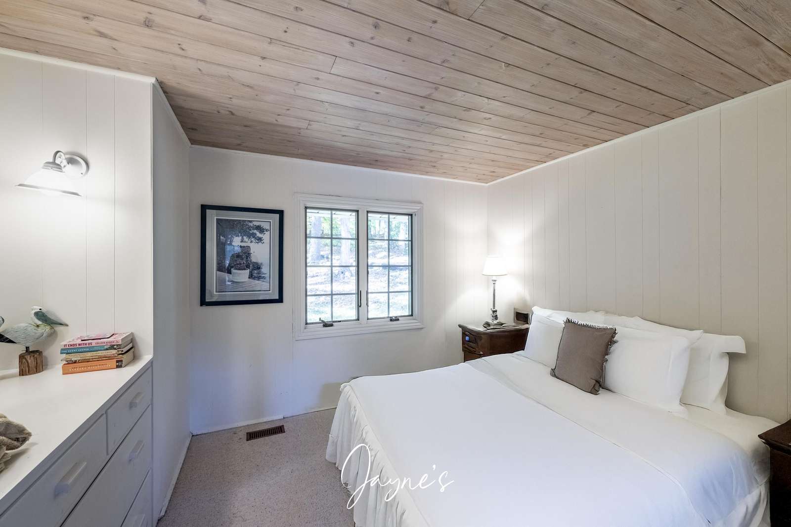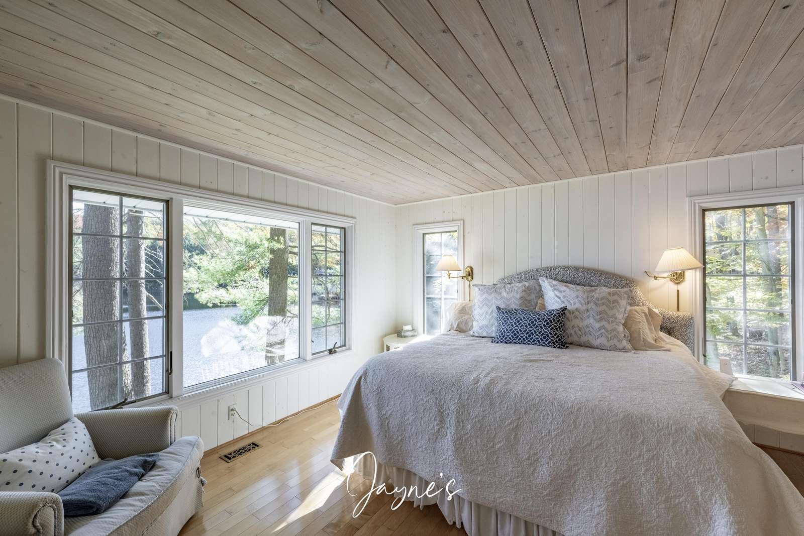 With two fireplaces, whitewashed wood-paneled walls, a 300 sq. ft. screened-in Muskoka Room and elegant wood beam ceilings, East Bay Charm feels quintessentially Muskokan. Featuring a bright, open concept eat-in kitchen with plenty of counter space, a centre island and 3 bar stools, along with a spacious dining area and table that seats 8. Also located on the main floor is the living room, which provides another great space for families and large groups to congregate. This room comes equipped with a wood-burning fireplace, comfortable seating, and large windows overlooking the lake. Alternatively, the oversized Muskoka Room is perfect for those hot summer nights. 300 sq. ft. in size, this screened-in room is impeccably furnished and offers unbeatable views of Lake Muskoka. There are four bedrooms located on the main floor of the cottage: 1 Double bedroom, 1 King bedroom with ensuite, and 2 Queen bedrooms. Two bathrooms are located on this floor, including a 3-piece Master ensuite, and a shared 3-piece bathroom.
