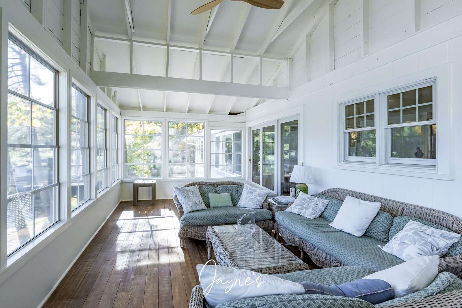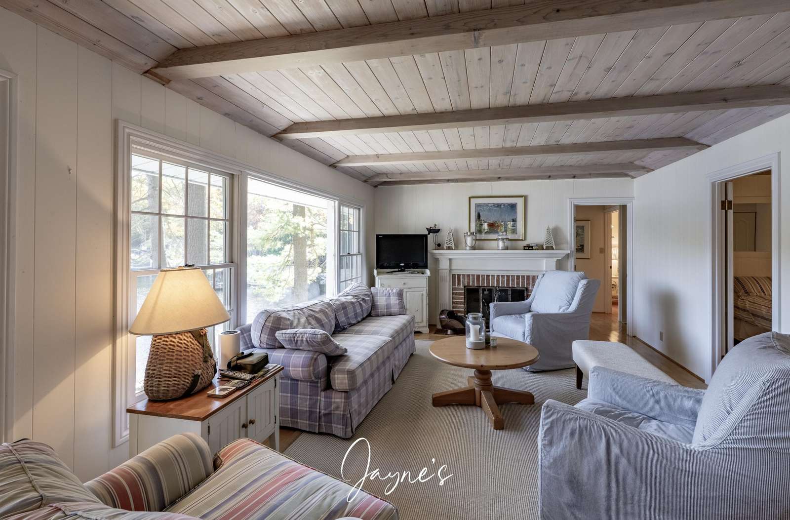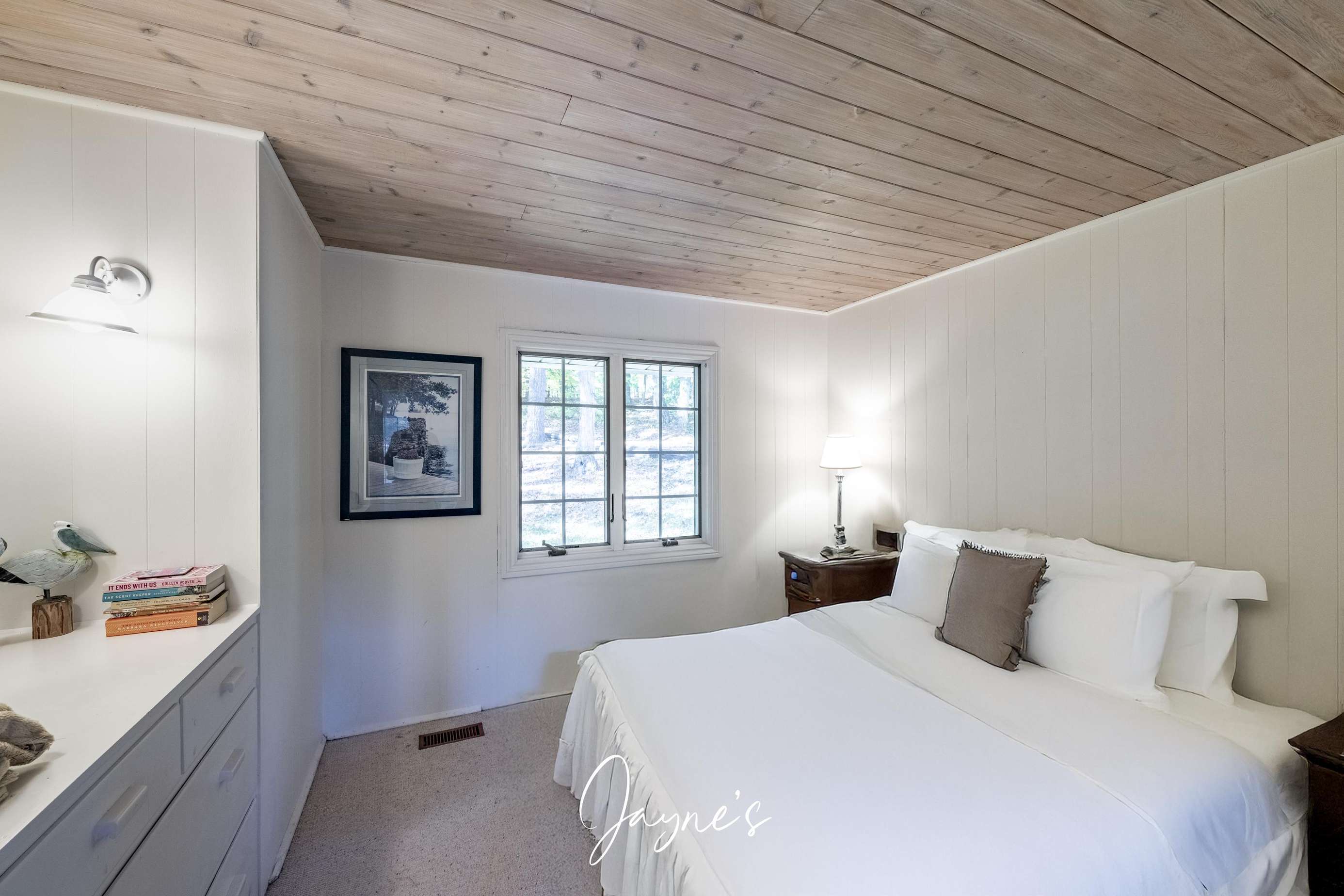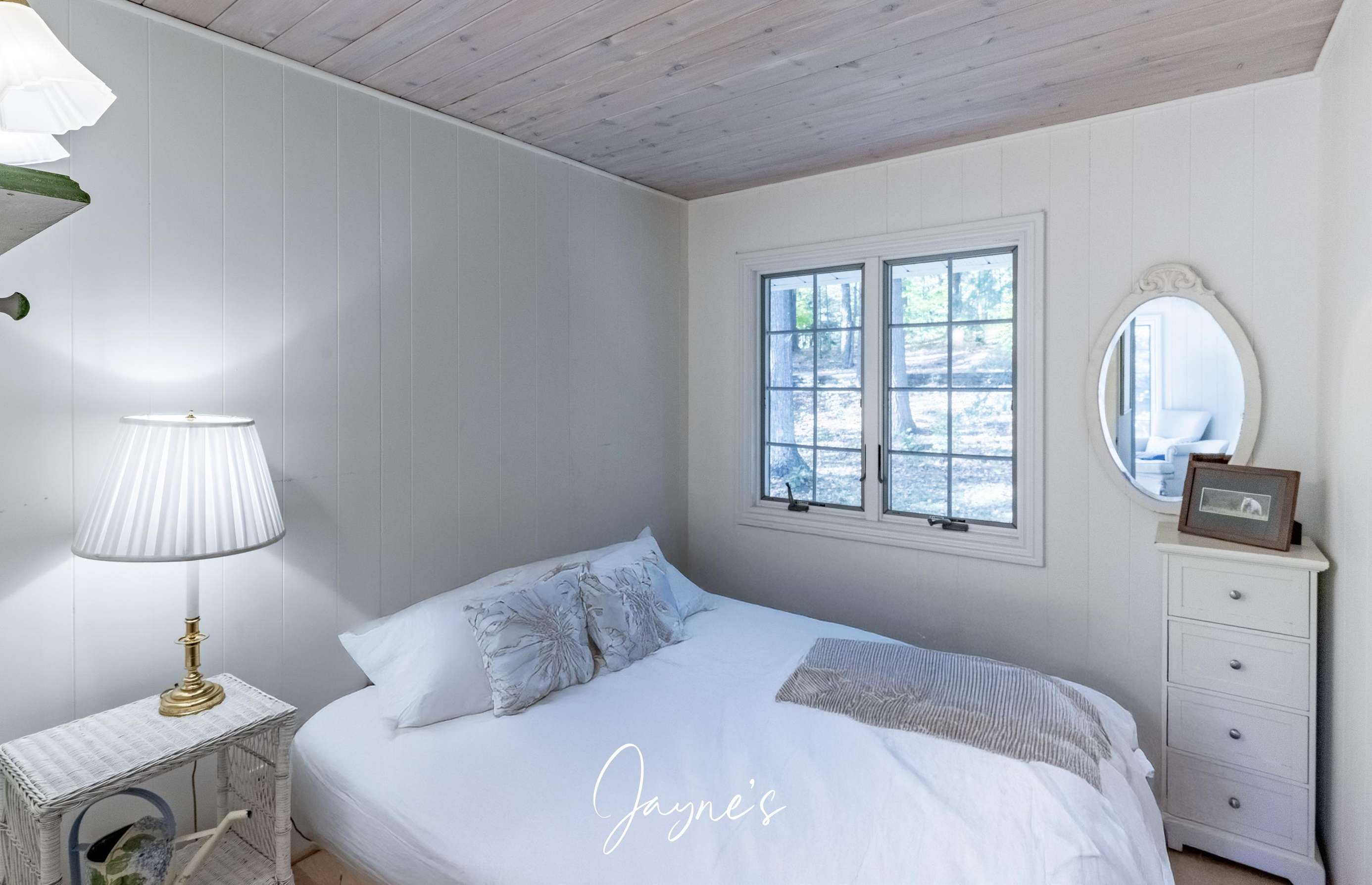 With two fireplaces, whitewashed wood-paneled walls, a 300 sq. ft. screened-in Muskoka Room and elegant wood beam ceilings, East Bay Charm feels quintessentially Muskokan. Featuring a bright, open concept eat-in kitchen with plenty of counter space, a centre island and 3 bar stools, along with a spacious dining area and table that seats 8. Also located on the main floor is the living room, which provides another great space for families and large groups to congregate. This room comes equipped with a wood-burning fireplace, comfortable seating, and large windows overlooking the lake. Alternatively, the oversized Muskoka Room is perfect for those hot summer nights. 300 sq. ft. in size, this screened-in room is impeccably furnished and offers unbeatable views of Lake Muskoka. There are four bedrooms located on the main floor of the cottage: 1 Double bedroom, 1 King bedroom with ensuite, and 2 Queen bedrooms. Two bathrooms are located on this floor, including a 3-piece Master ensuite, and a shared 3-piece bathroom.