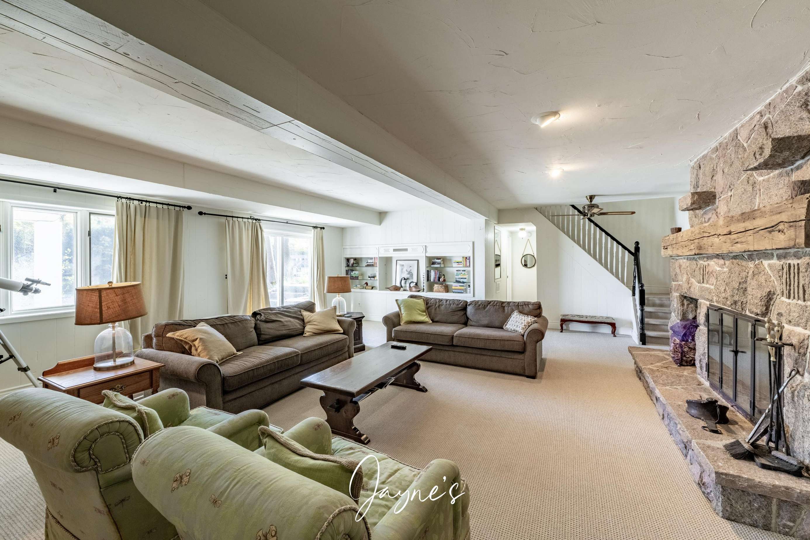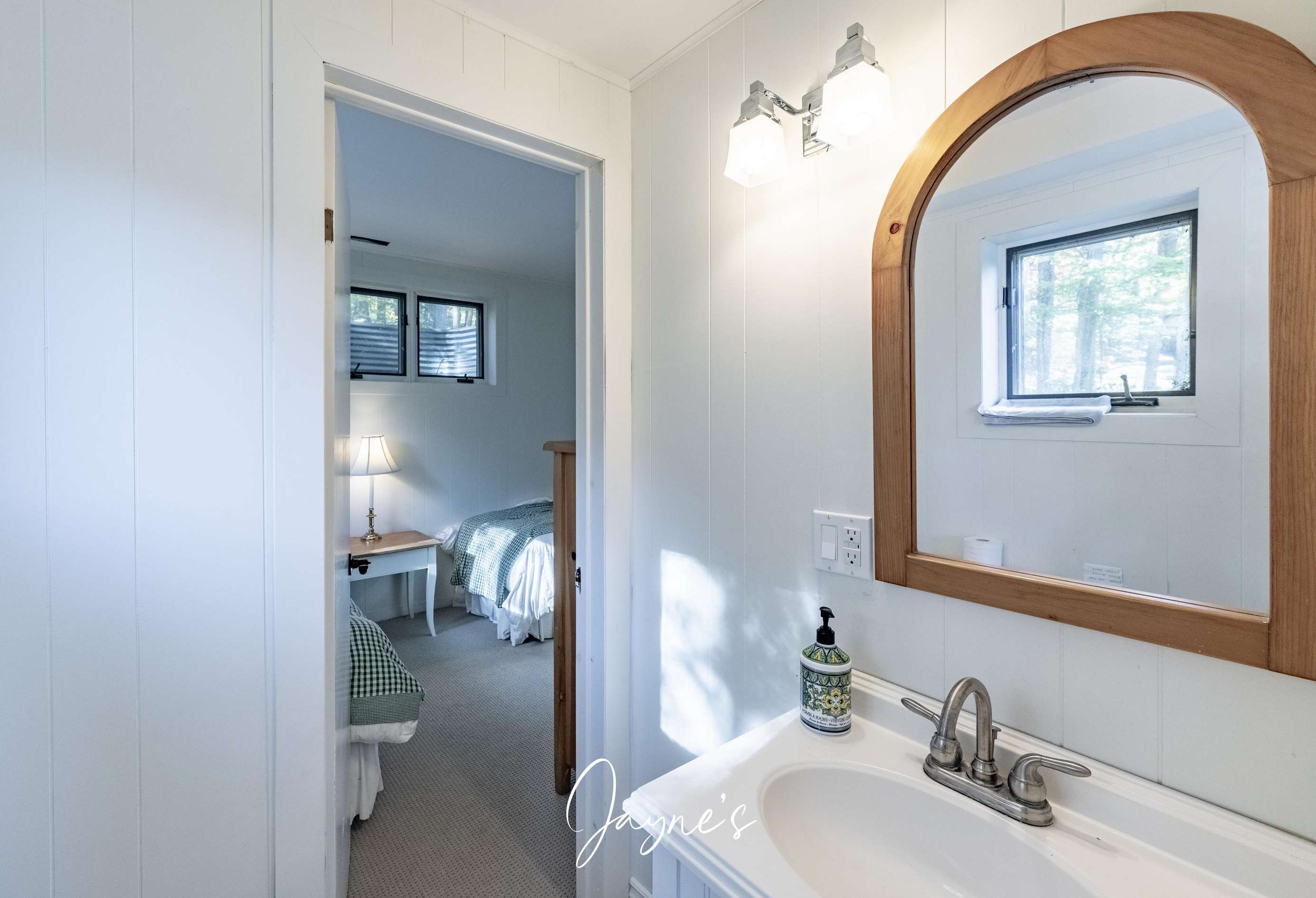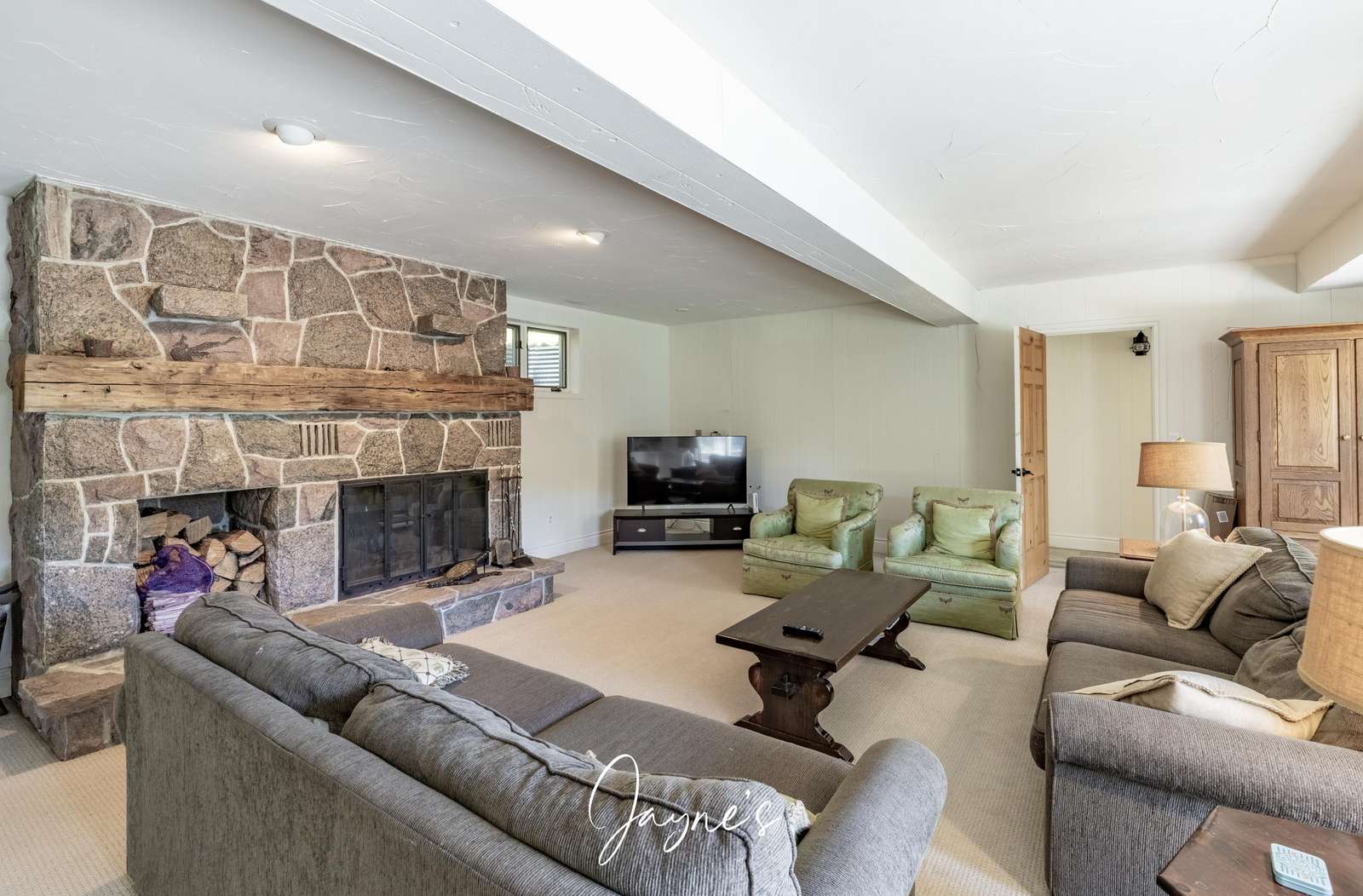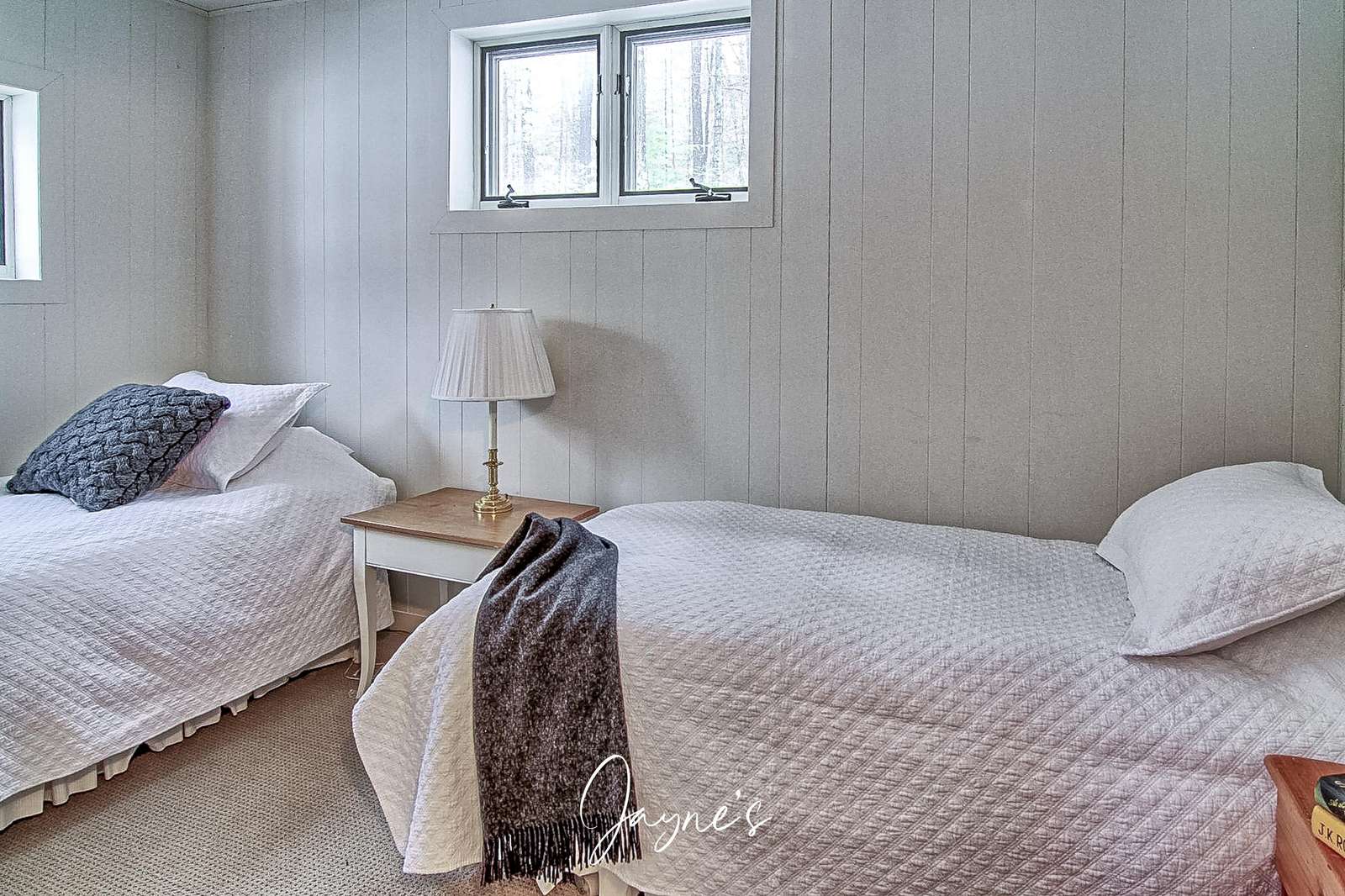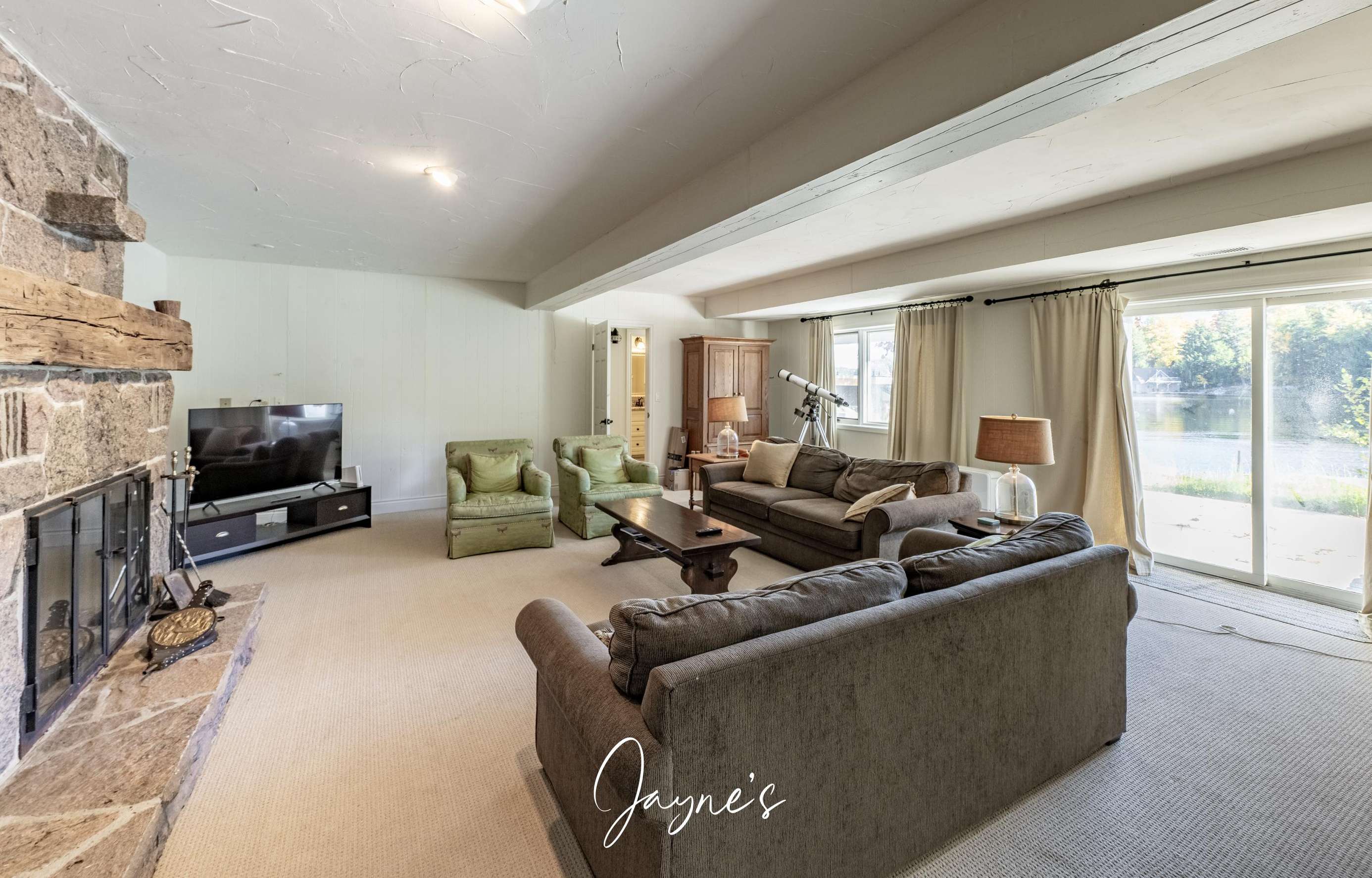 There is a large family room located on the lower level of the cottage, featuring an oversized stone fireplace, comfortable seating, a flat-screen TV, and sliding doors to outside. The two remaining bedrooms can be found on the lower level of the cottage, as well as a Jack and Jill bathroom and a 3-piece bathroom. There is 1 King bedroom, and one room with 2 twin beds. There is covered seating outside the lower level walkout.