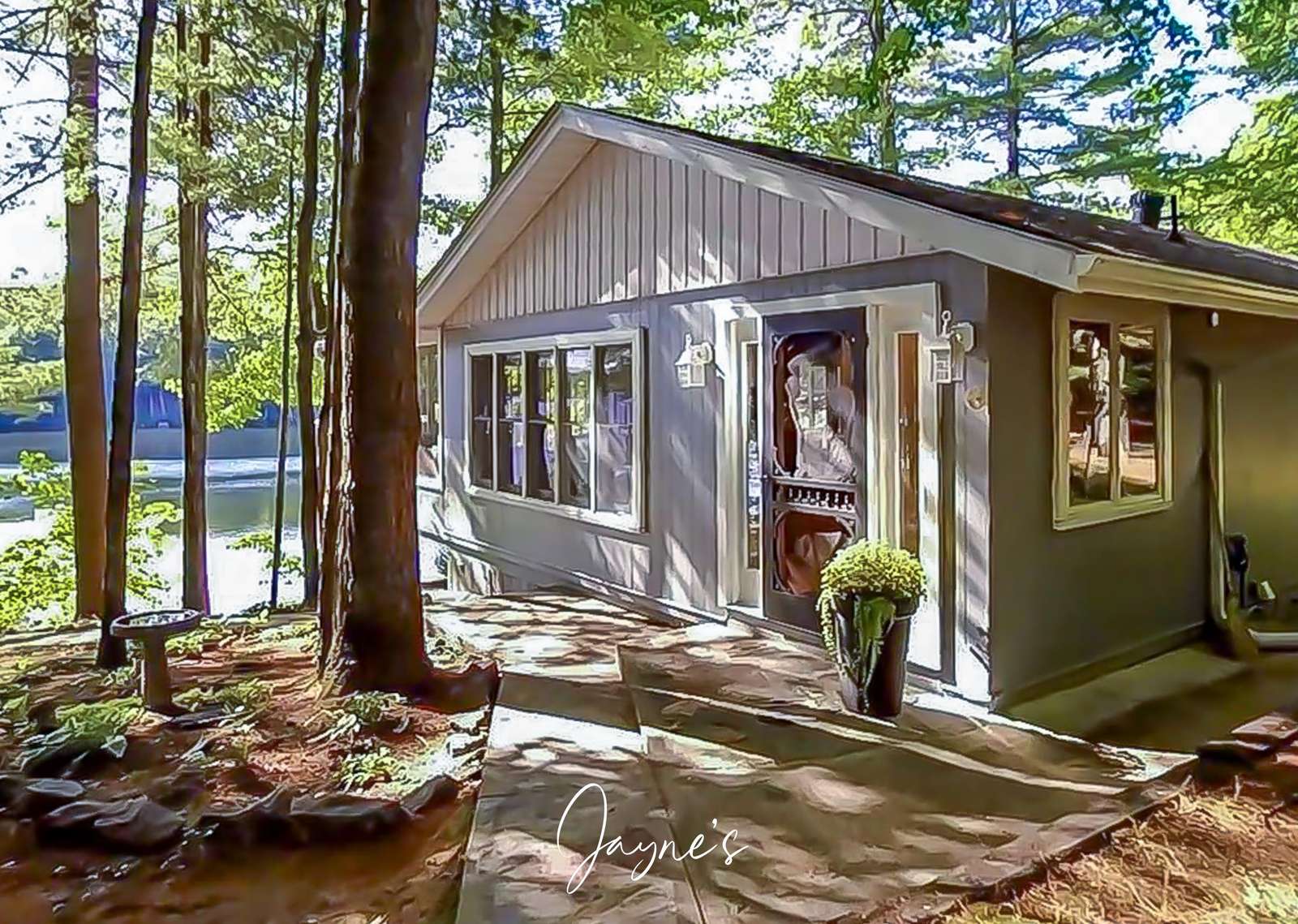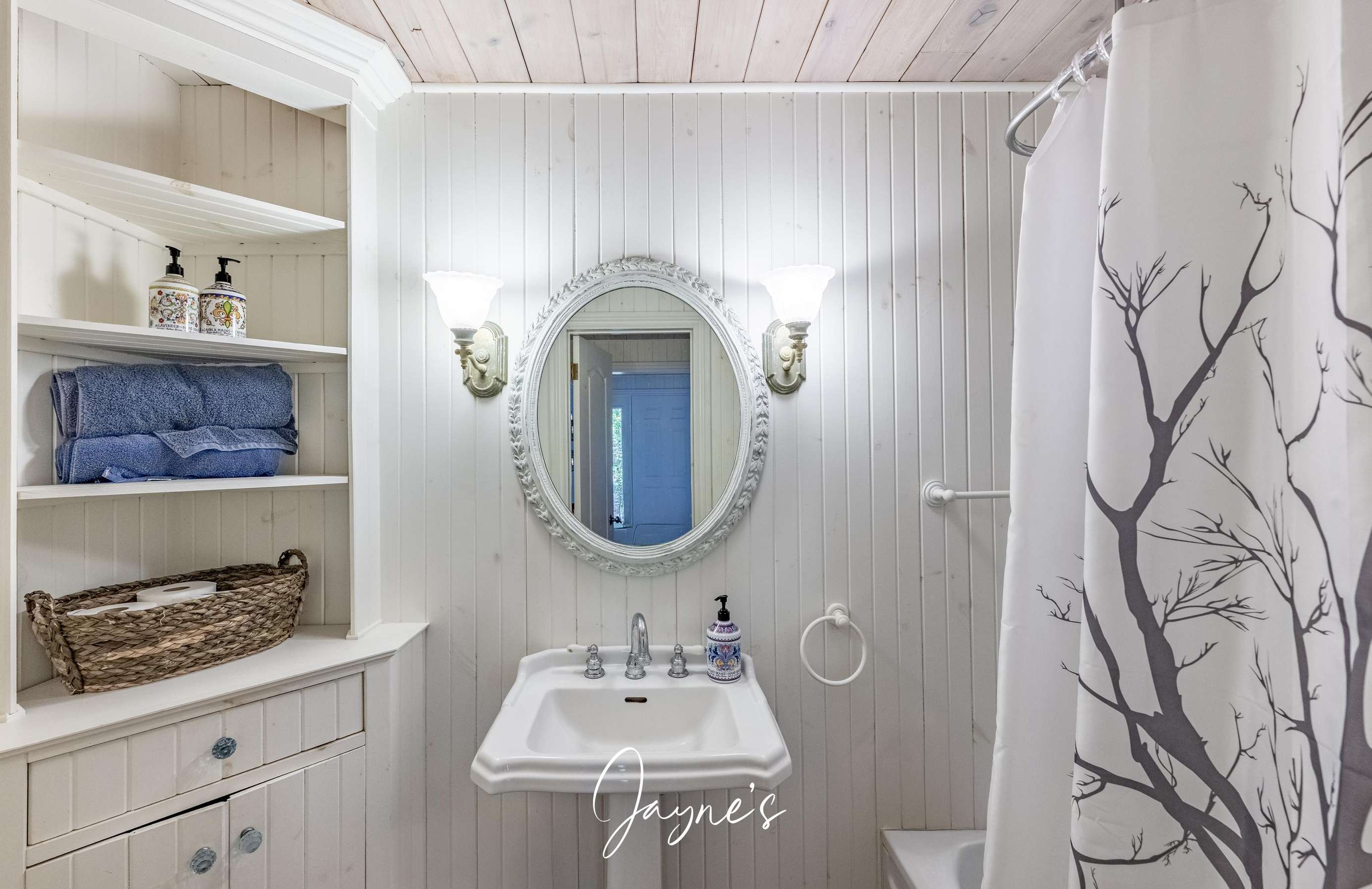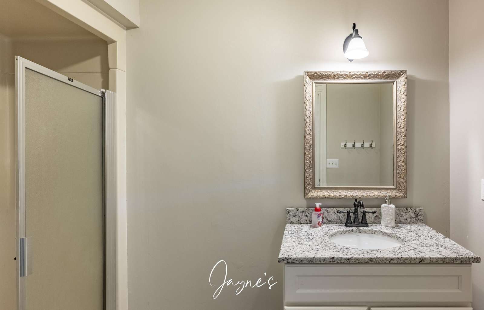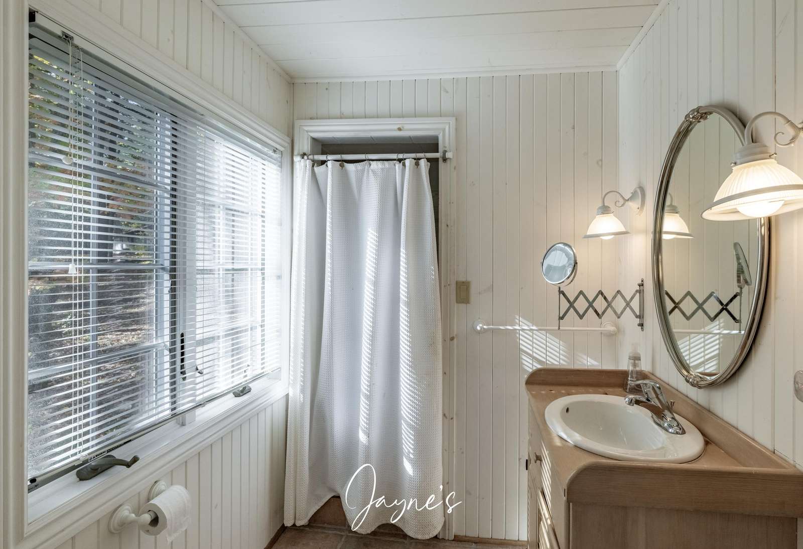 There is a large family room located on the lower level of the cottage, featuring an oversized stone fireplace, comfortable seating, a flat-screen TV, and sliding doors to outside. The two remaining bedrooms can be found on the lower level of the cottage, as well as a Jack and Jill bathroom and a 3-piece bathroom. There is 1 King bedroom, and one room with 2 twin beds. There is covered seating outside the lower level walkout.