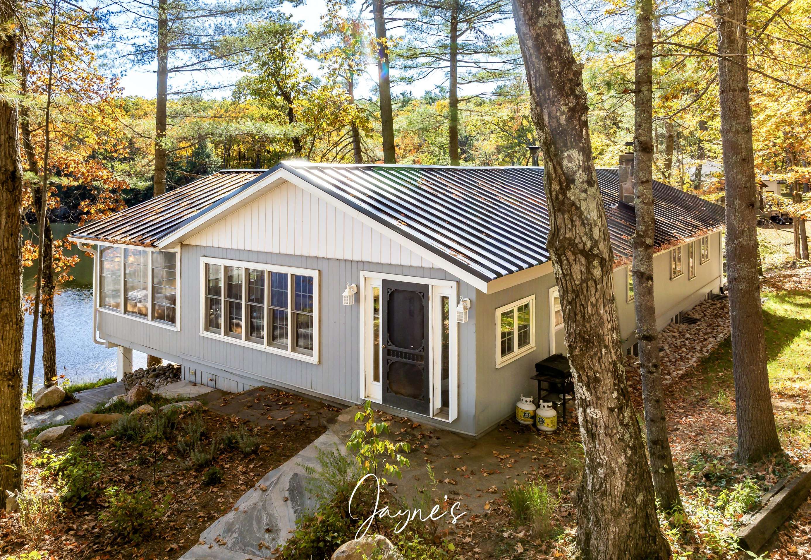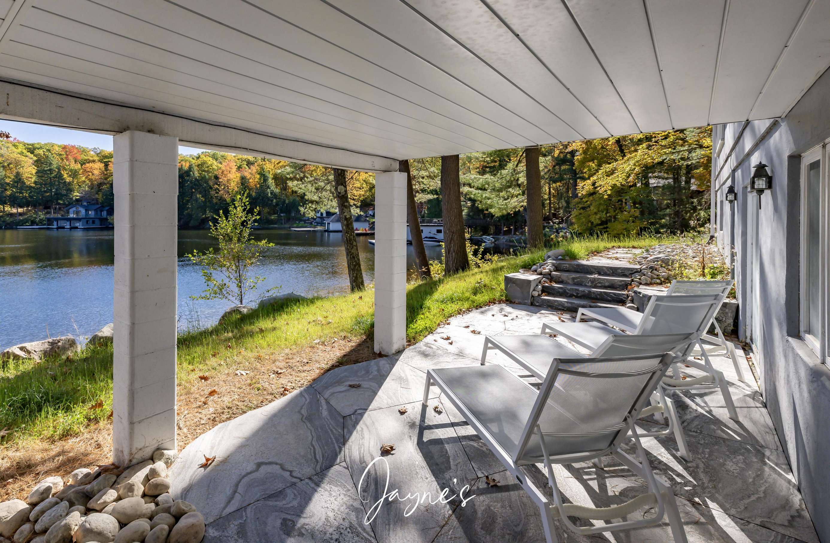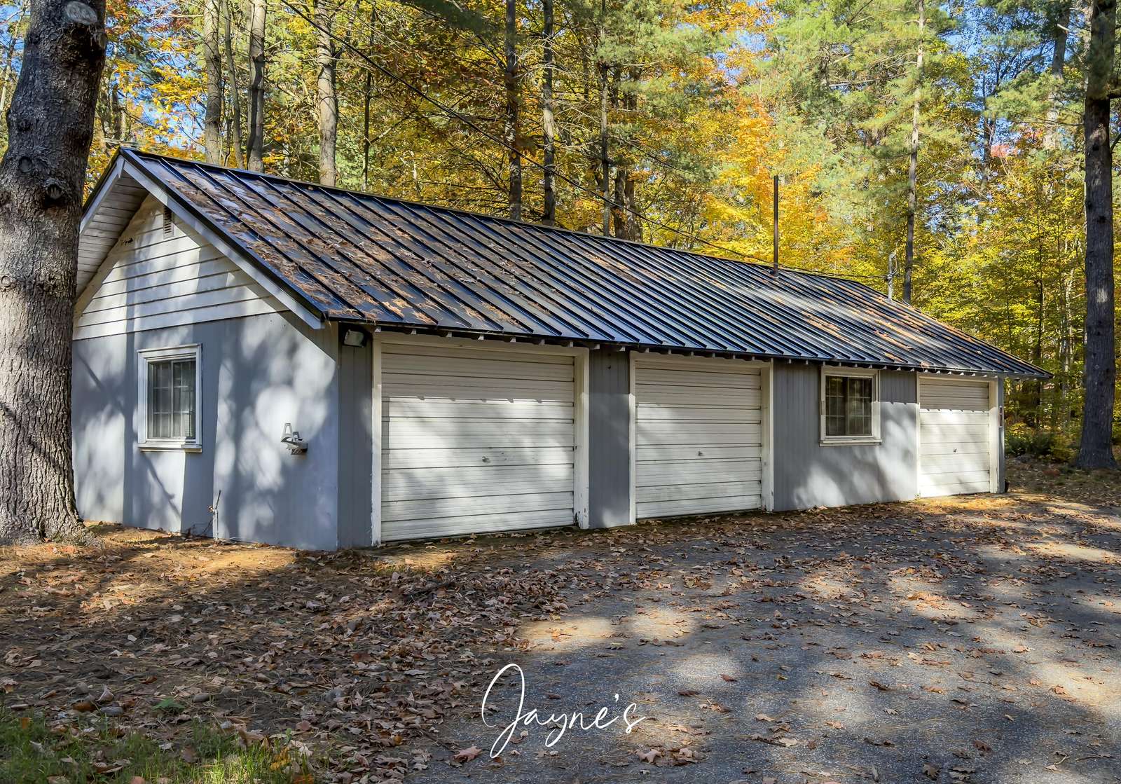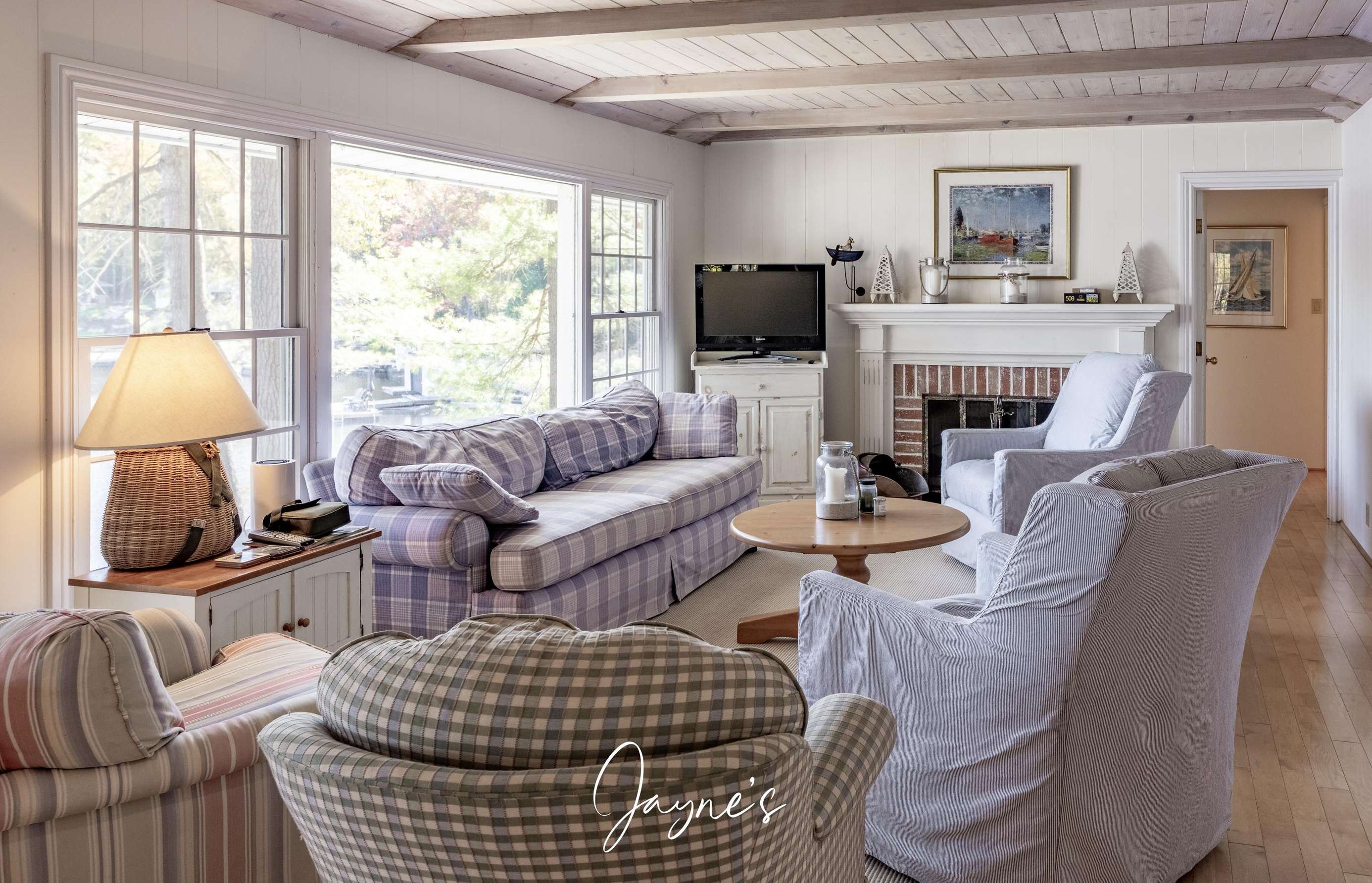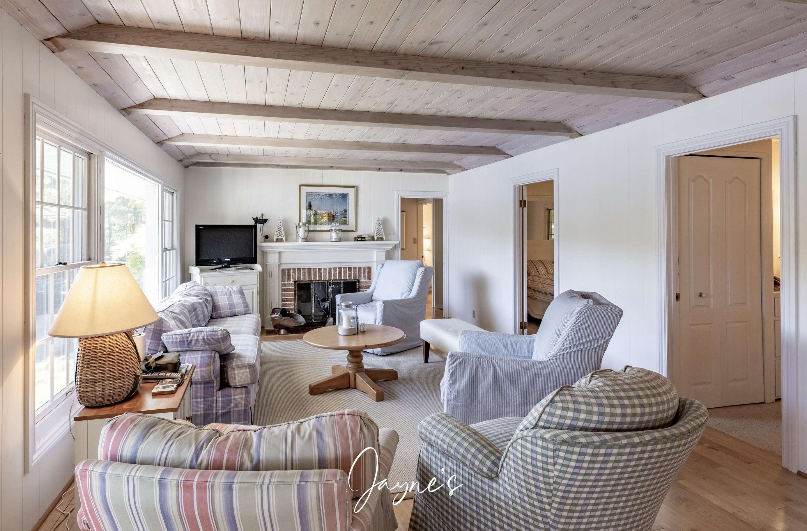There is a large family room located on the lower level of the cottage, featuring an oversized stone fireplace, comfortable seating, a flat-screen TV, and sliding doors to outside. The two remaining bedrooms can be found on the lower level of the cottage, as well as a Jack and Jill bathroom and a 3-piece bathroom. There is 1 King bedroom, and one room with 2 twin beds. There is covered seating outside the lower level walkout.