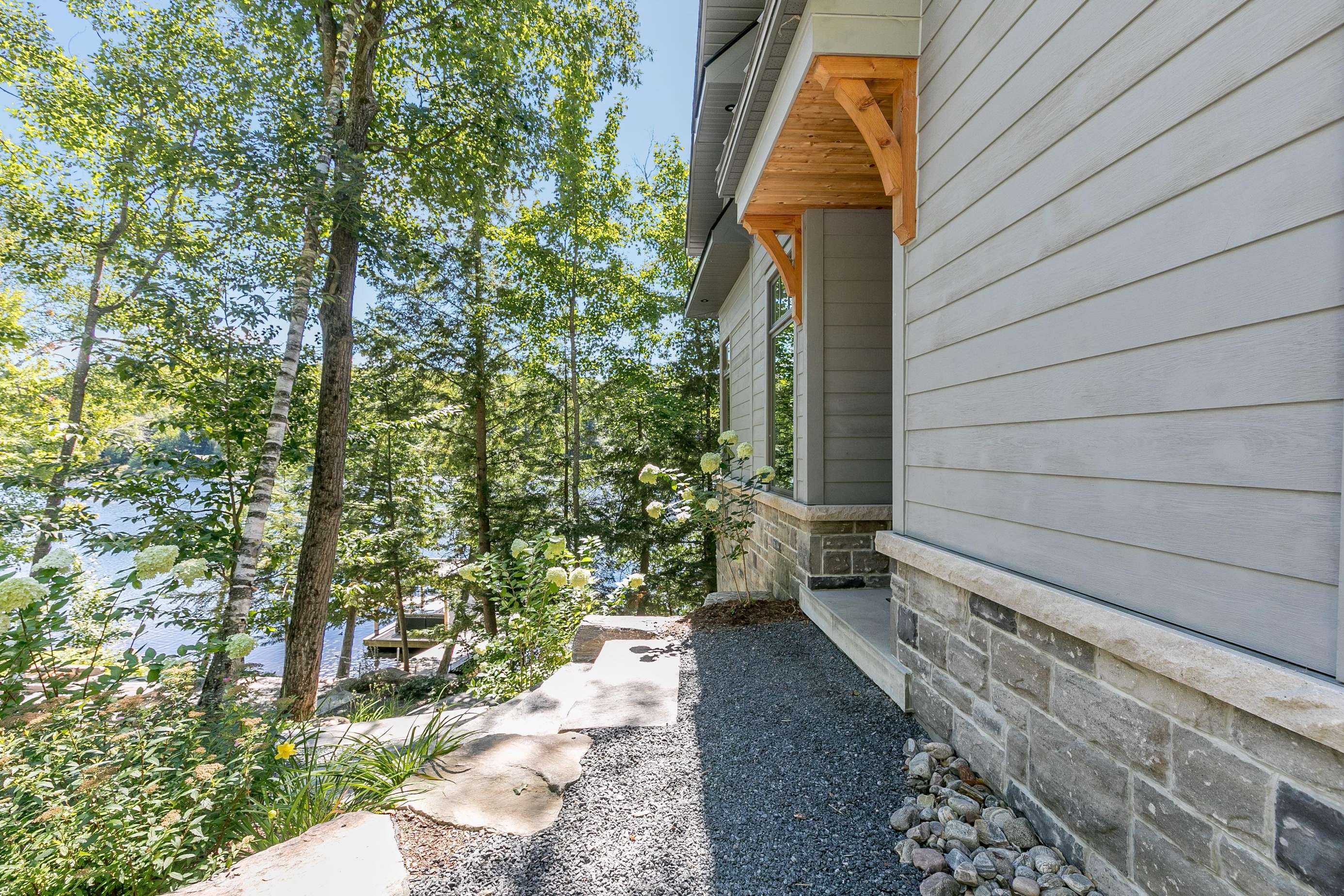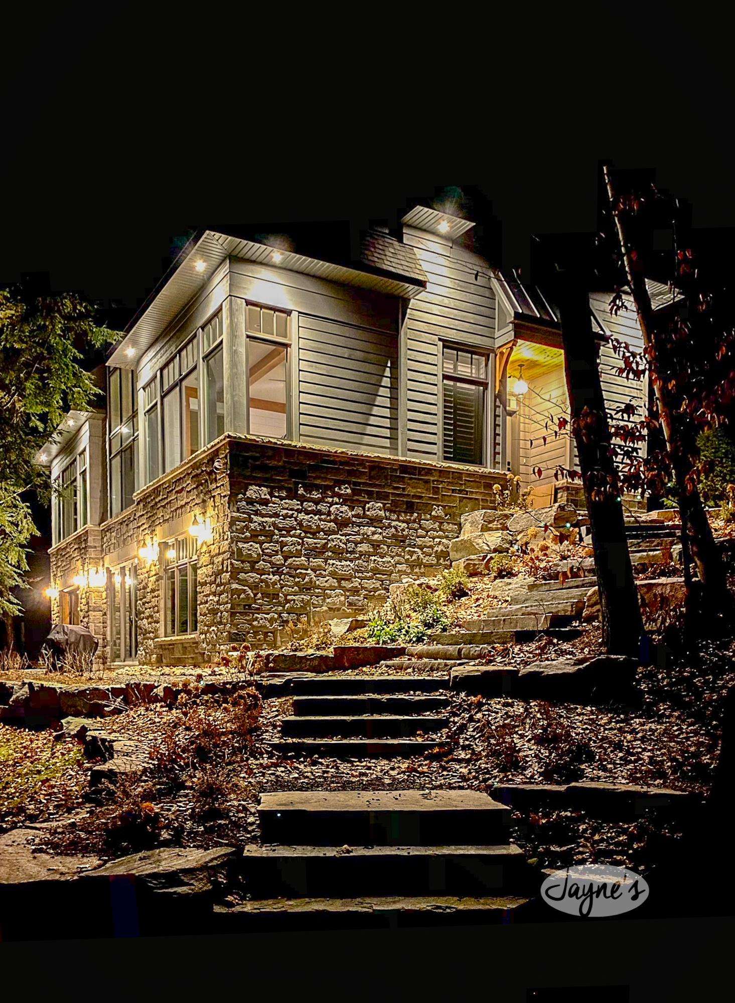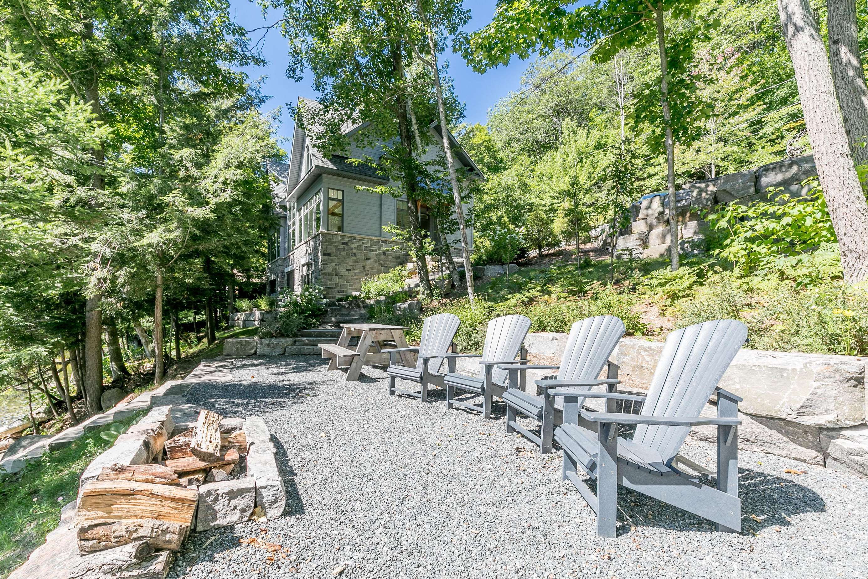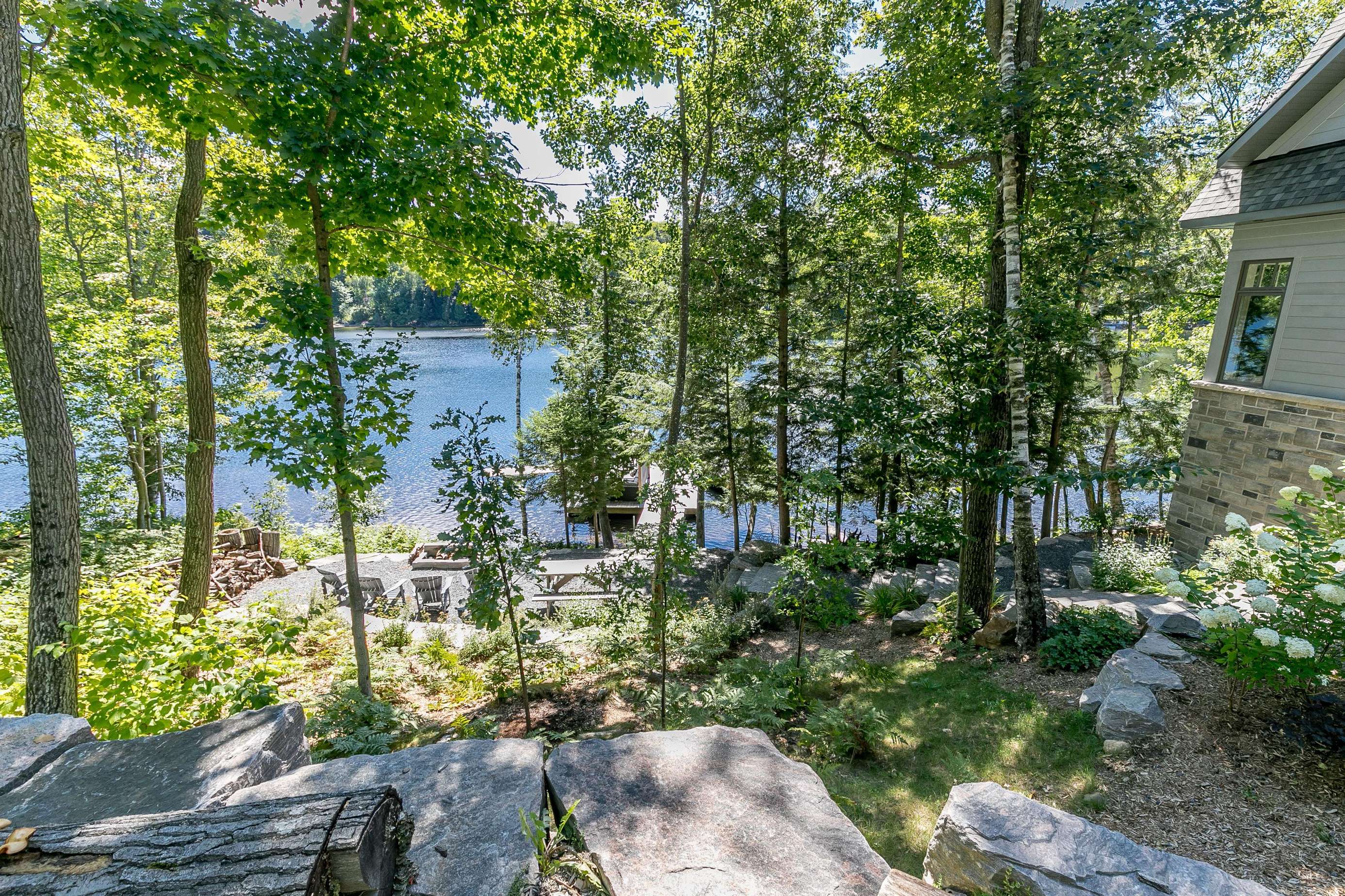 ECHO BAY LAKEHOUSE is a brand new build just 50ft from the water's edge! The beautifully landscaped yard begins the moment you step out of the car, leading you down the stairs to the entrance and further down to the lake. Clear, deep water off the dock awaits your best cannonball! The deck features two Muskoka chairs and a sectional sofa with an umbrella to escape the sun. A shallow sandy entry can also be found along the shore, where you can lounge in a lawn chair and dangle your toes in the water! Half-way up, a fire pit with 4 Muskoka chairs overlooks the calm bay, inviting you to cozy around as the sun goes down.