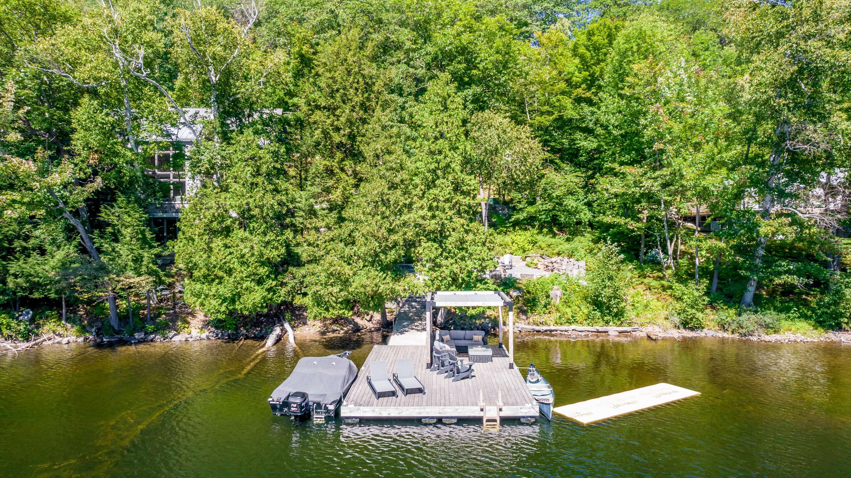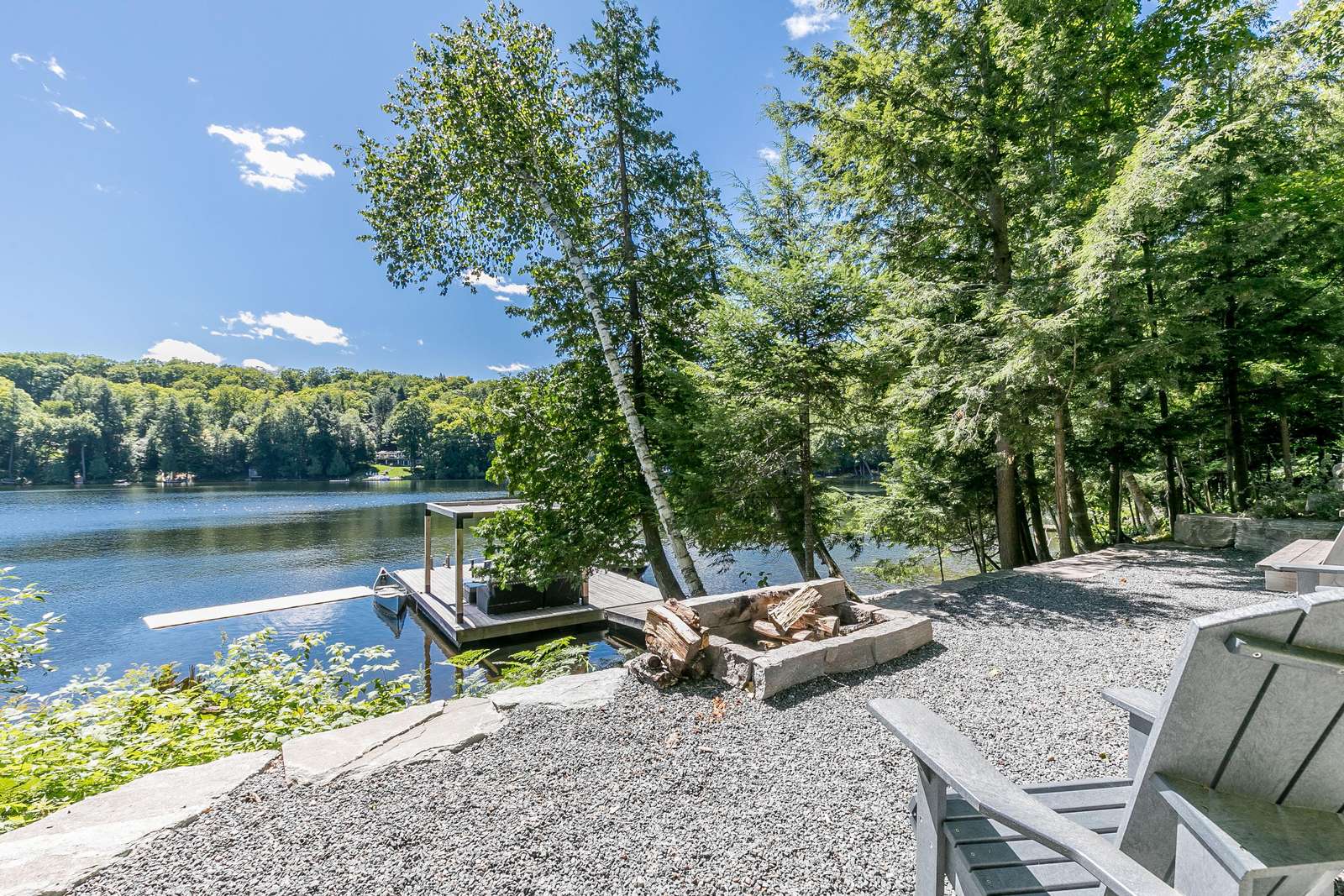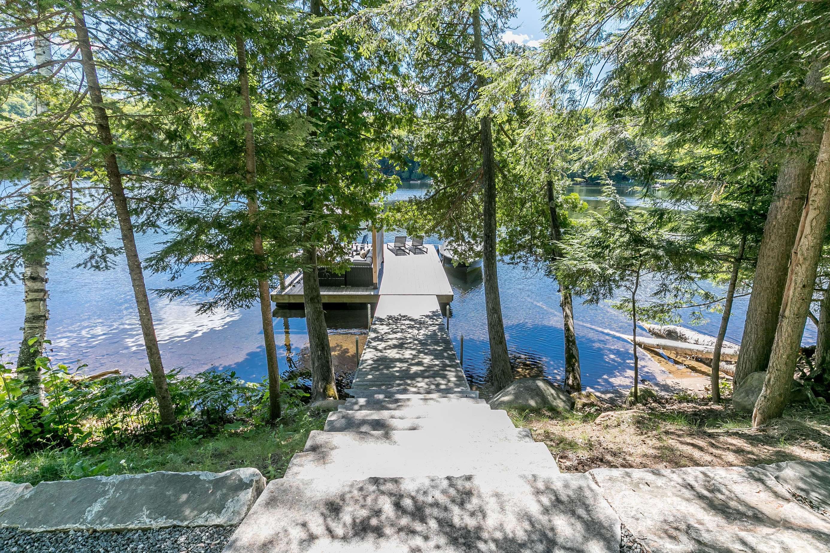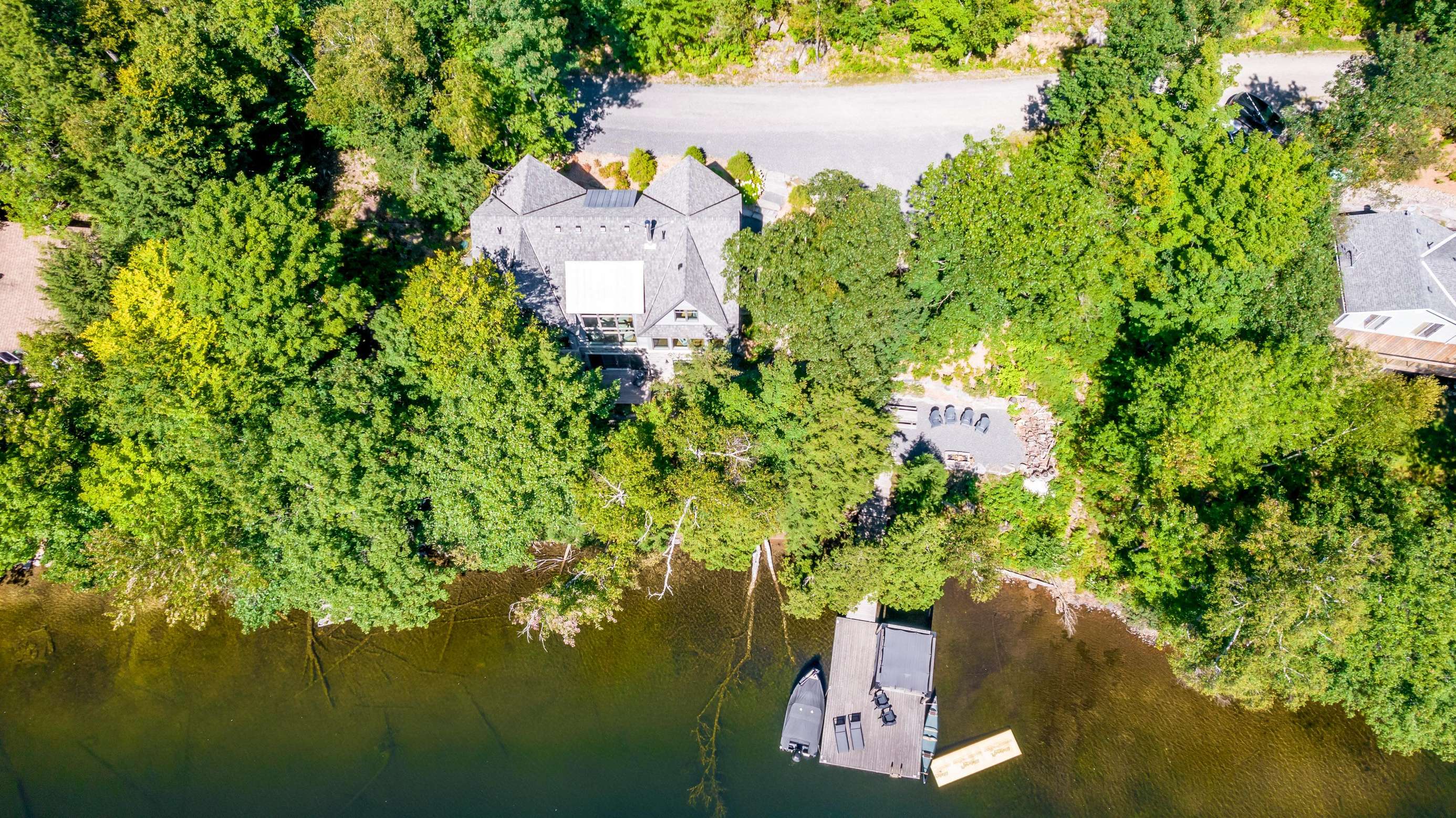 ECHO BAY LAKEHOUSE is a brand new build just 50ft from the water's edge! The beautifully landscaped yard begins the moment you step out of the car, leading you down the stairs to the entrance and further down to the lake. Clear, deep water off the dock awaits your best cannonball! The deck features two Muskoka chairs and a sectional sofa with an umbrella to escape the sun. A shallow sandy entry can also be found along the shore, where you can lounge in a lawn chair and dangle your toes in the water! Half-way up, a fire pit with 4 Muskoka chairs overlooks the calm bay, inviting you to cozy around as the sun goes down.