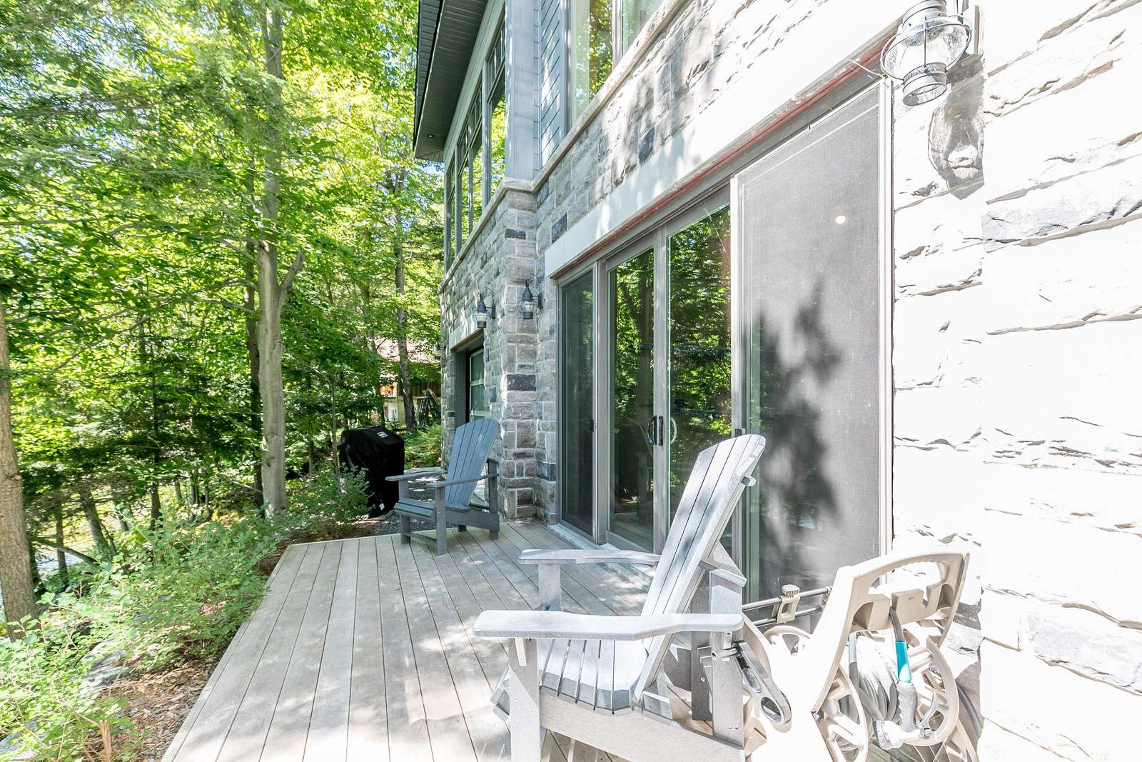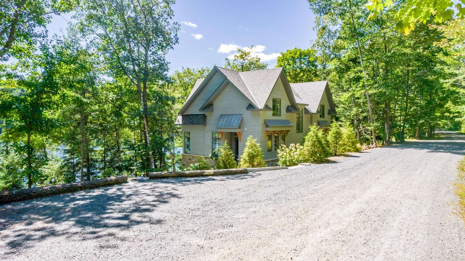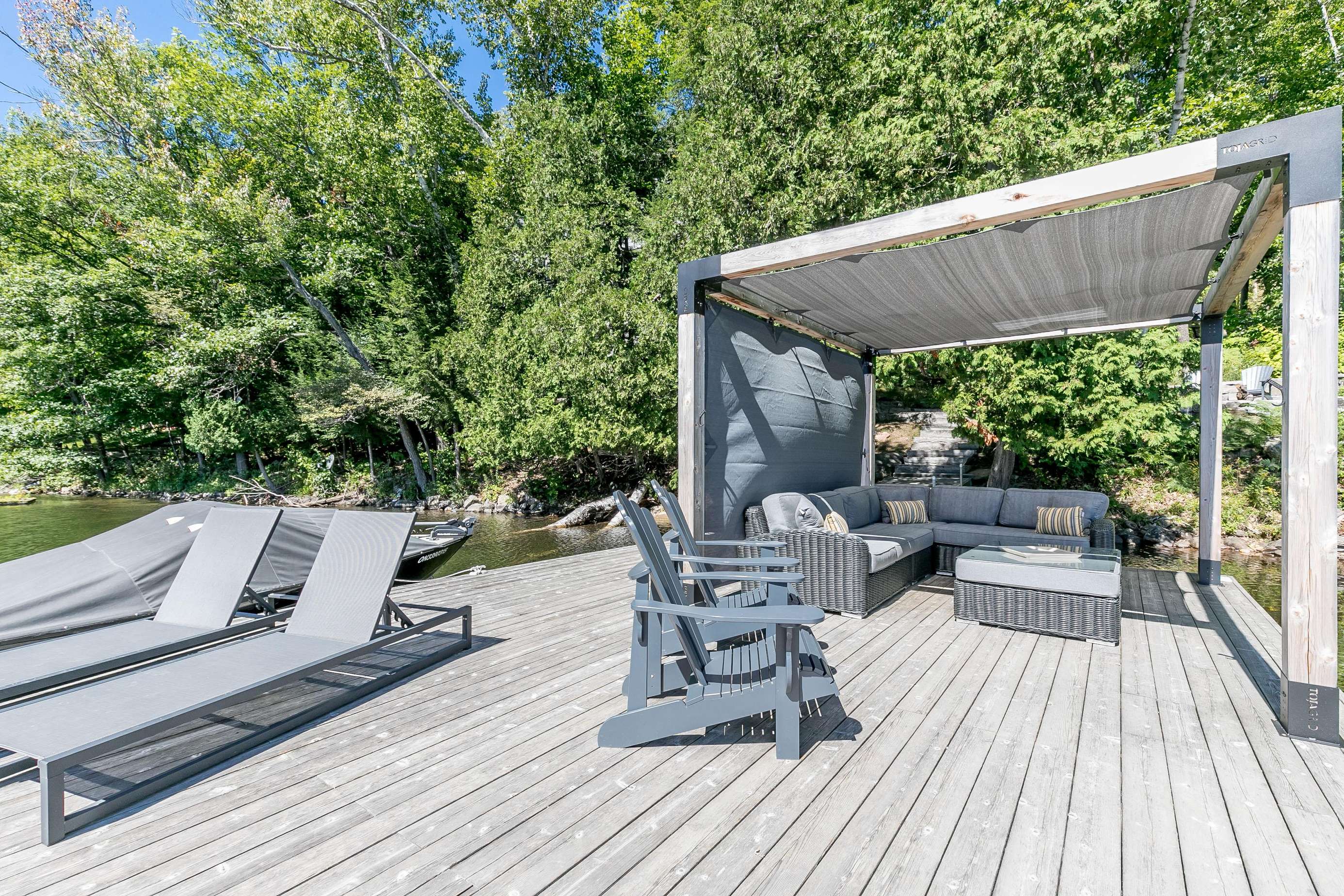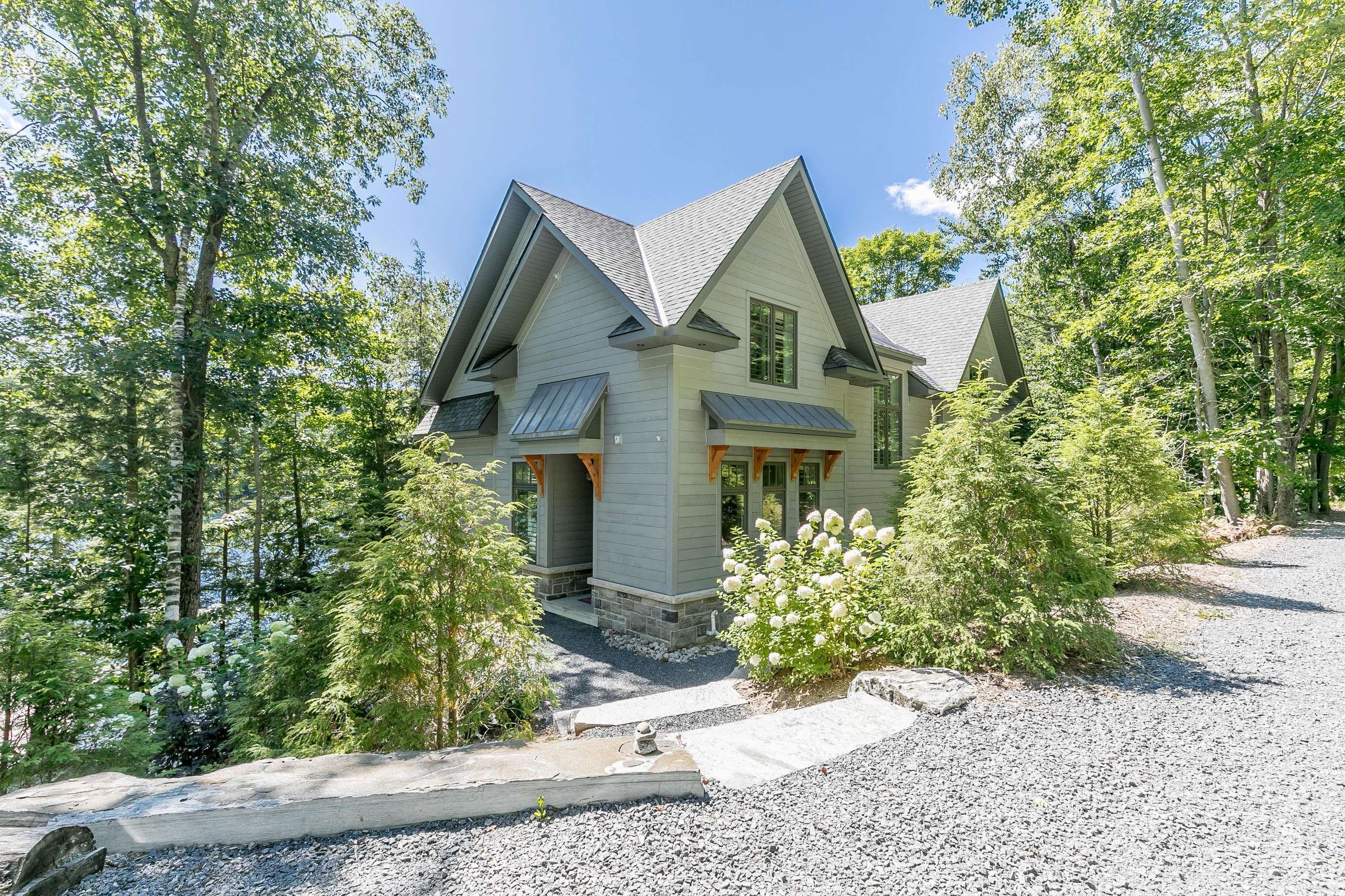 ECHO BAY LAKEHOUSE is a brand new build just 50ft from the water's edge! The beautifully landscaped yard begins the moment you step out of the car, leading you down the stairs to the entrance and further down to the lake. Clear, deep water off the dock awaits your best cannonball! The deck features two Muskoka chairs and a sectional sofa with an umbrella to escape the sun. A shallow sandy entry can also be found along the shore, where you can lounge in a lawn chair and dangle your toes in the water! Half-way up, a fire pit with 4 Muskoka chairs overlooks the calm bay, inviting you to cozy around as the sun goes down.