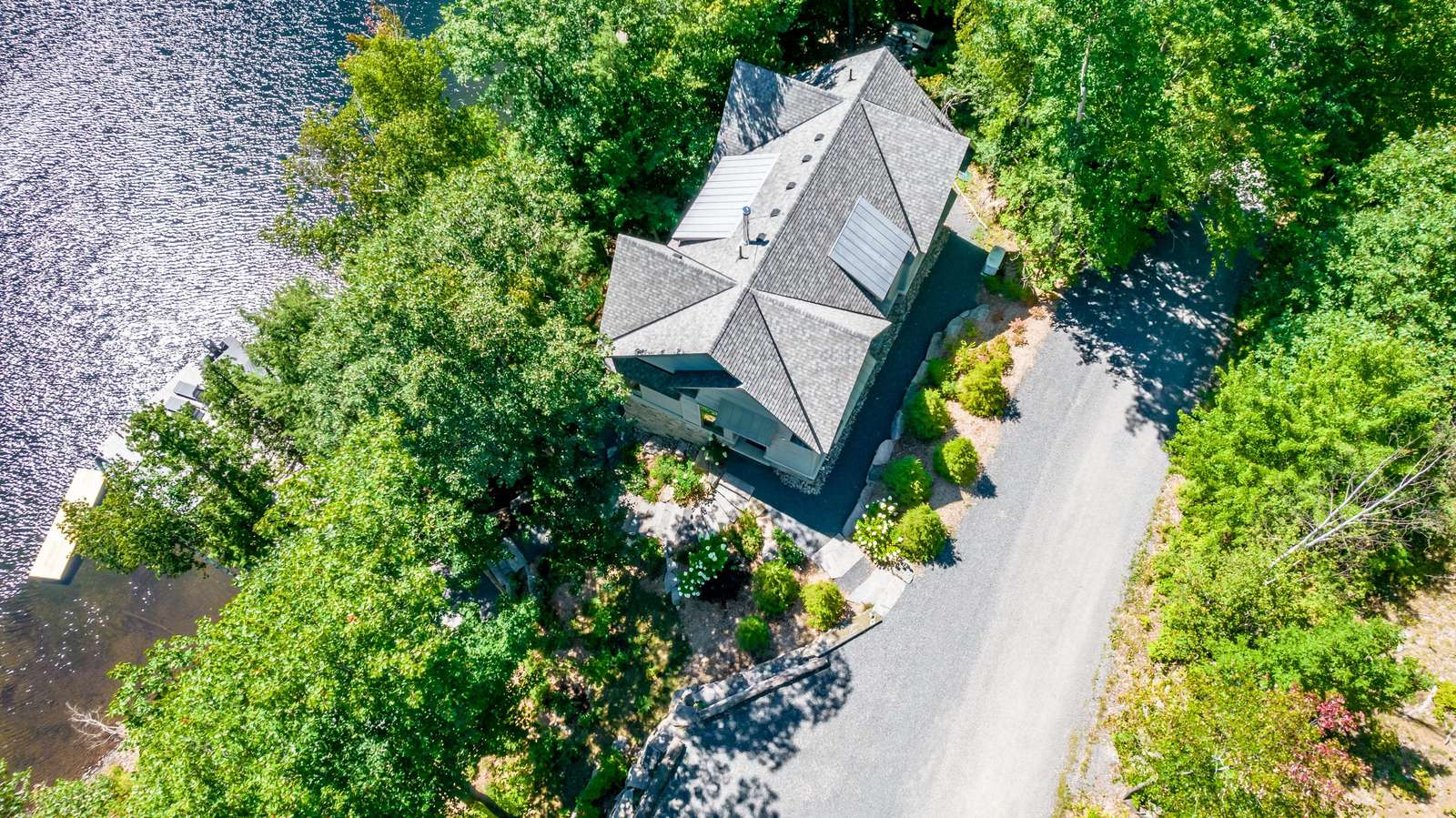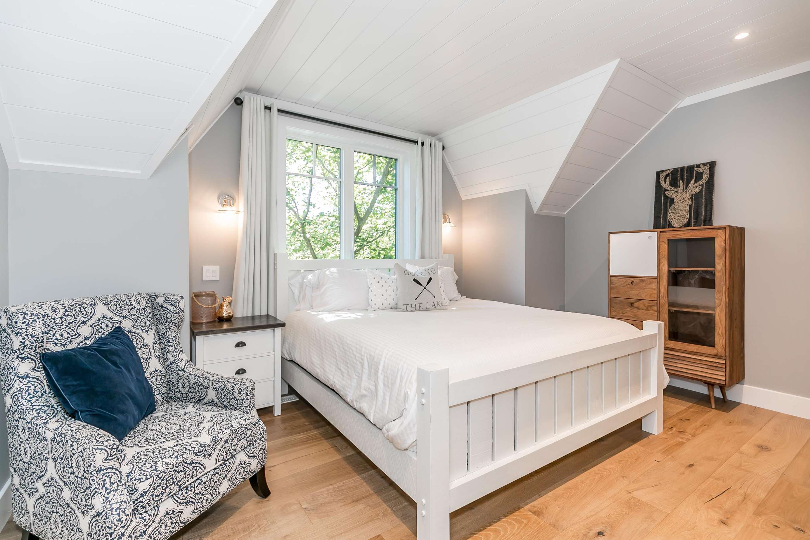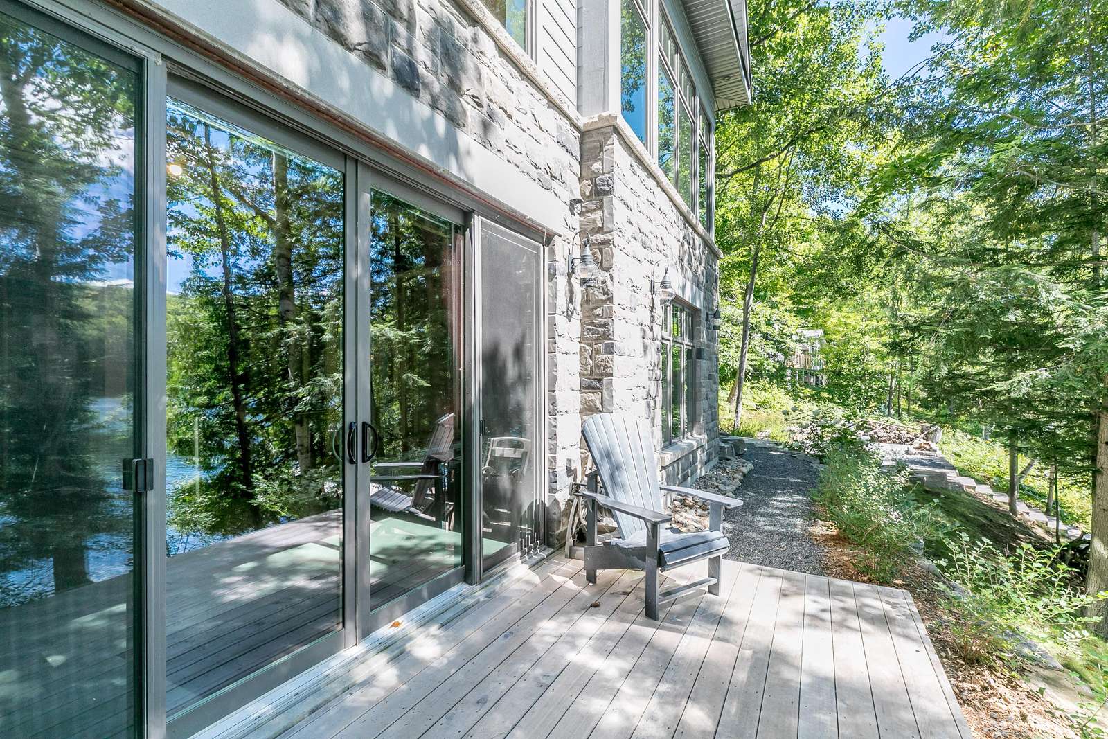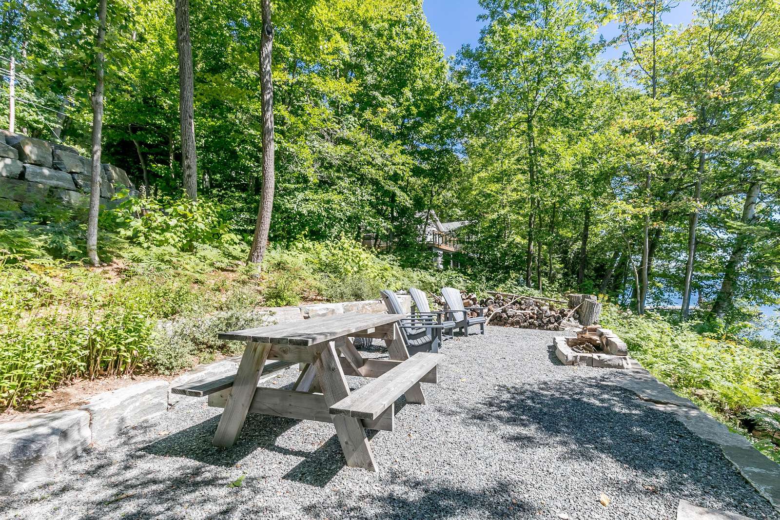 ECHO BAY LAKEHOUSE is a brand new build just 50ft from the water's edge! The beautifully landscaped yard begins the moment you step out of the car, leading you down the stairs to the entrance and further down to the lake. Clear, deep water off the dock awaits your best cannonball! The deck features two Muskoka chairs and a sectional sofa with an umbrella to escape the sun. A shallow sandy entry can also be found along the shore, where you can lounge in a lawn chair and dangle your toes in the water! Half-way up, a fire pit with 4 Muskoka chairs overlooks the calm bay, inviting you to cozy around as the sun goes down.