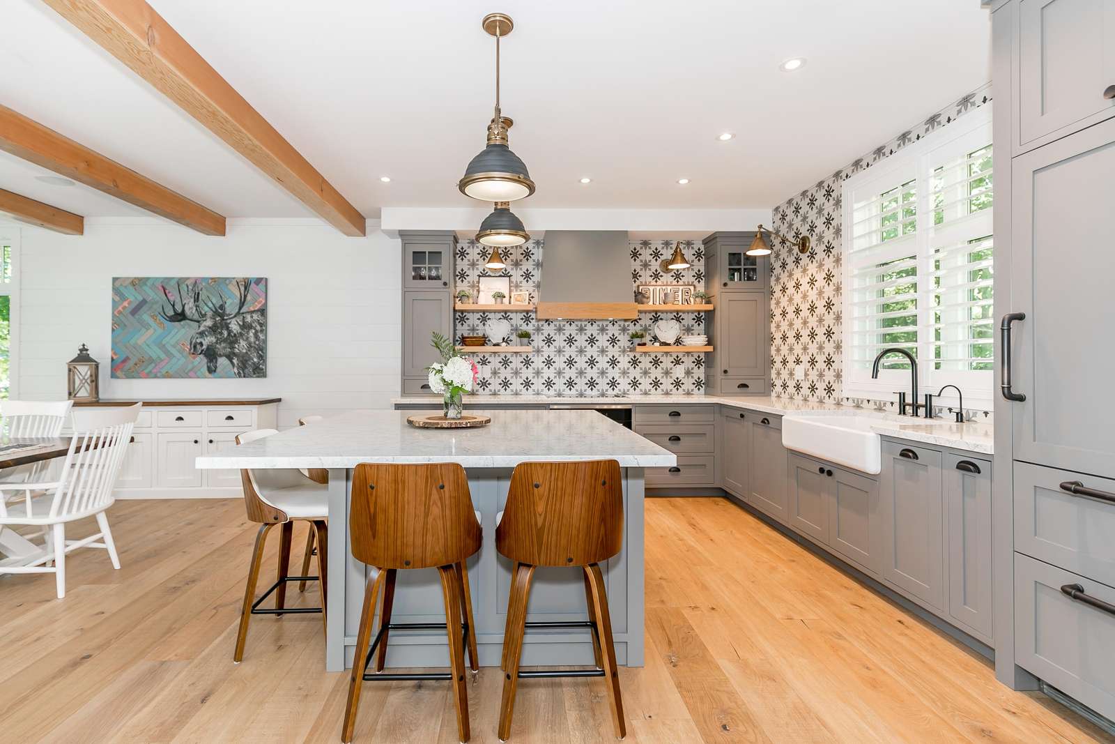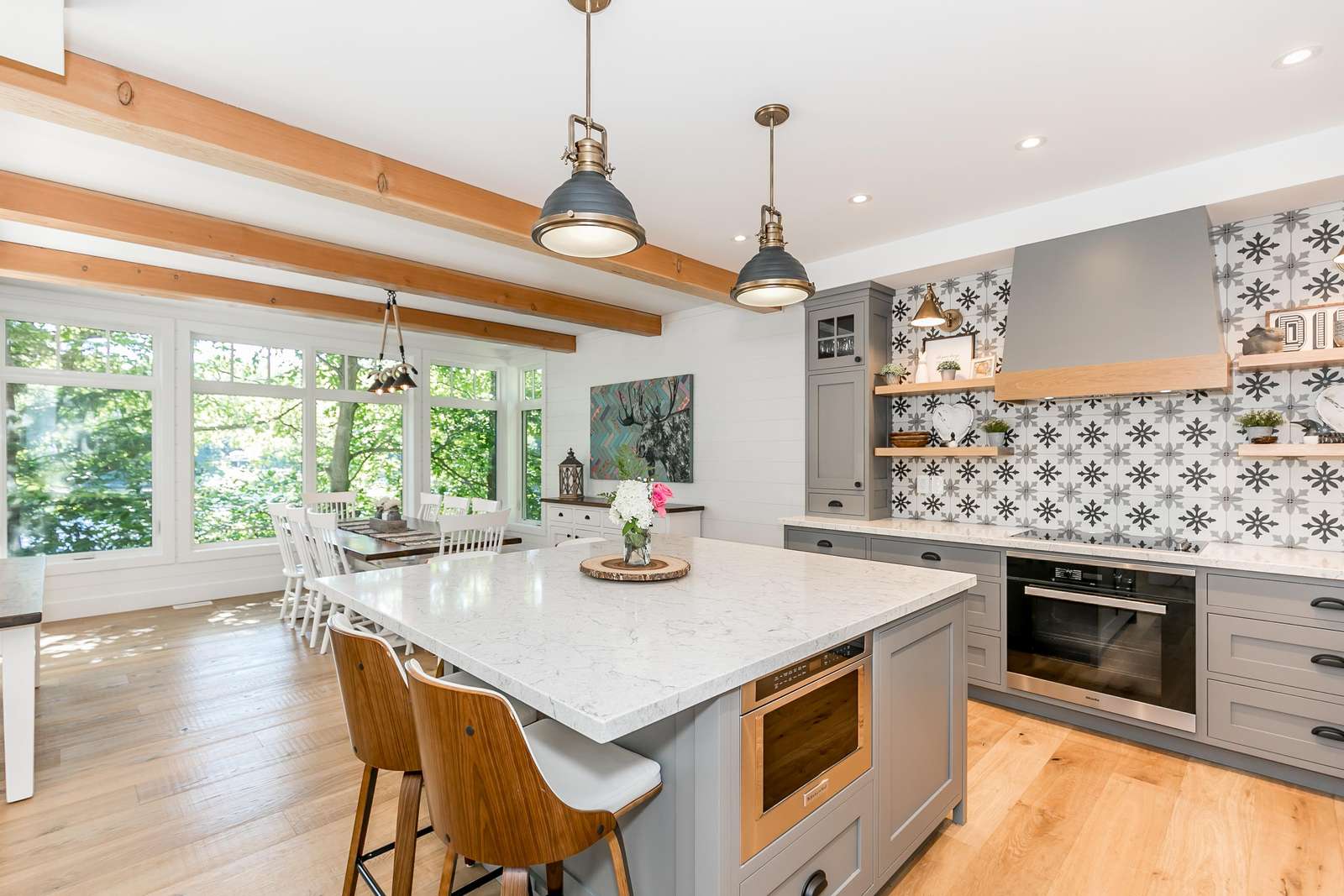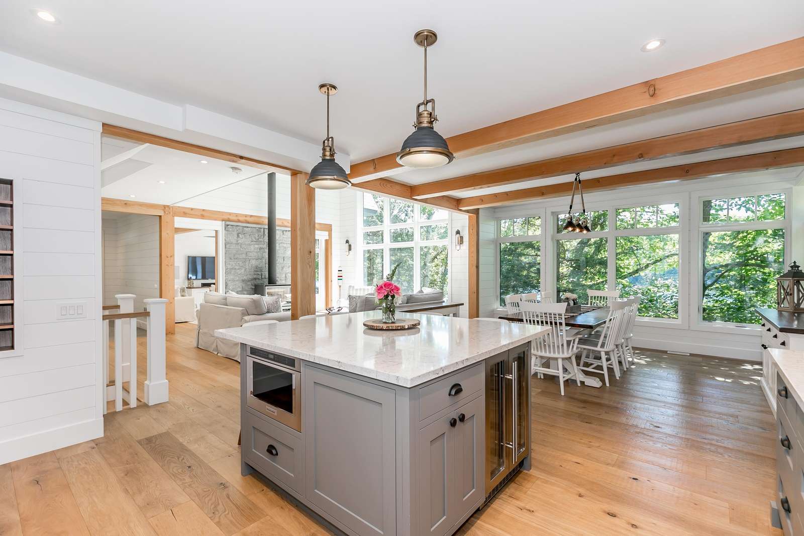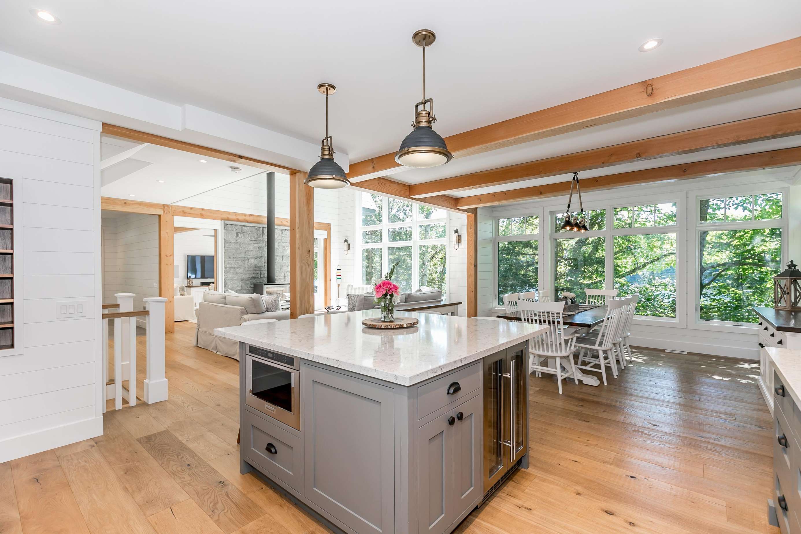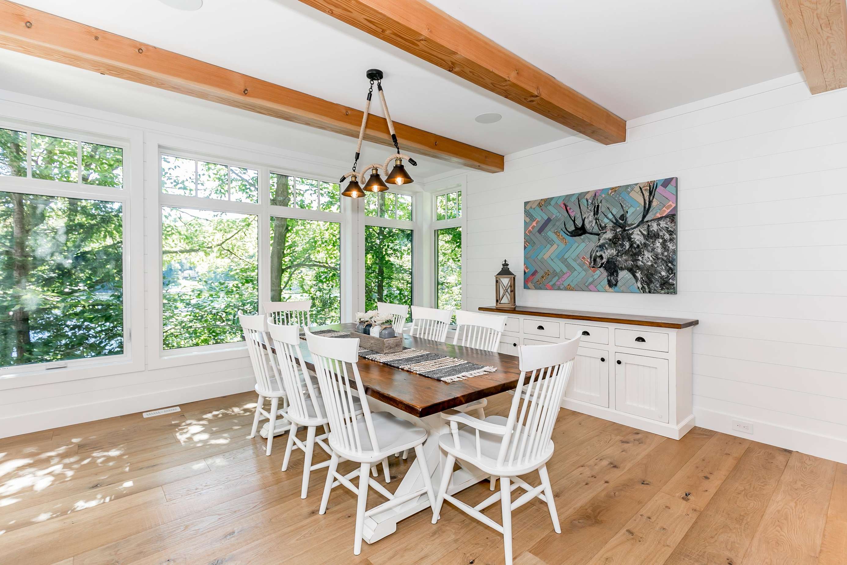 Open-concept dining room overlooking the lake with seating for 8.