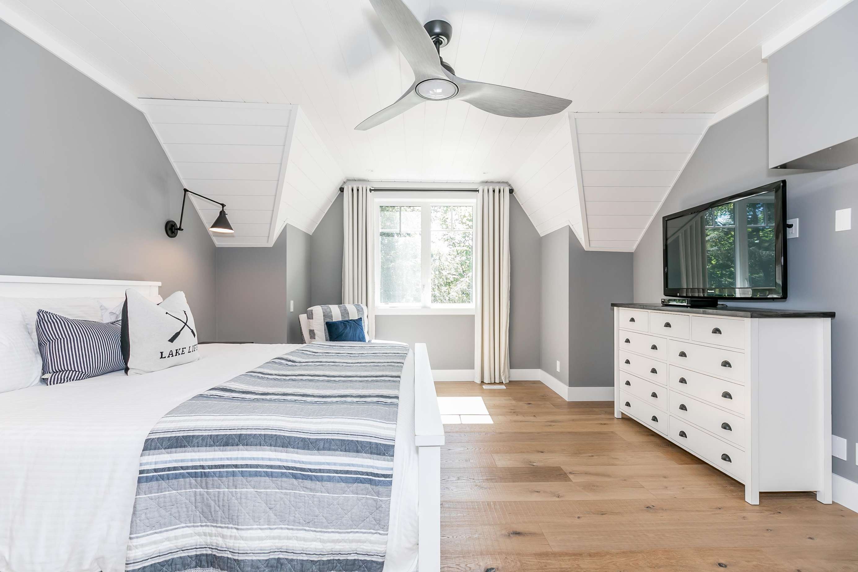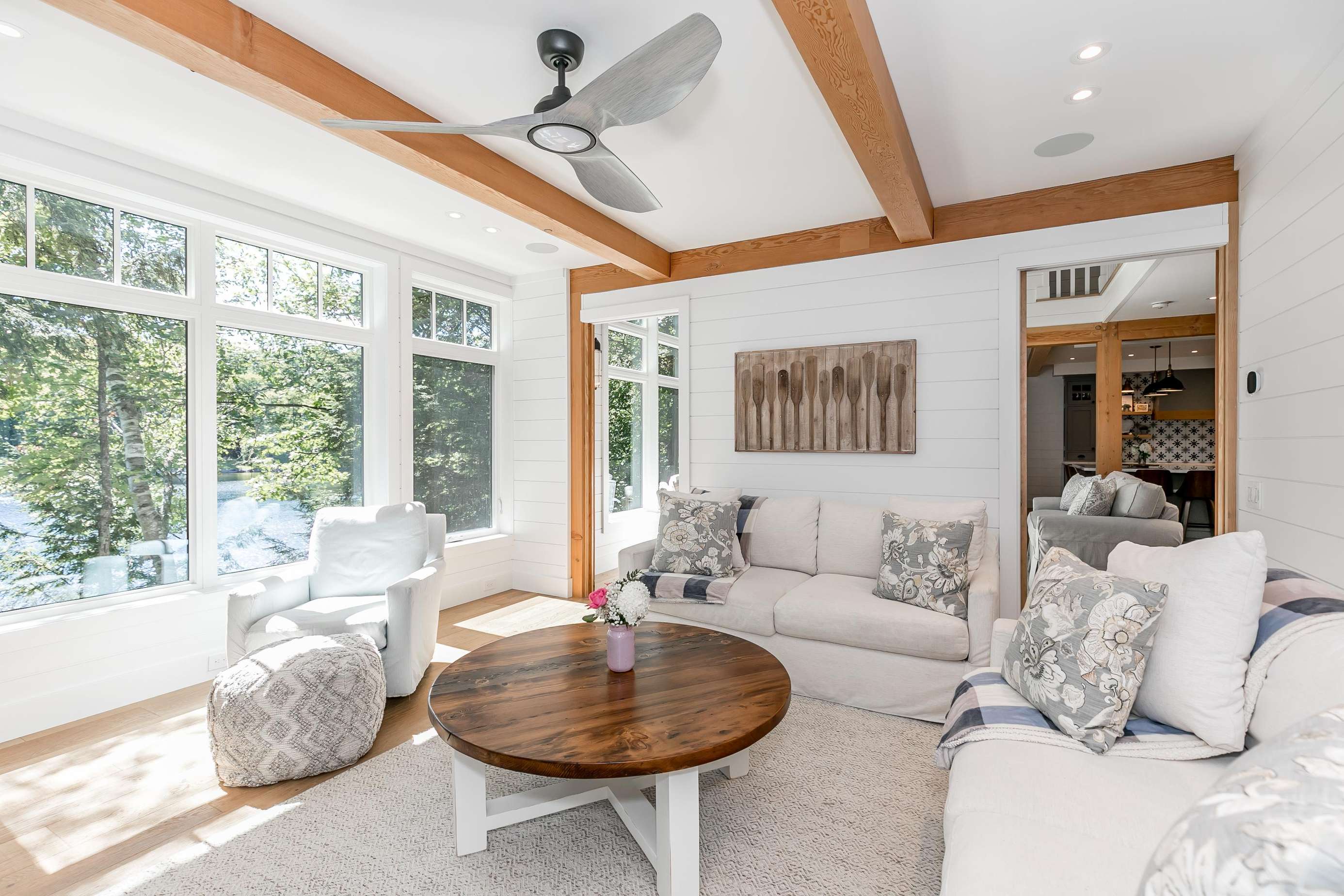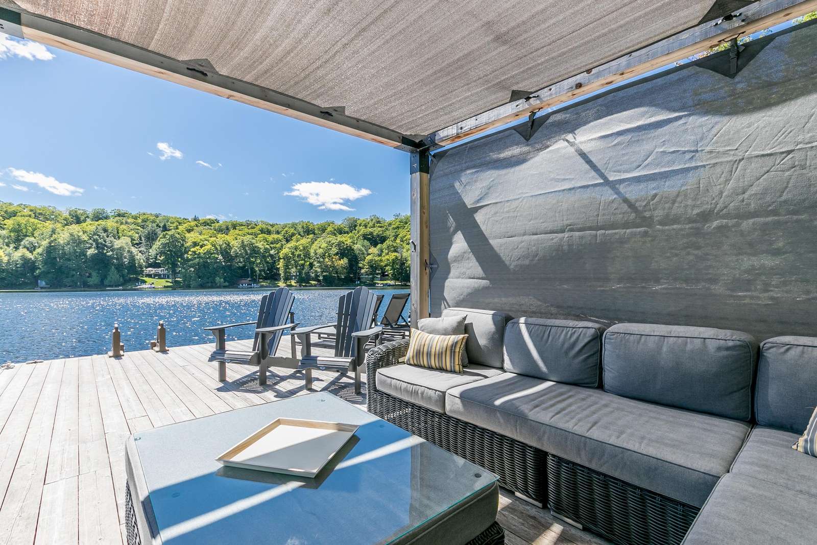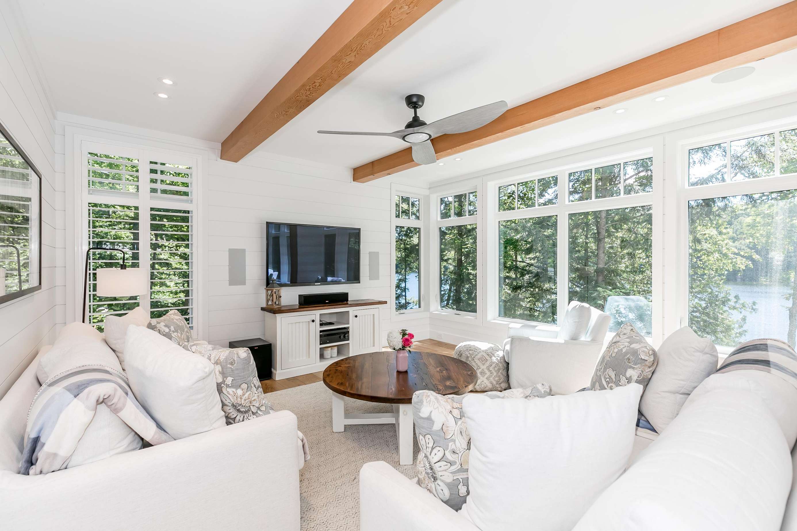 The sunbeams into this beautiful room! Featuring two plush sofas (one pull-outs to a queen bed) and a flatscreen TV with surround sound and stunning views of the lake.