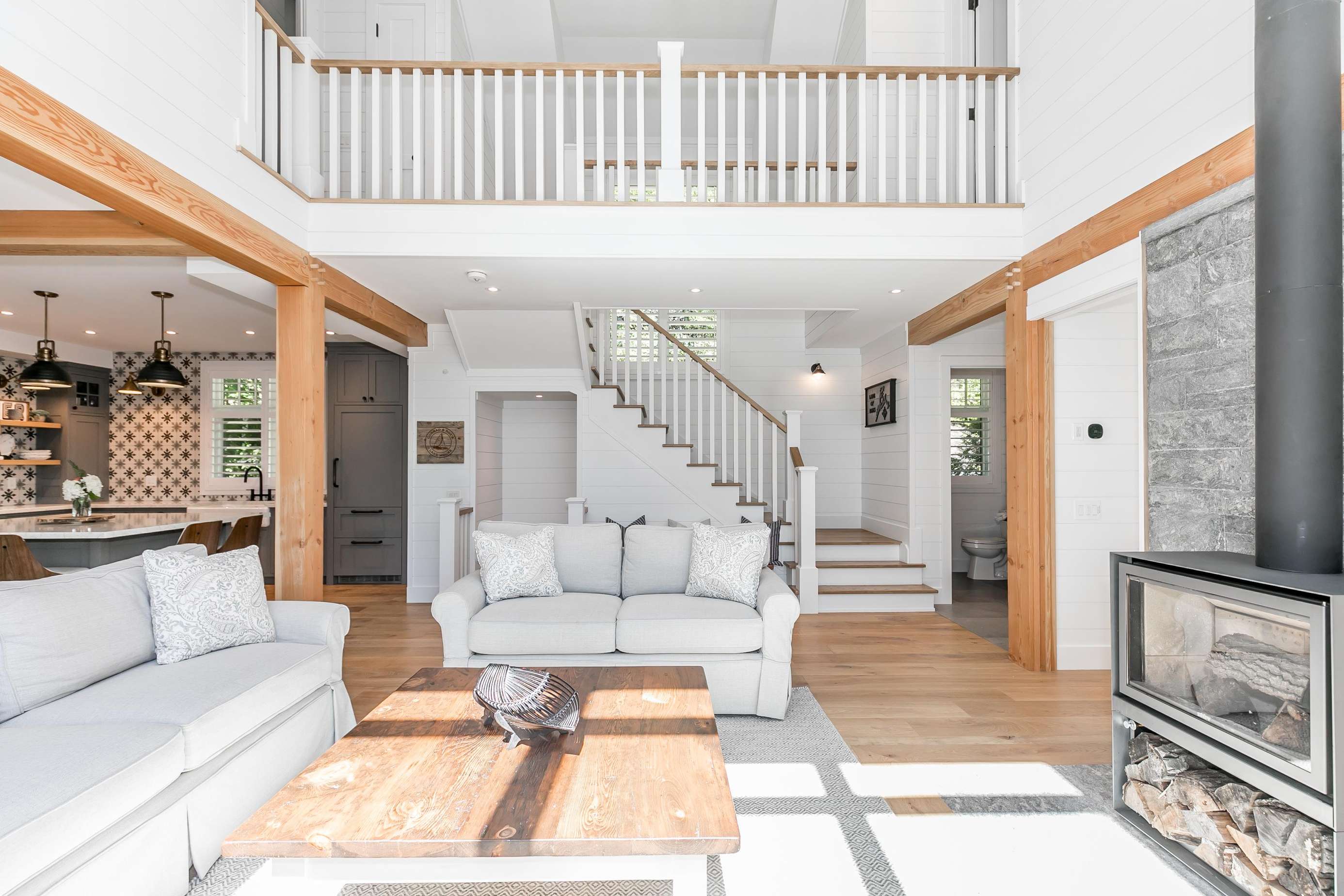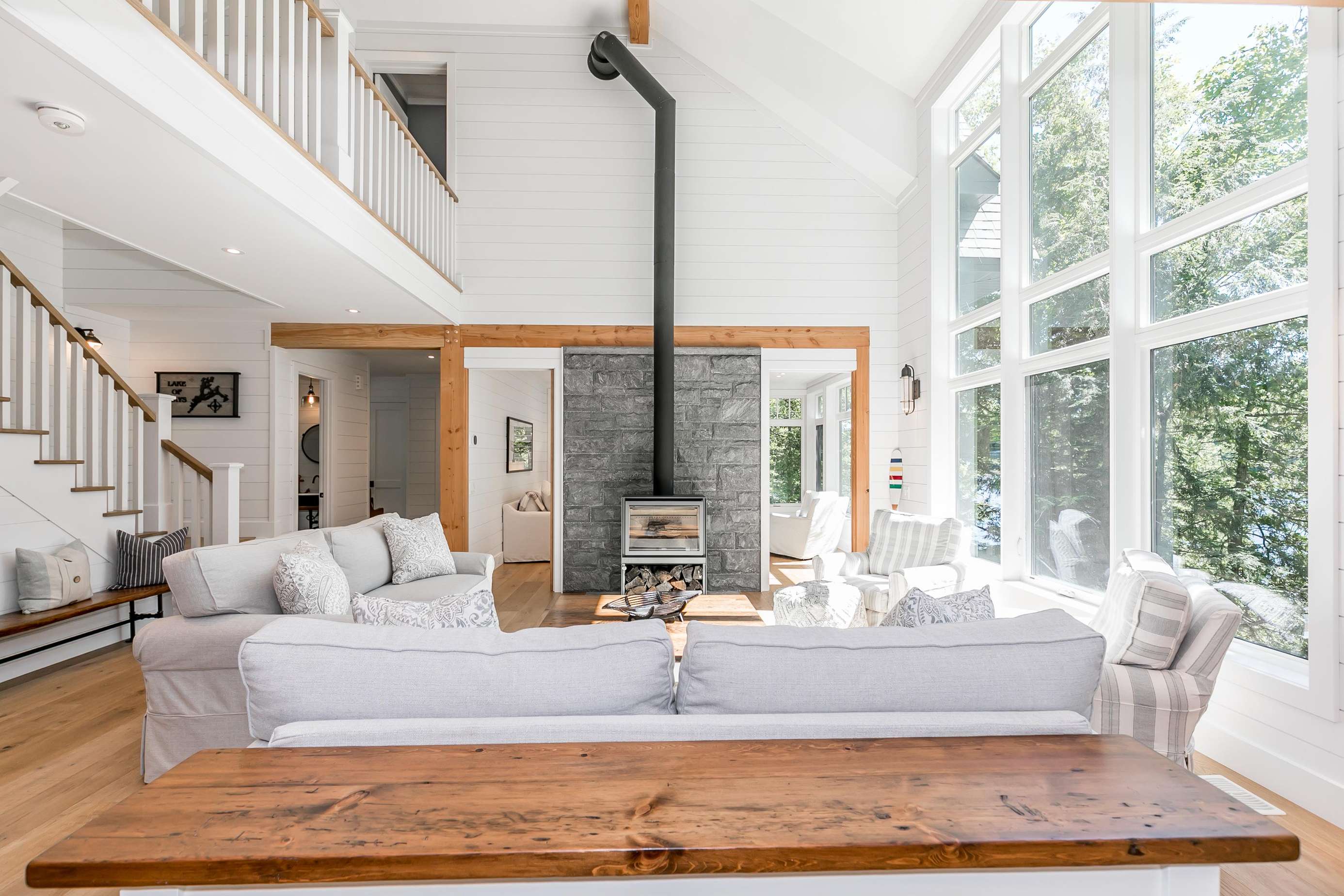The spacious great room boasts cathedral ceilings with floor to ceiling windows and a wood burning fireplace, surrounded by plush sofas and two swivel chairs.