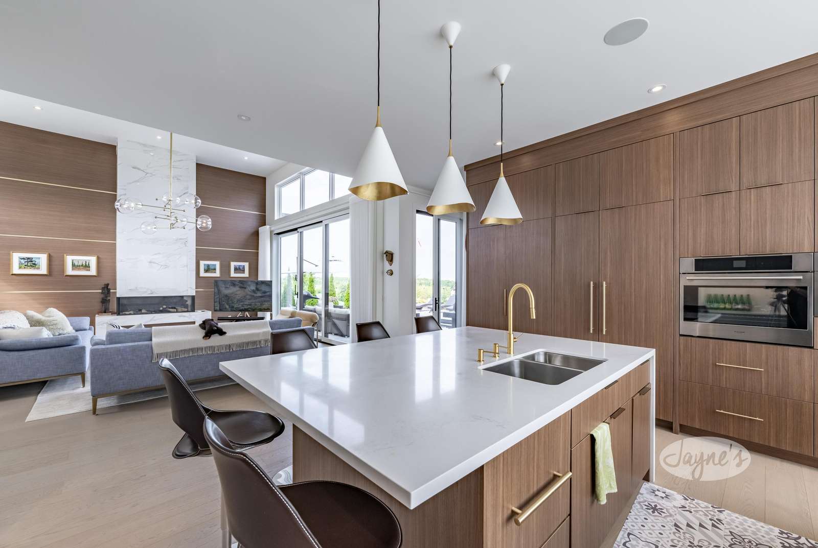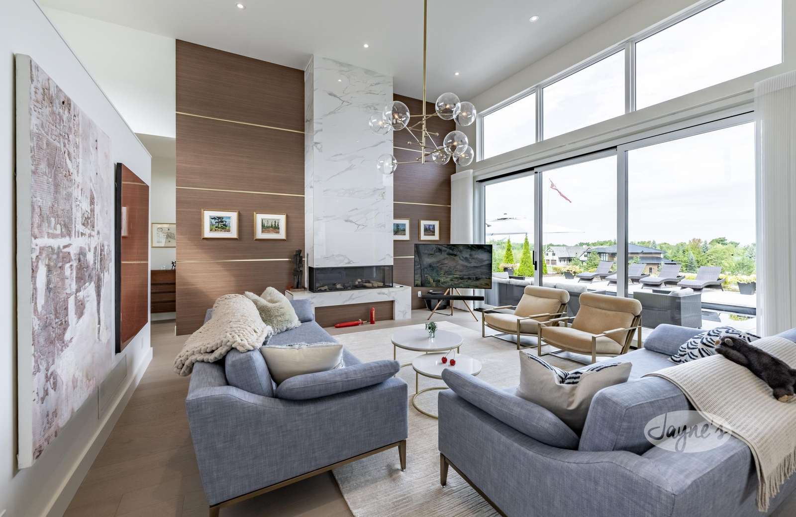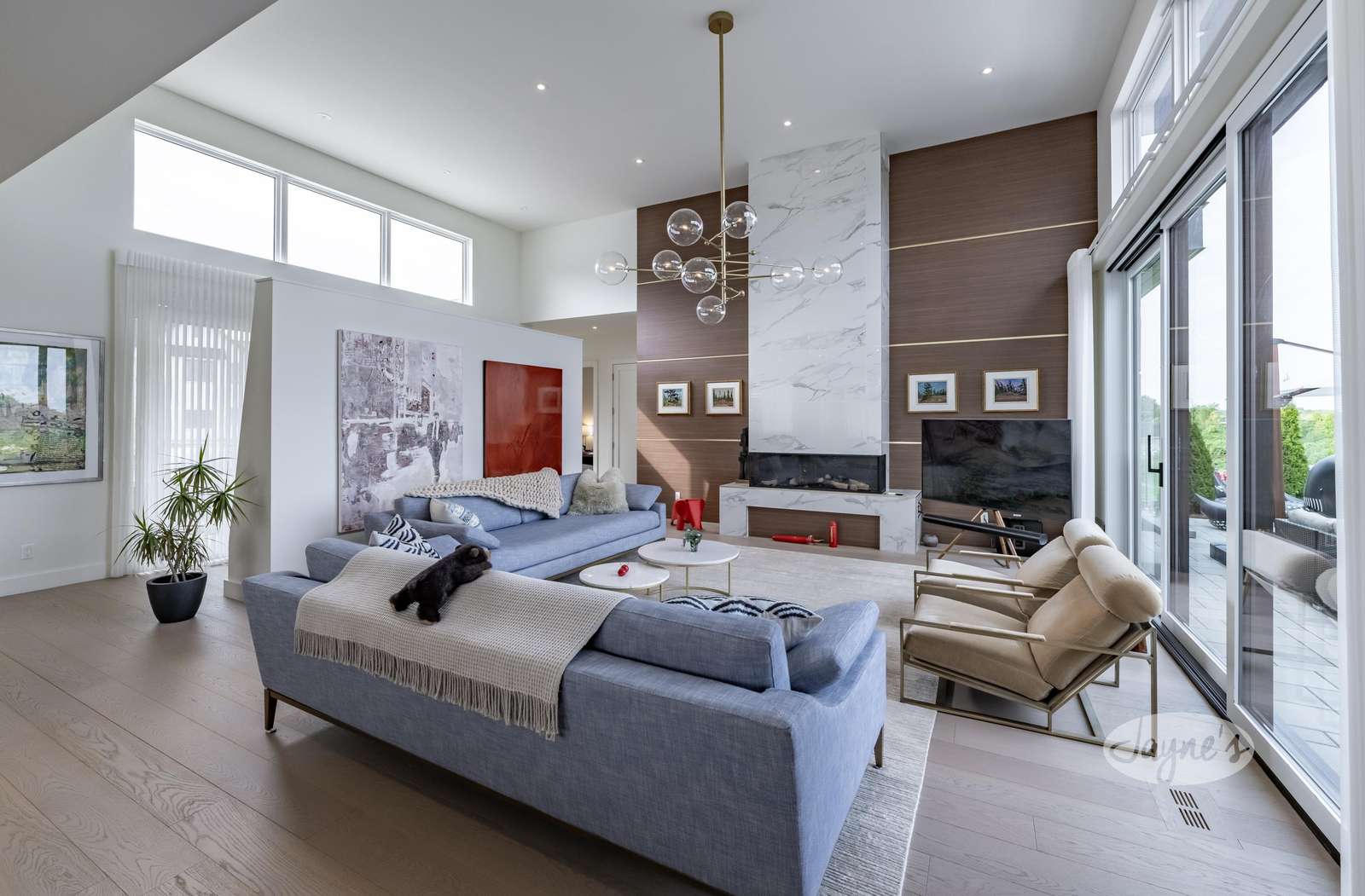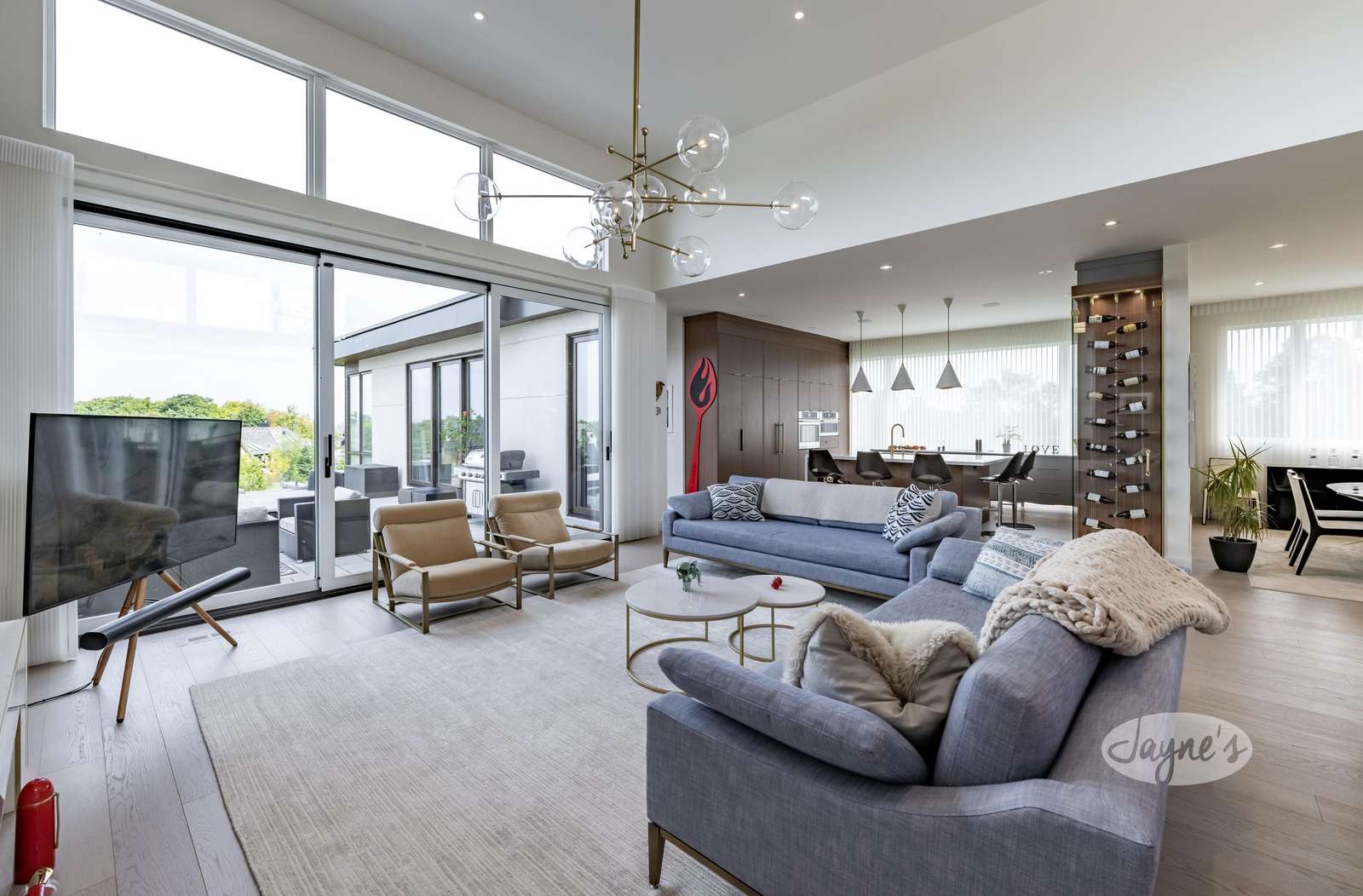 Open concept with large windows, gas fireplace, 2 story ceilings, TV, ample seating, and walk-out to deck.