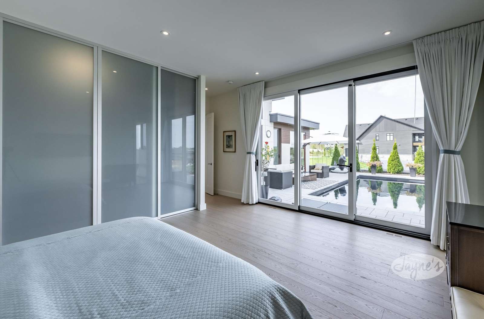 Bedroom 1 - King (Primary) with ensuite, TV and walk-out to pool deck.