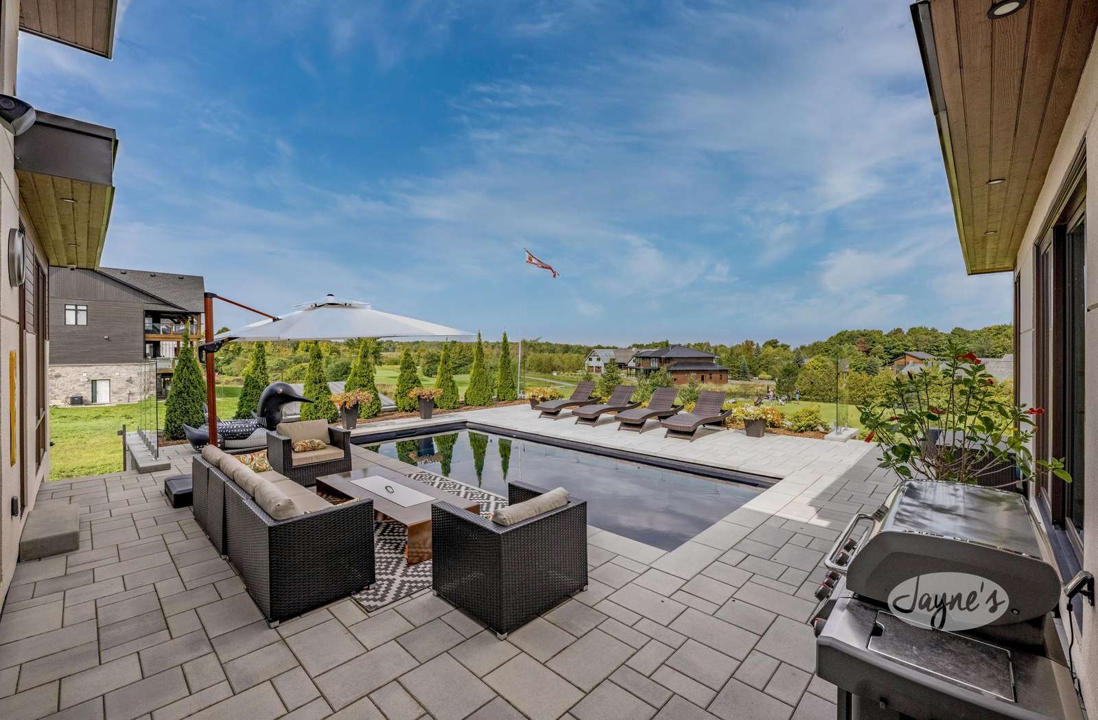 Custom built gas fire table on back deck overlooking golf course.