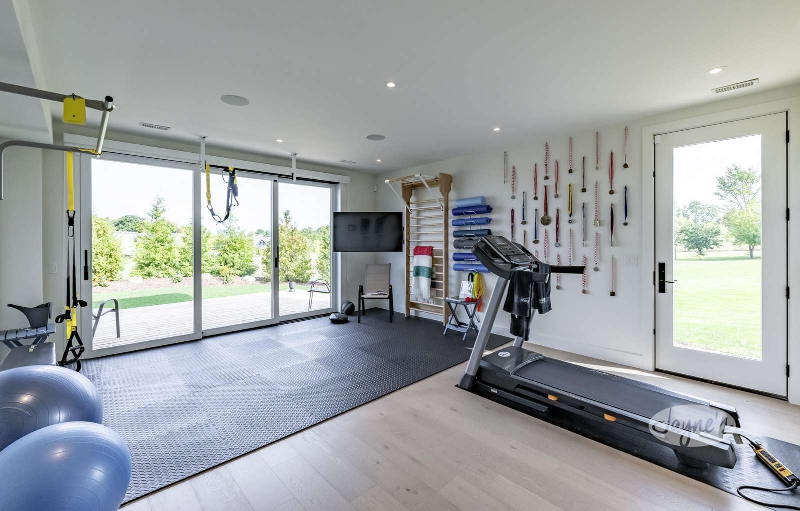 Gym with treadmill, 2 TRX sets, weights and other exercise equipment. Walk out to deck overlooking the golf course.