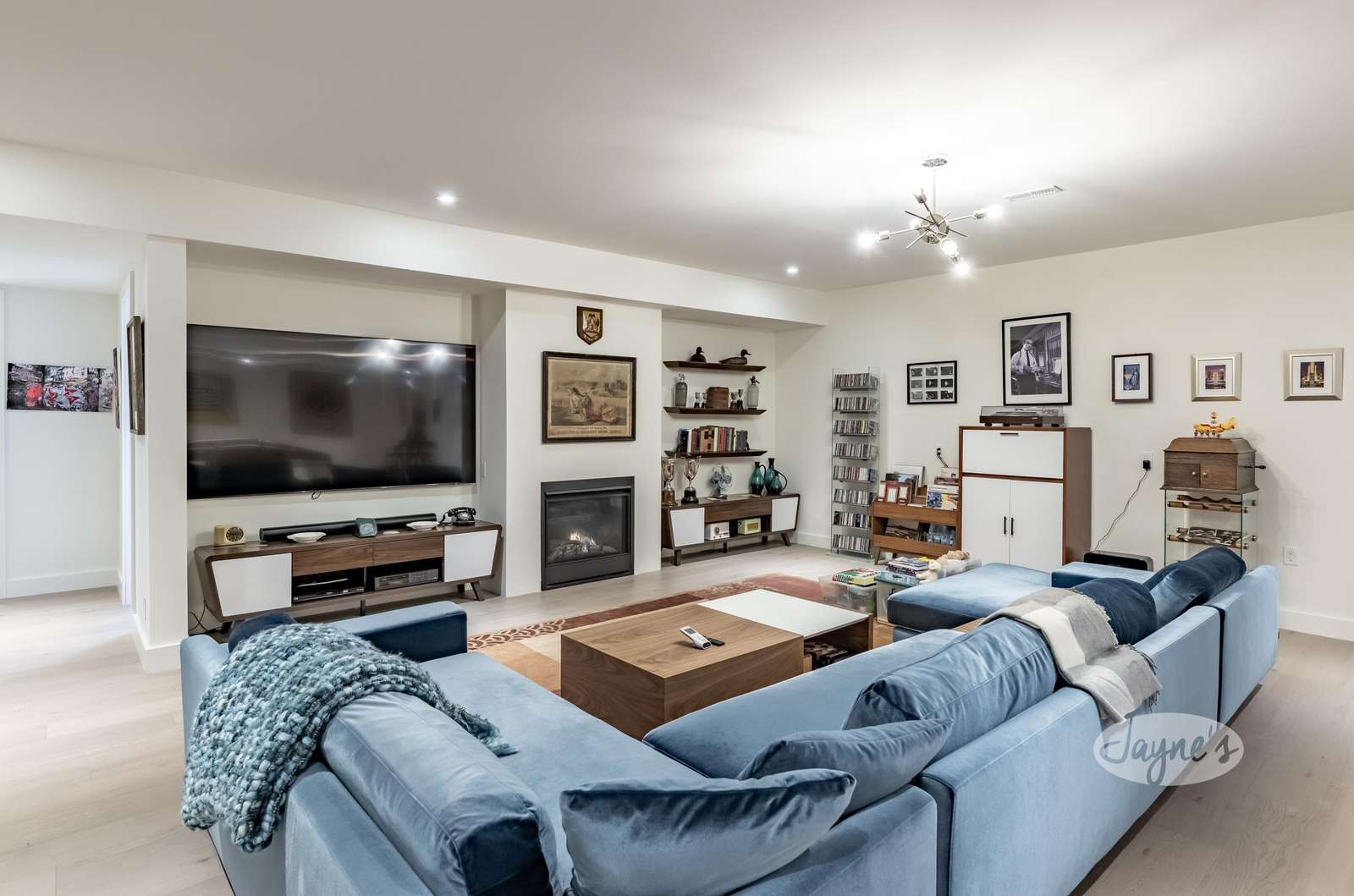 Recreation/Theatre room with large windows, big screen TV, pool table, fooseball table, hockey table, ceiling speakers, gas fireplace, and large sectional sofa.