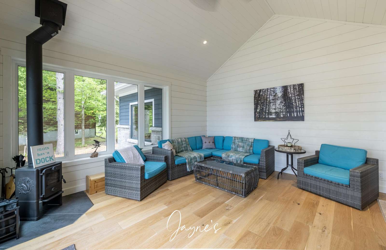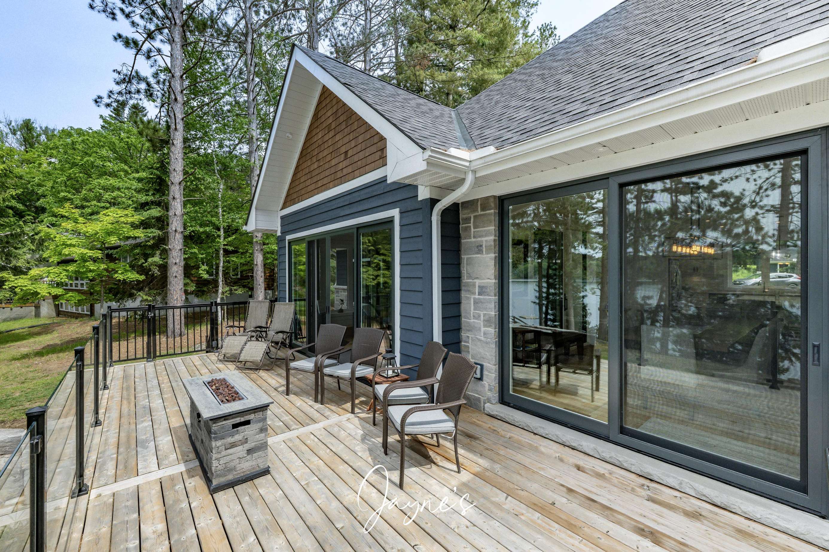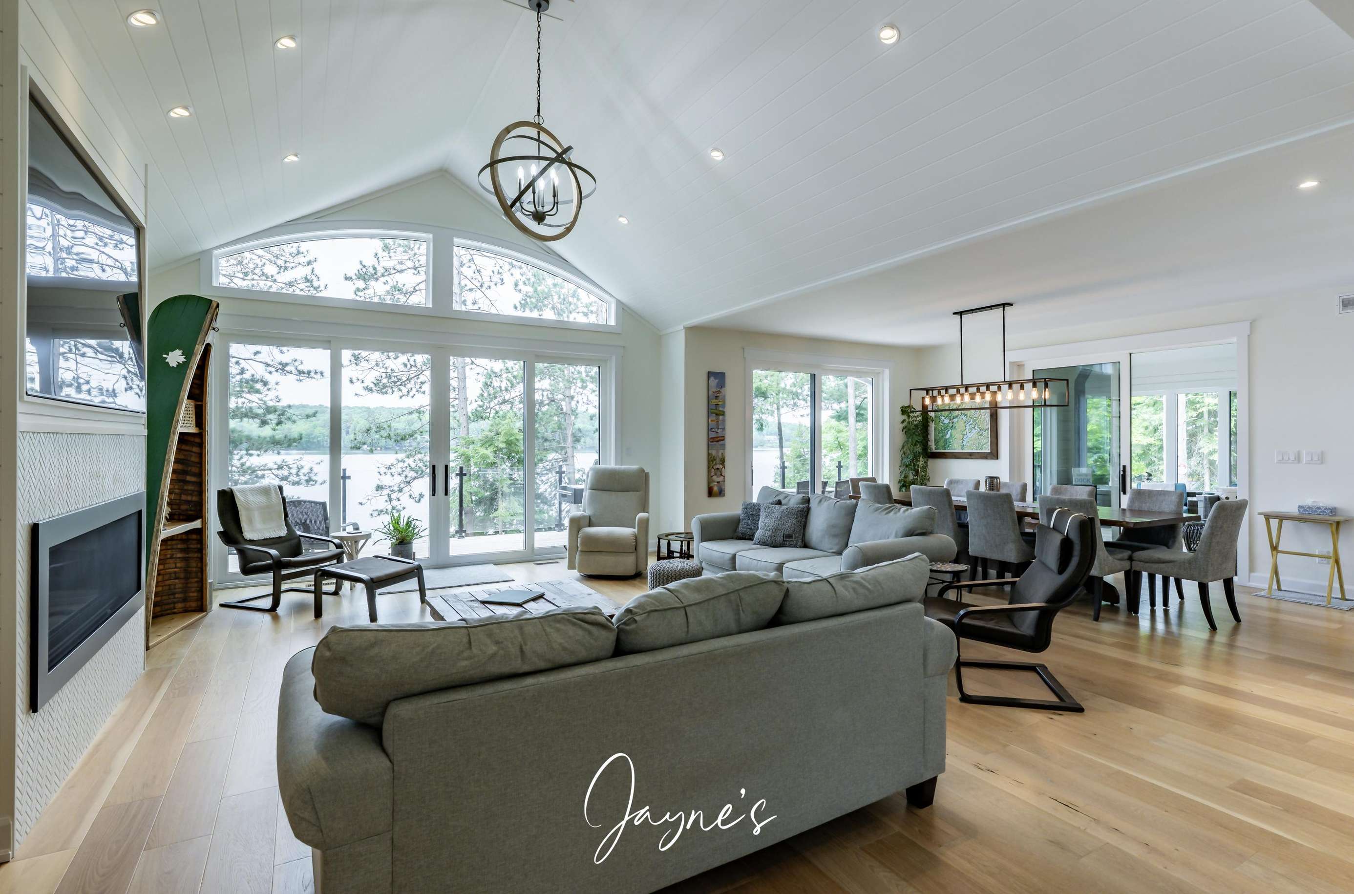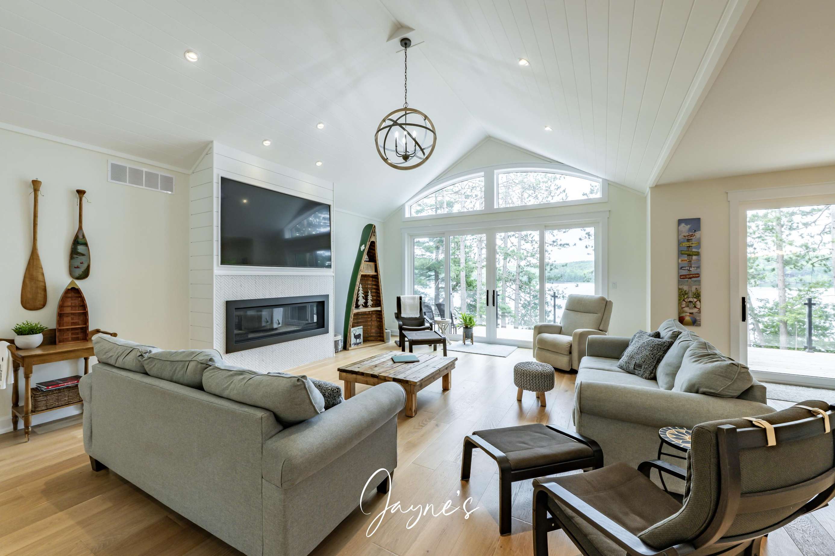 FOX POINT ESTATE - This beautifully designed cottage offers ample entertainment space, featuring a spacious great room with a large TV and access to a deck, as well as an open-concept dining and kitchen area that provides comfortable seating. The Muskoka room, equipped with a large sectional, invites you to enjoy the breeze and includes another walkout. Plenty of outdoor seating is available on the back deck for you to enjoy the peaceful view of the lake and occasional family of deer that walk by. Napoleon BBQ available for summer grilling. The flat land is perfect for outdoor activities, including a volleyball court, while steps away is the dock for boating adventures on Lake of Bays or serene sunset views. Evenings can be spent by the firepit, creating a perfect setting for stargazing and relaxation.