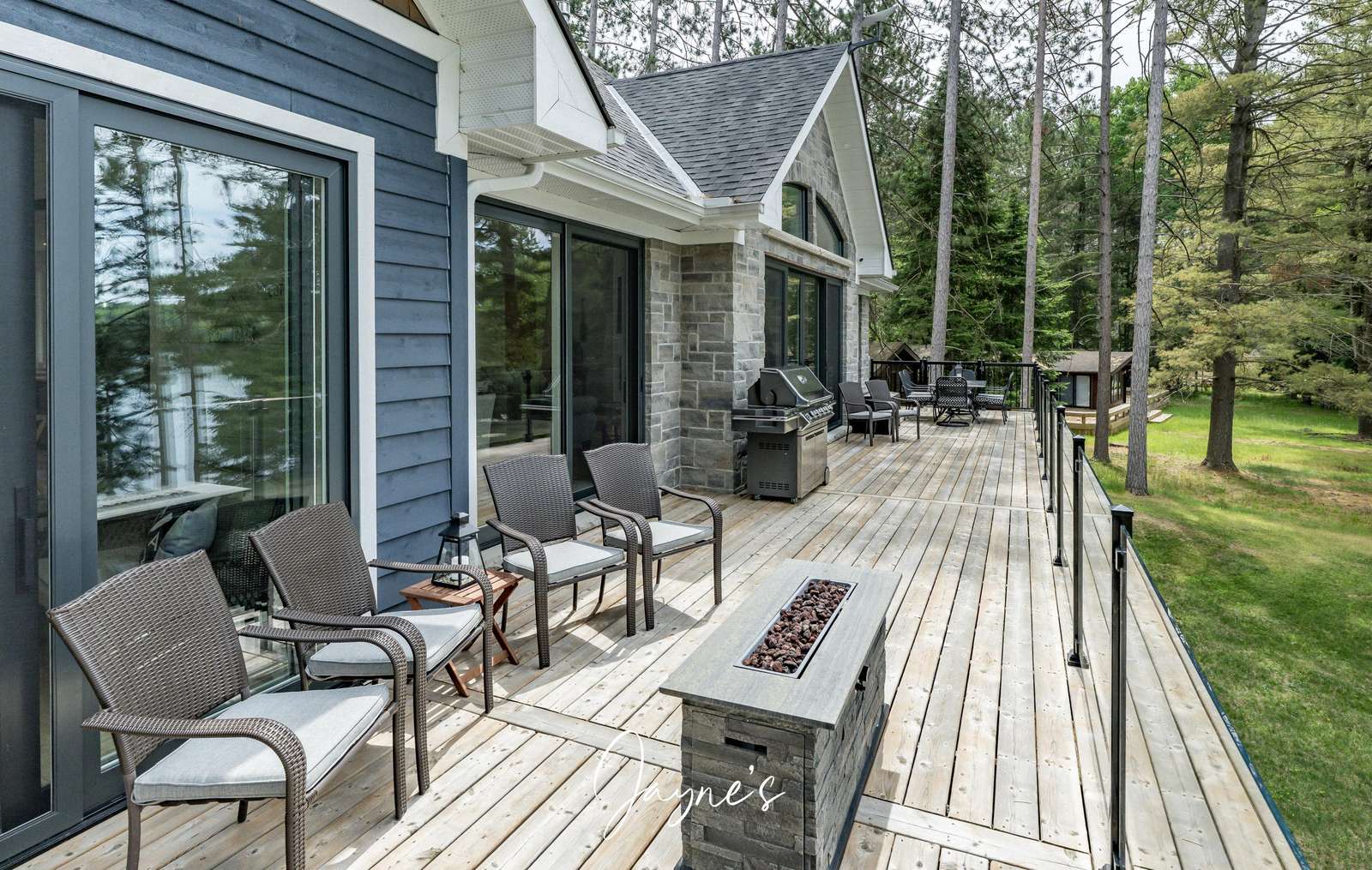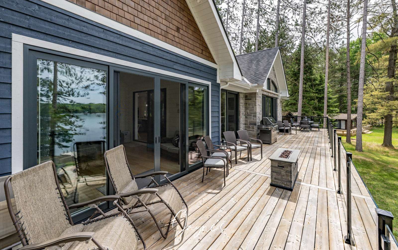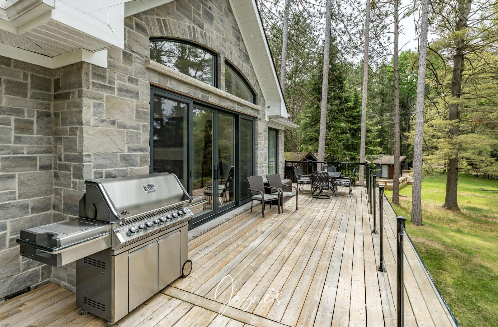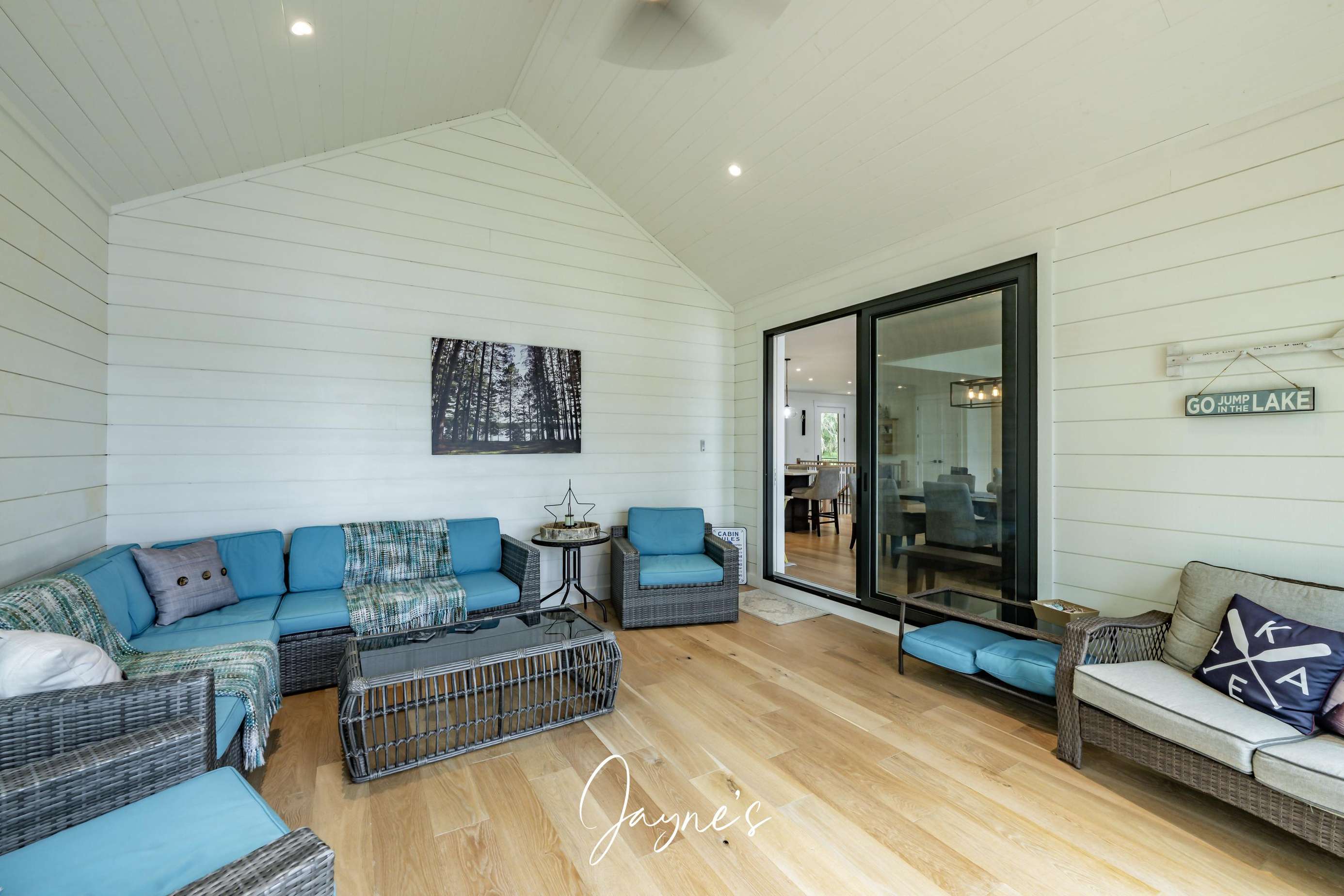 FOX POINT ESTATE - This beautifully designed cottage offers ample entertainment space, featuring a spacious great room with a large TV and access to a deck, as well as an open-concept dining and kitchen area that provides comfortable seating. The Muskoka room, equipped with a large sectional, invites you to enjoy the breeze and includes another walkout. Plenty of outdoor seating is available on the back deck for you to enjoy the peaceful view of the lake and occasional family of deer that walk by. Napoleon BBQ available for summer grilling. The flat land is perfect for outdoor activities, including a volleyball court, while steps away is the dock for boating adventures on Lake of Bays or serene sunset views. Evenings can be spent by the firepit, creating a perfect setting for stargazing and relaxation.