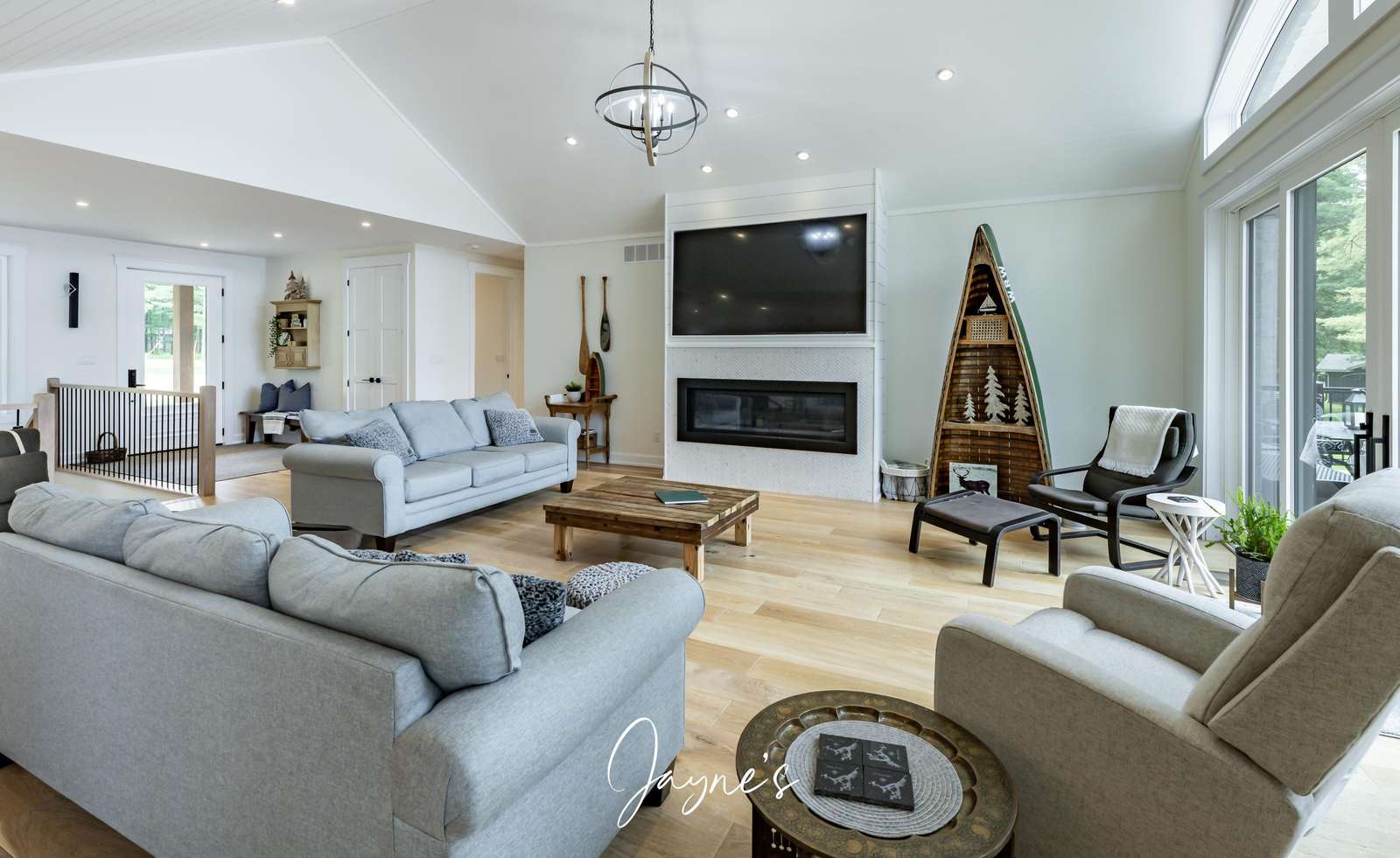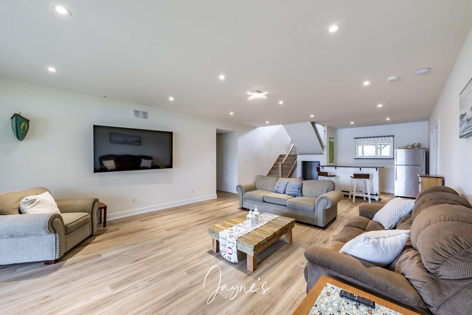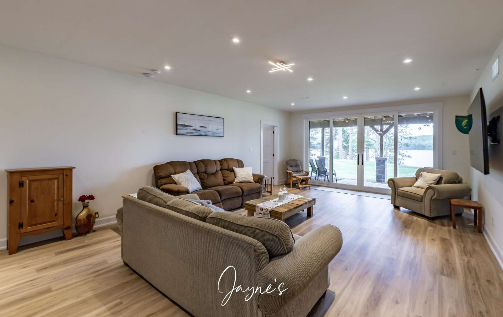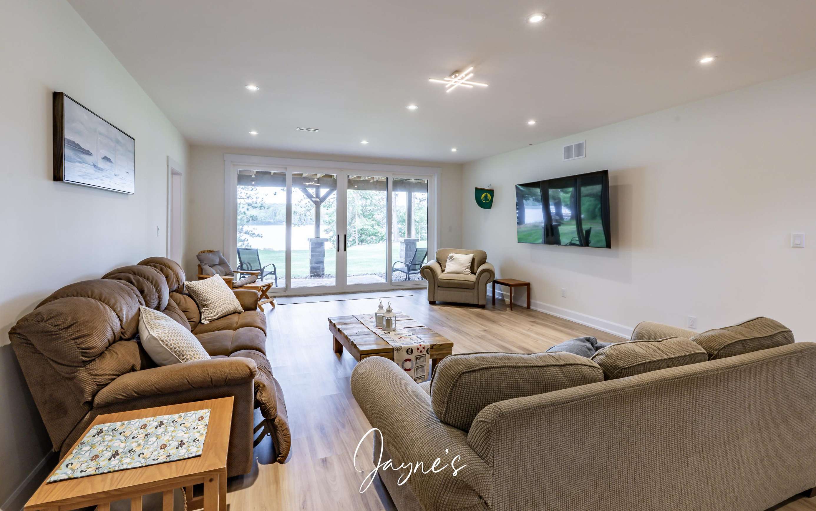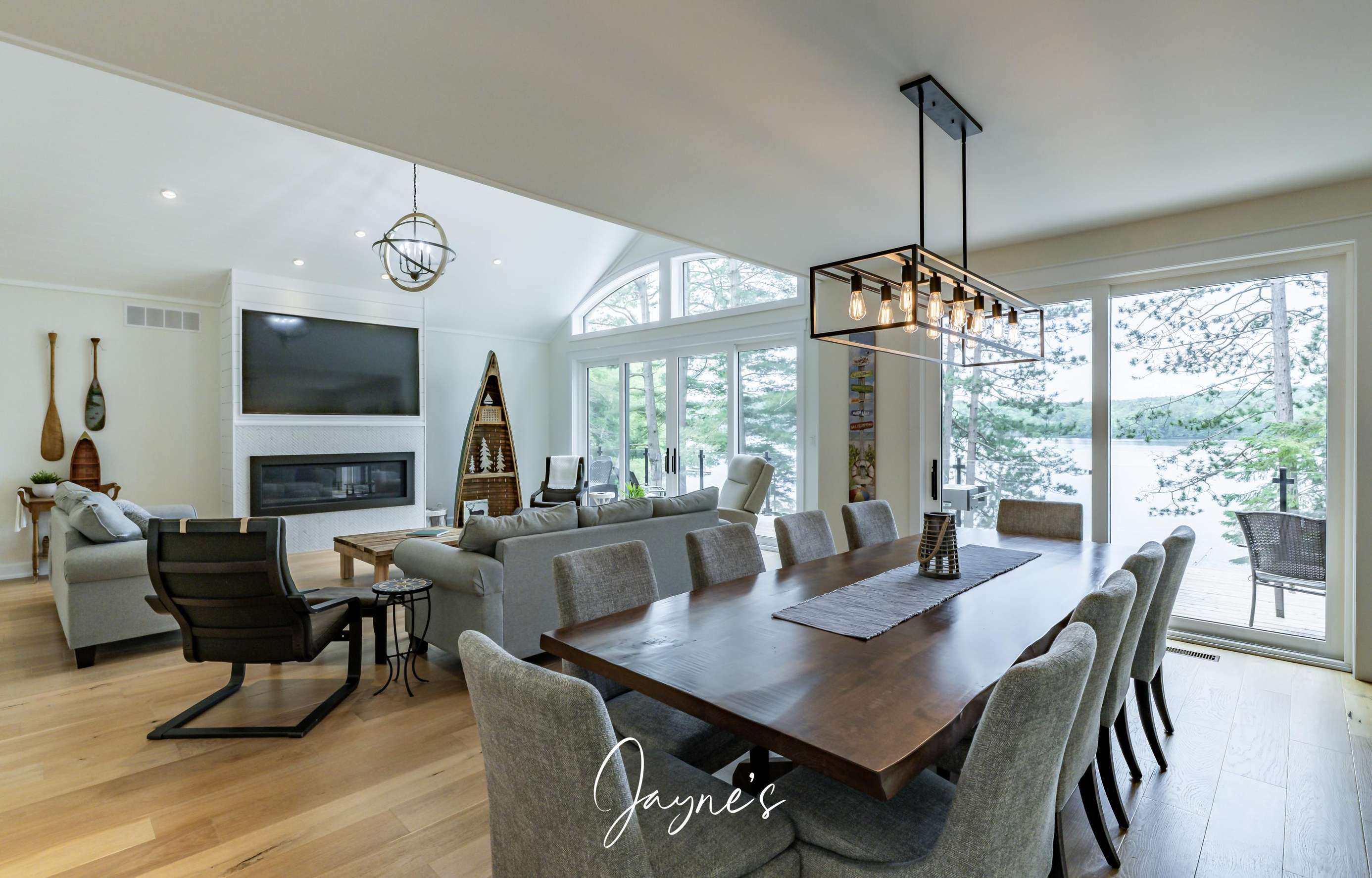FOX POINT ESTATE - This beautifully designed cottage offers ample entertainment space, featuring a spacious great room with a large TV and access to a deck, as well as an open-concept dining and kitchen area that provides comfortable seating. The Muskoka room, equipped with a large sectional, invites you to enjoy the breeze and includes another walkout. Plenty of outdoor seating is available on the back deck for you to enjoy the peaceful view of the lake and occasional family of deer that walk by. Napoleon BBQ available for summer grilling. The flat land is perfect for outdoor activities, including a volleyball court, while steps away is the dock for boating adventures on Lake of Bays or serene sunset views. Evenings can be spent by the firepit, creating a perfect setting for stargazing and relaxation.