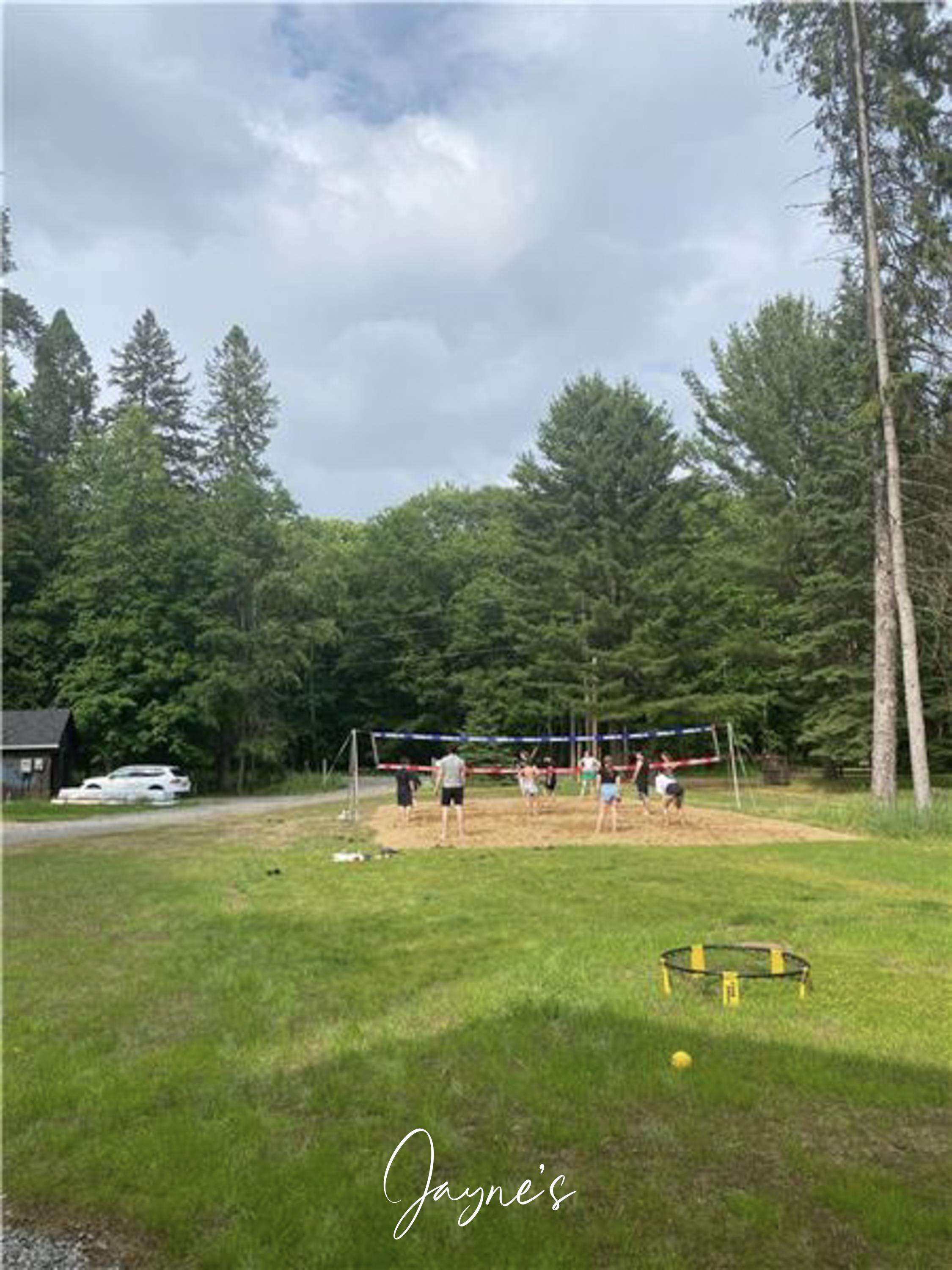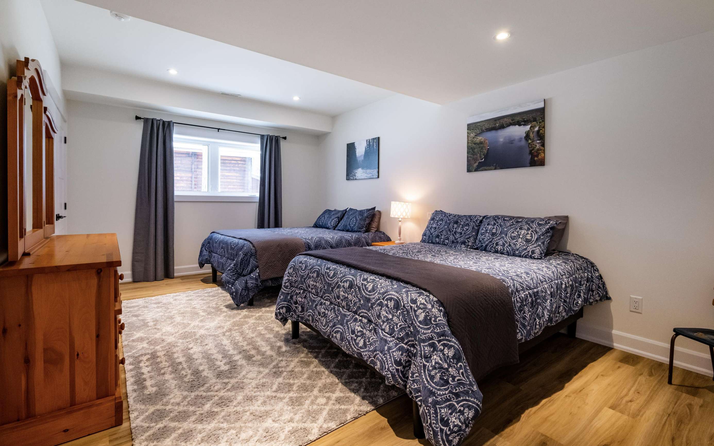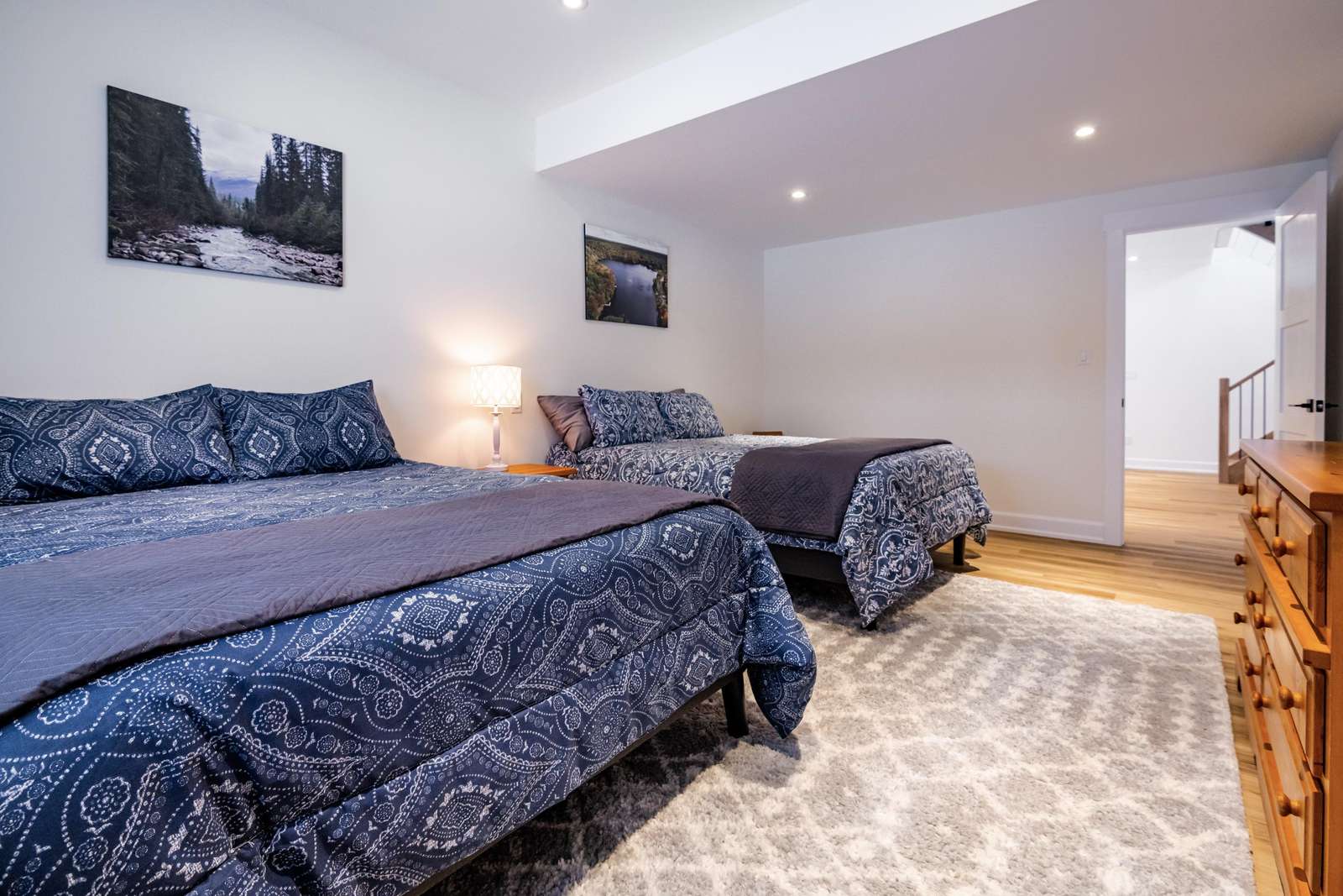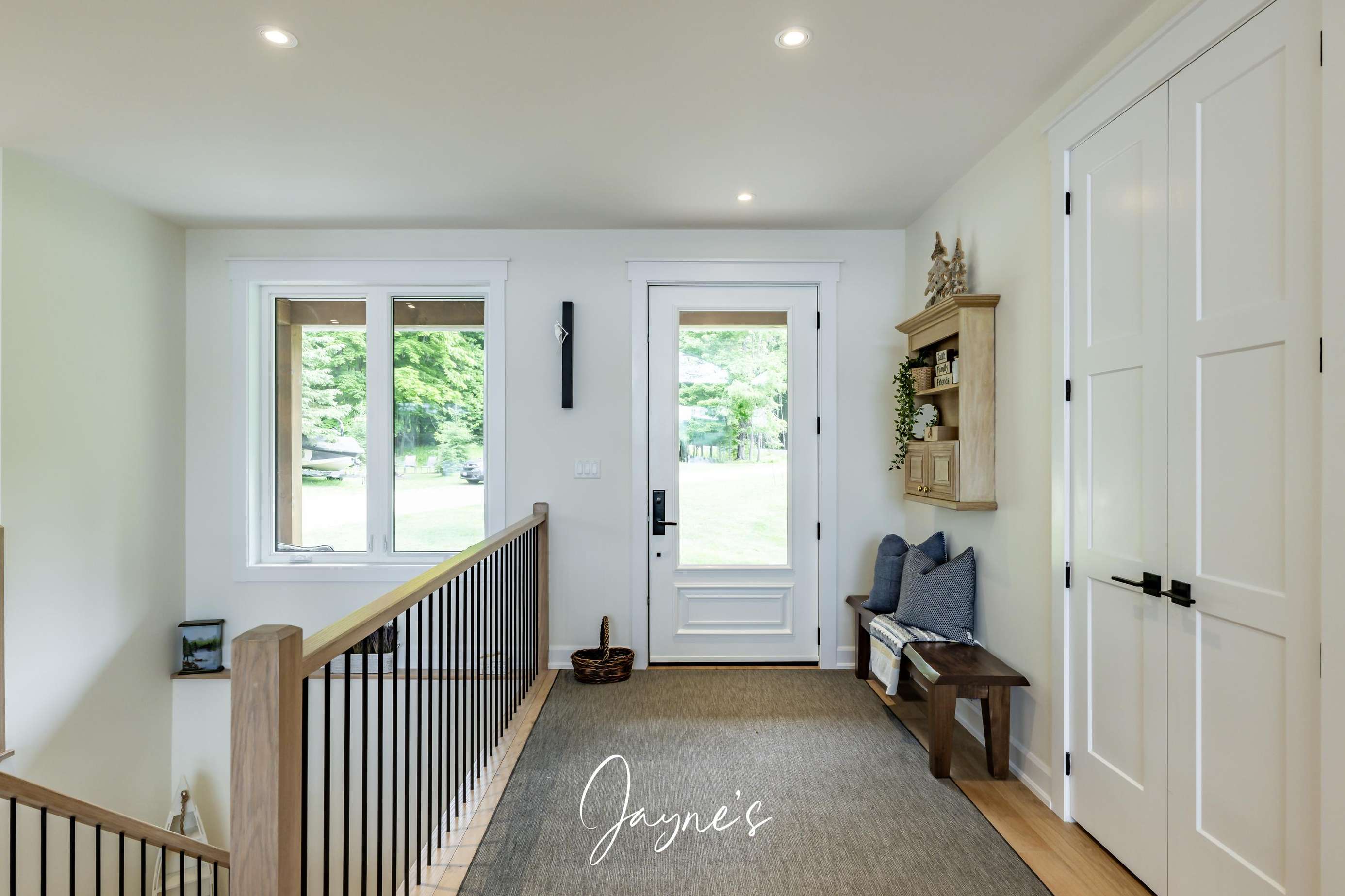 FOX POINT ESTATE - This beautifully designed cottage offers ample entertainment space, featuring a spacious great room with a large TV and access to a deck, as well as an open-concept dining and kitchen area that provides comfortable seating. The Muskoka room, equipped with a large sectional, invites you to enjoy the breeze and includes another walkout. Plenty of outdoor seating is available on the back deck for you to enjoy the peaceful view of the lake and occasional family of deer that walk by. Napoleon BBQ available for summer grilling. The flat land is perfect for outdoor activities, including a volleyball court, while steps away is the dock for boating adventures on Lake of Bays or serene sunset views. Evenings can be spent by the firepit, creating a perfect setting for stargazing and relaxation.
