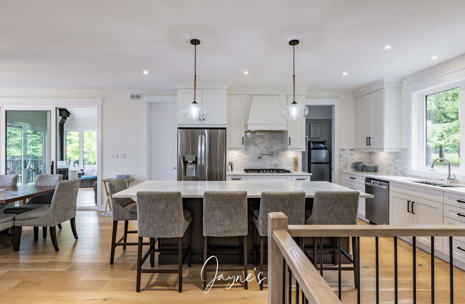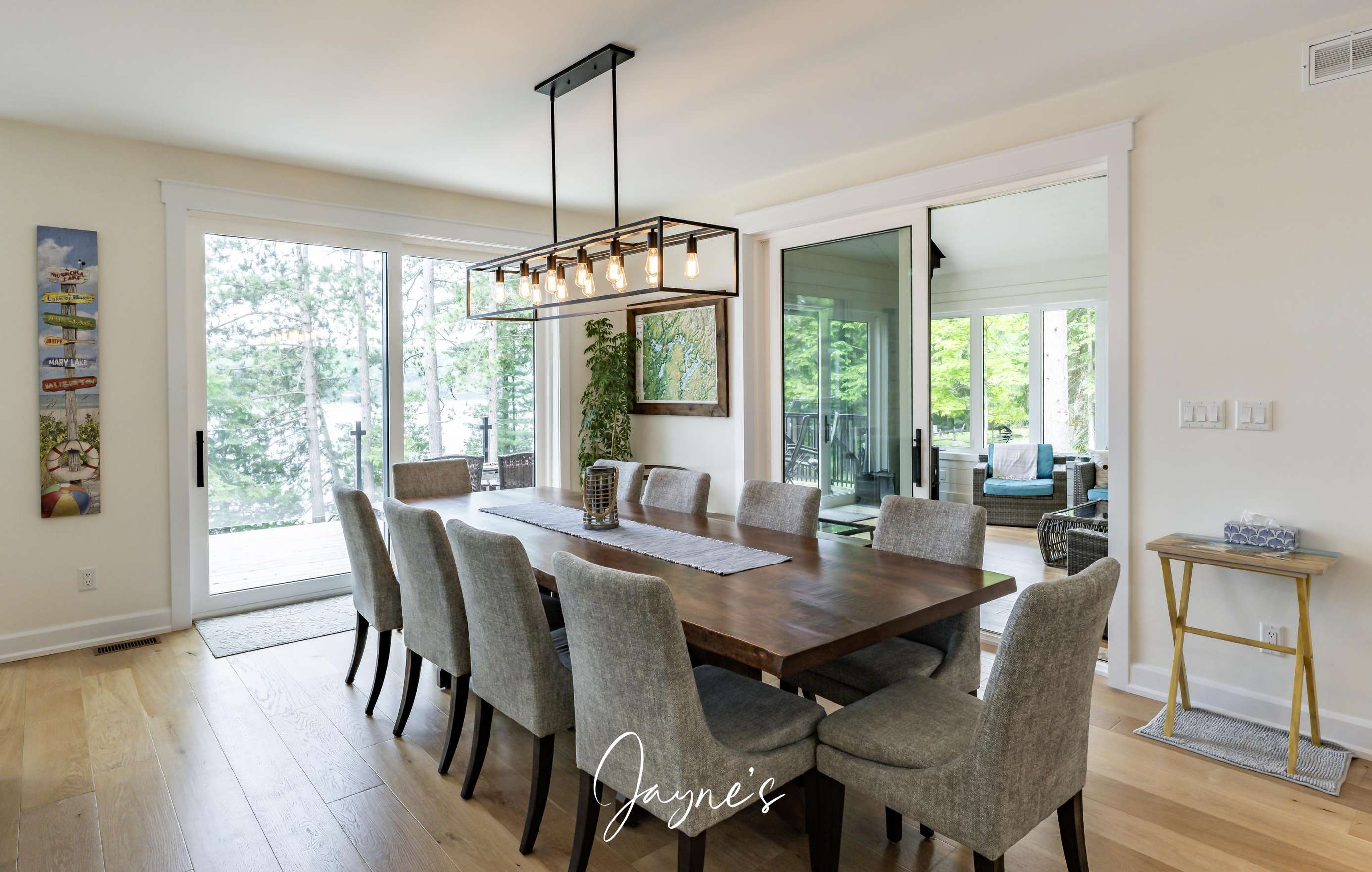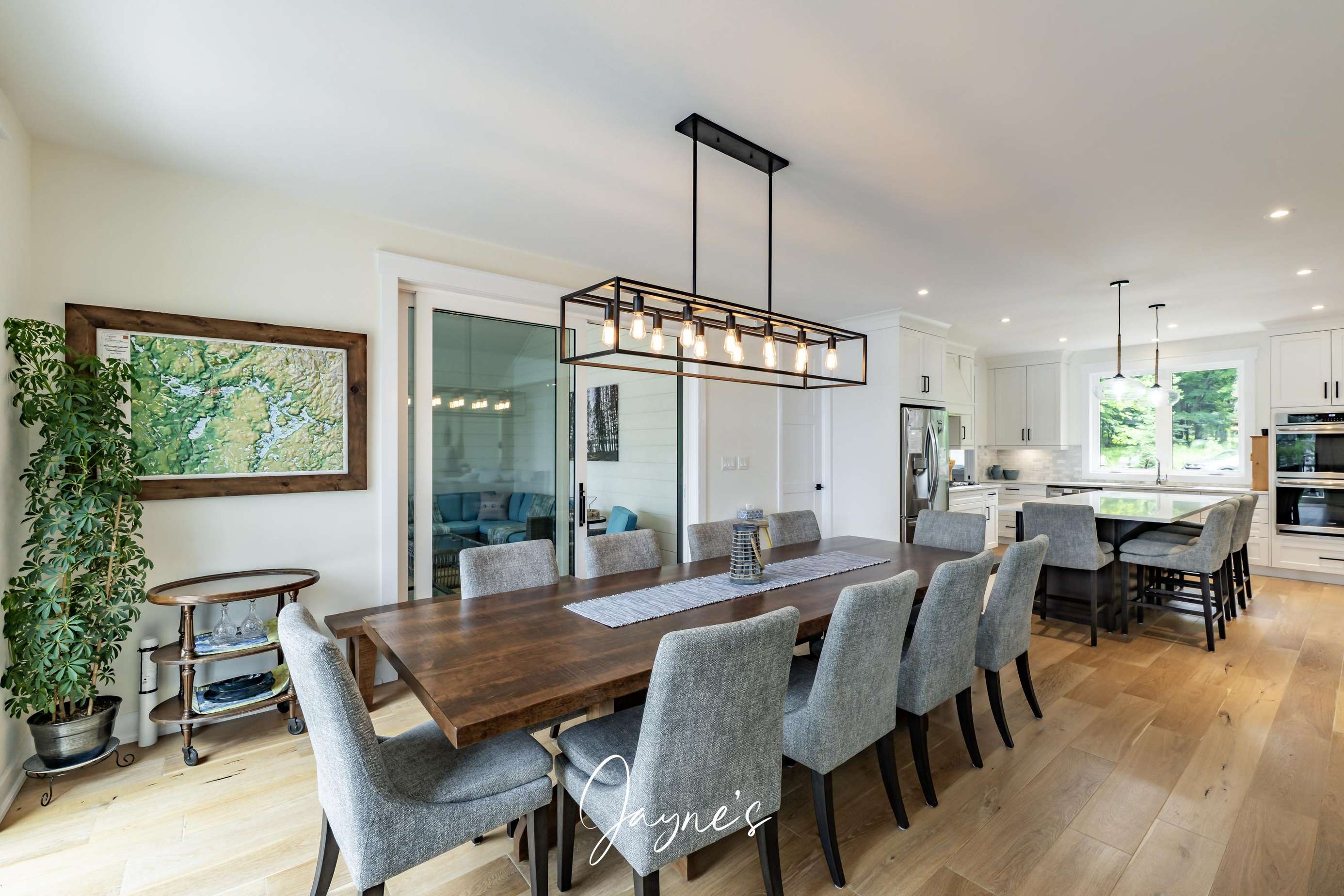 Dining room with comfortable seating for 12 at the harvest table and more seating around the kitchen island., plenty of light and a walkout to the deck and Muskoka room