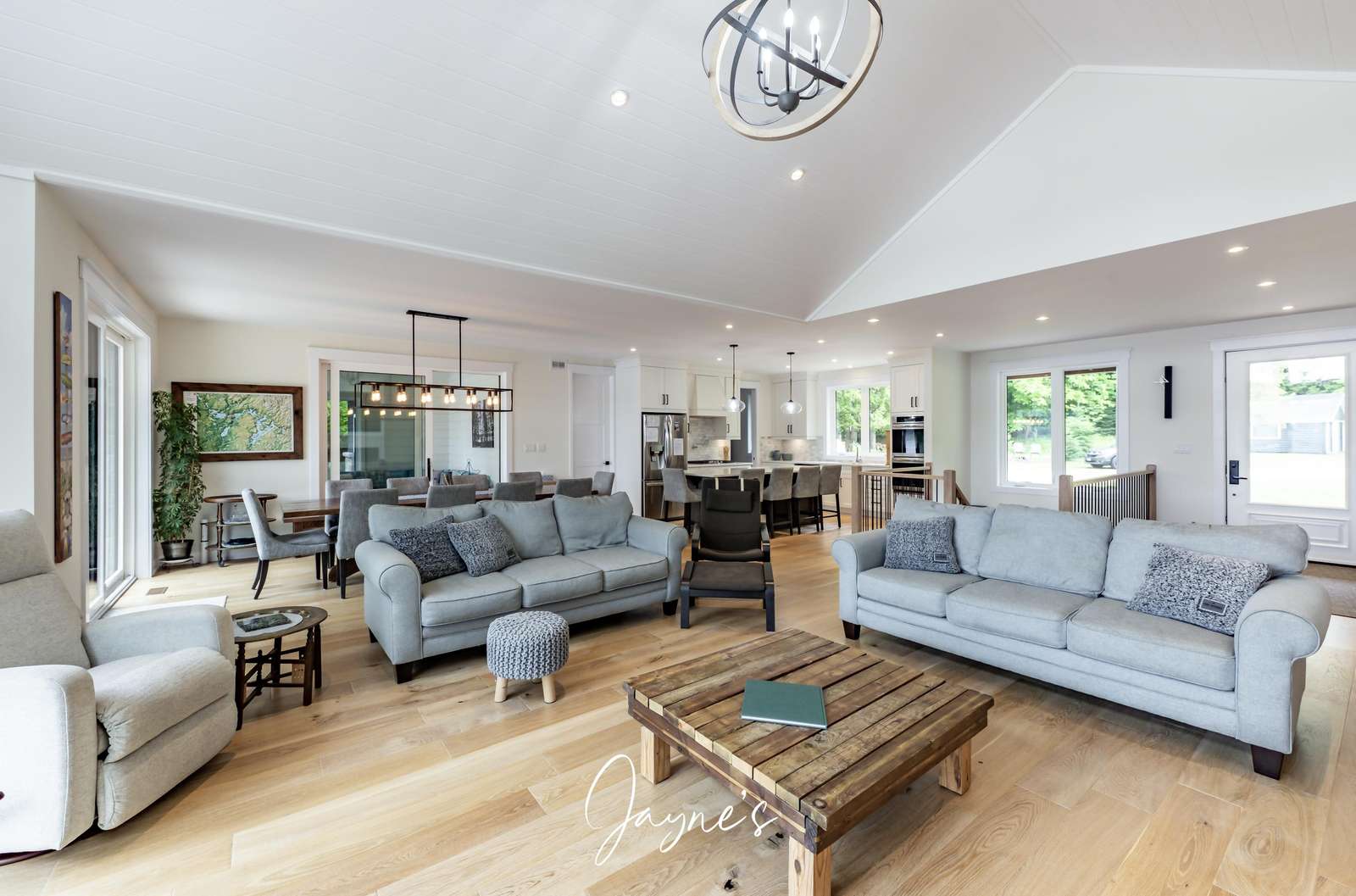 Vaulted ceilings with 2 3-seater sofas, fireplace, TV, 5 comfy chairs with walkout large glass railing deck