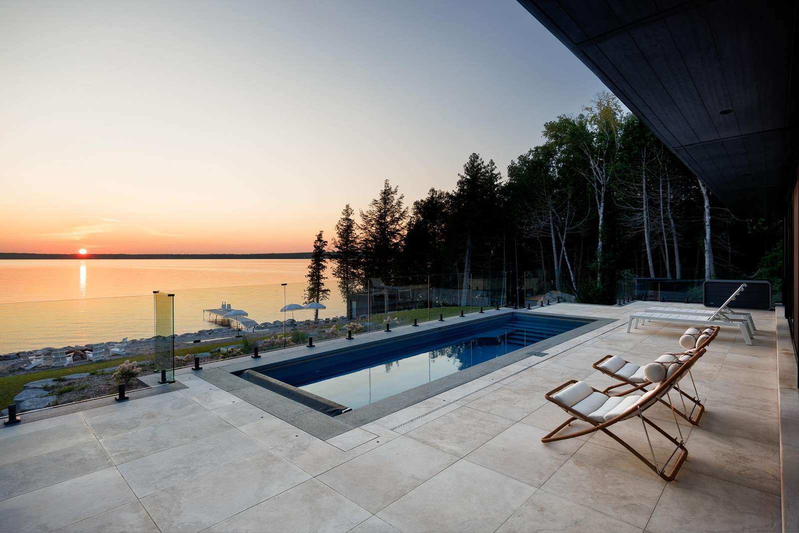 GEORGIAN BAY LAKEHOUSE - Newly built cottage on very private 230ft of waterfront. Level grassy area, large beach and a dock that will reach over the rocky shoreline into Georgian Bay. Multiple outdoor seating areas including a Muskoka Room which can be fully screened in, a patio with in-ground pool, a fire-pit at the beach and of course the sauna with view on the lake.