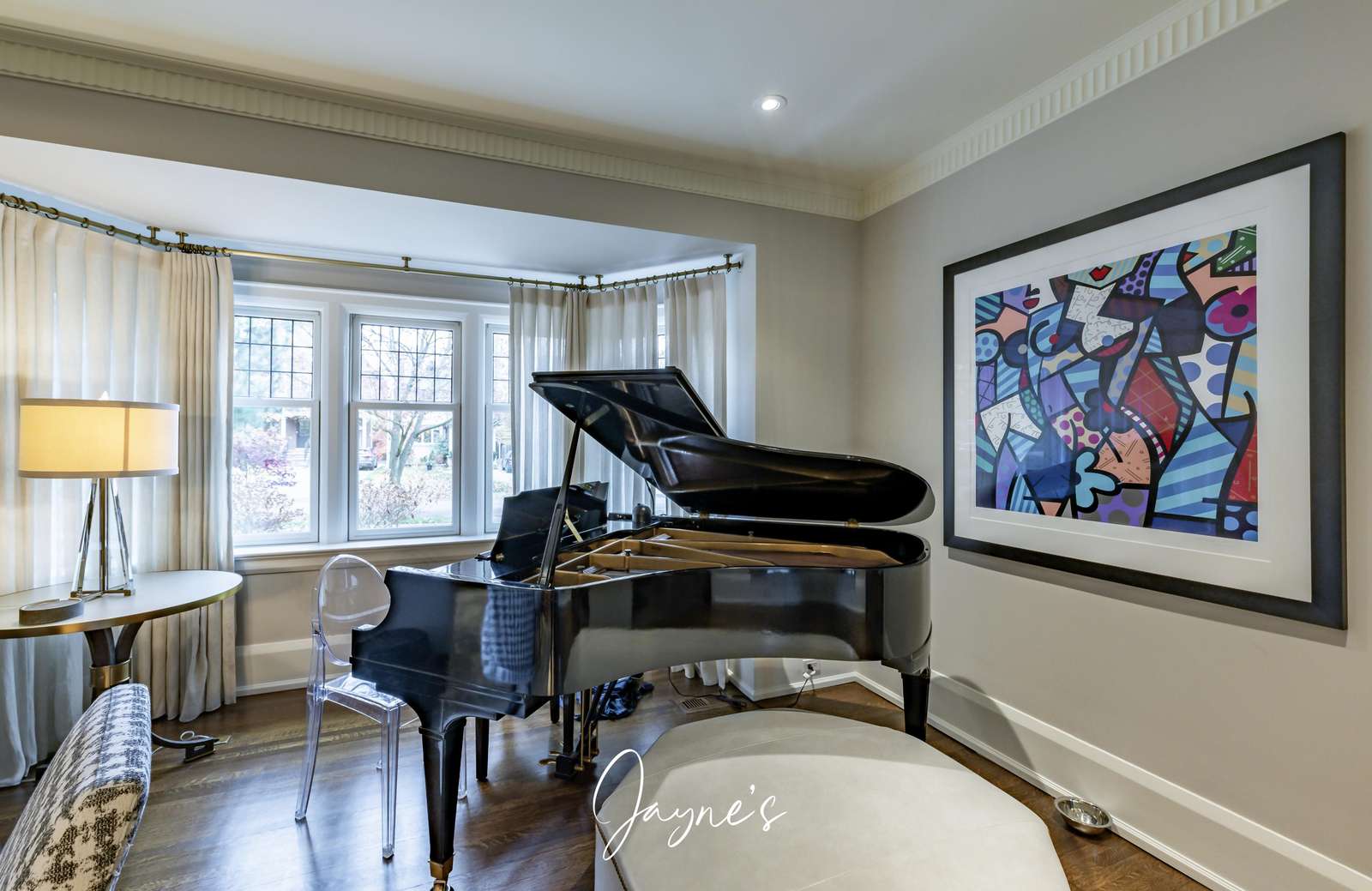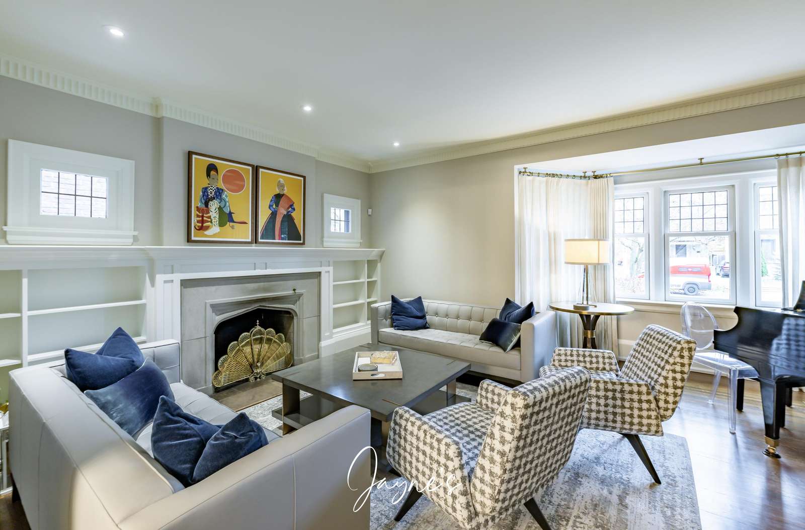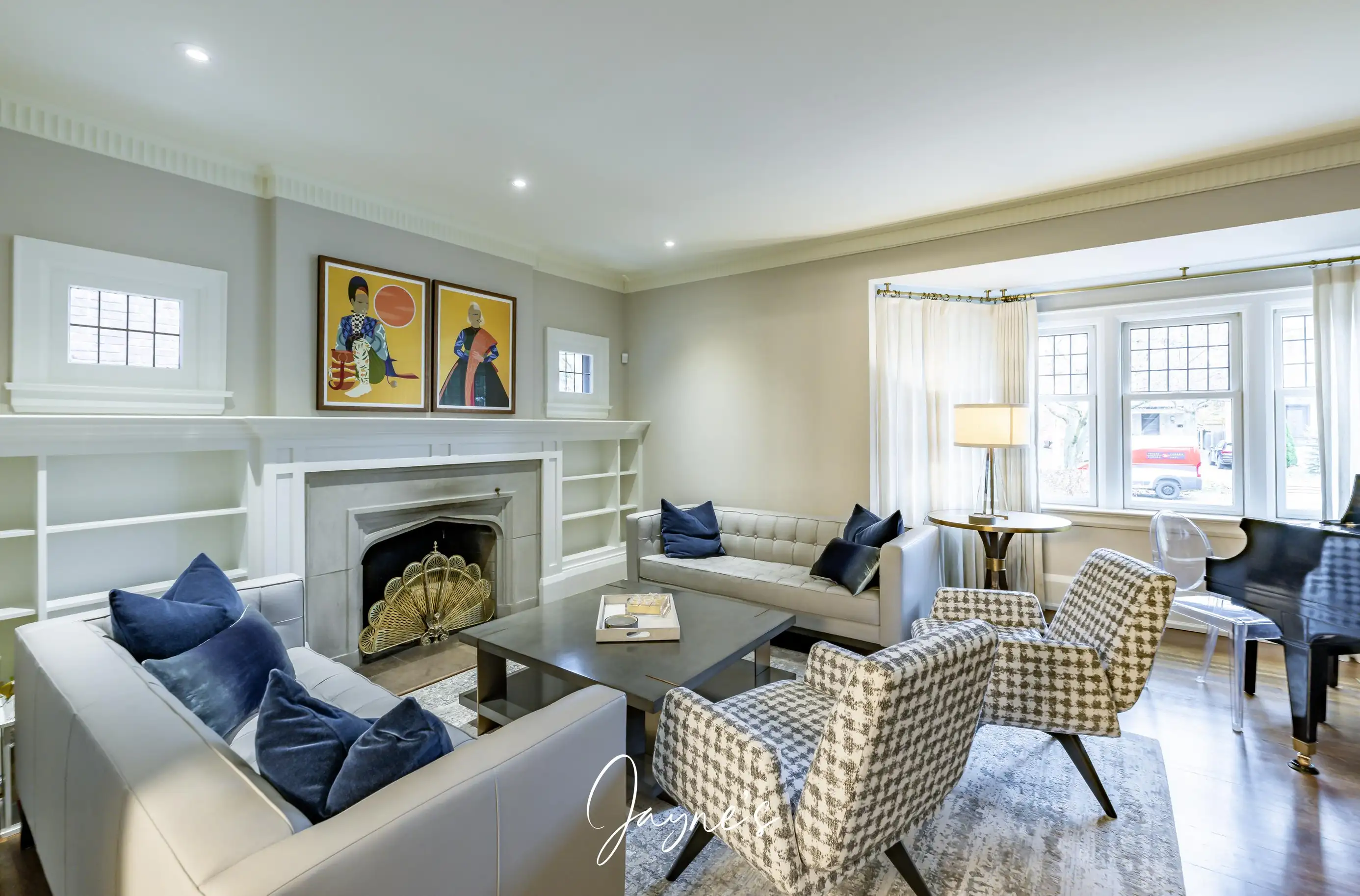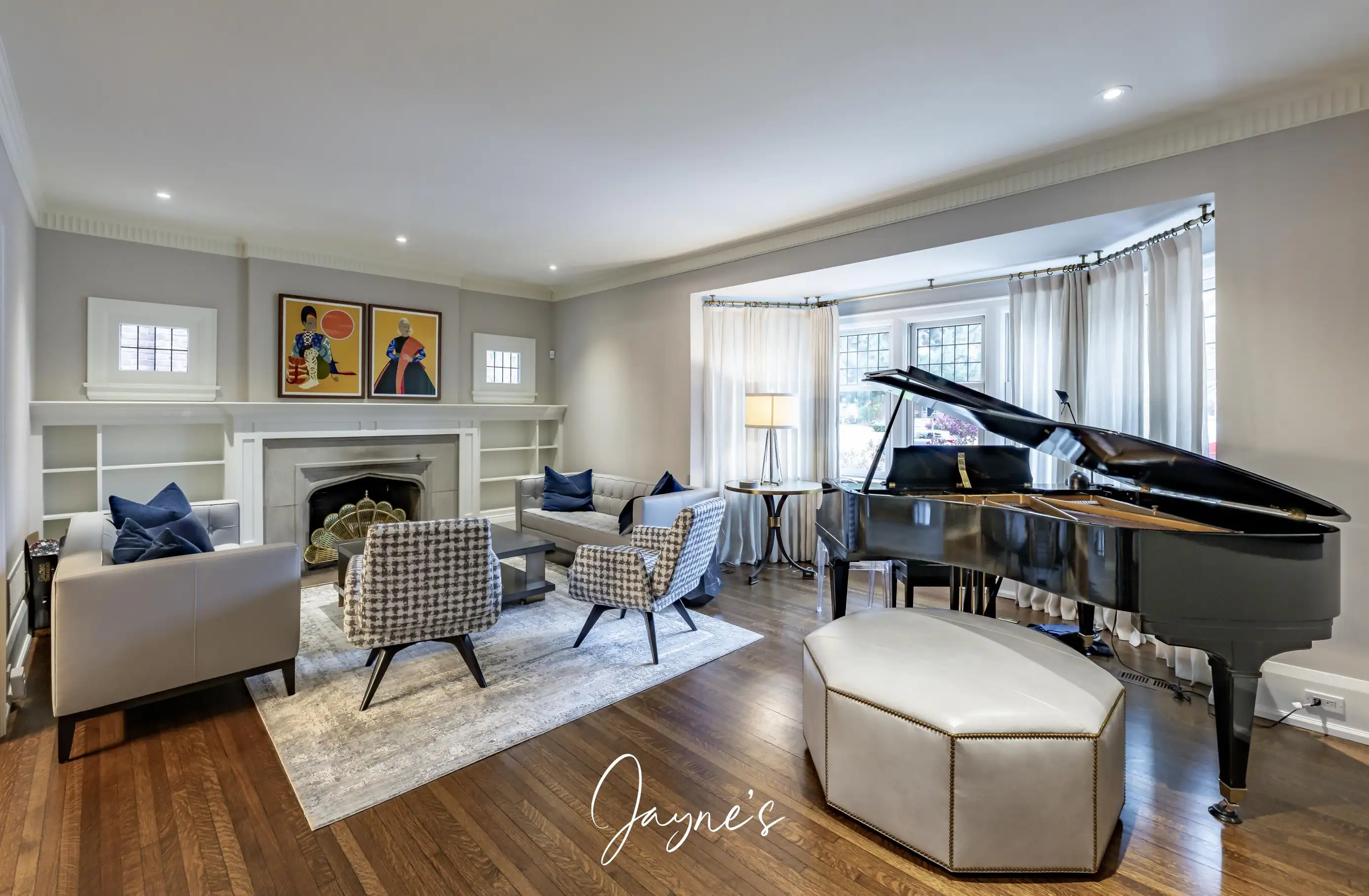 The first room of the house features a more formal space with a fireplace surrounded by two sofa's and two chairs. Also included is a baby grand piano!