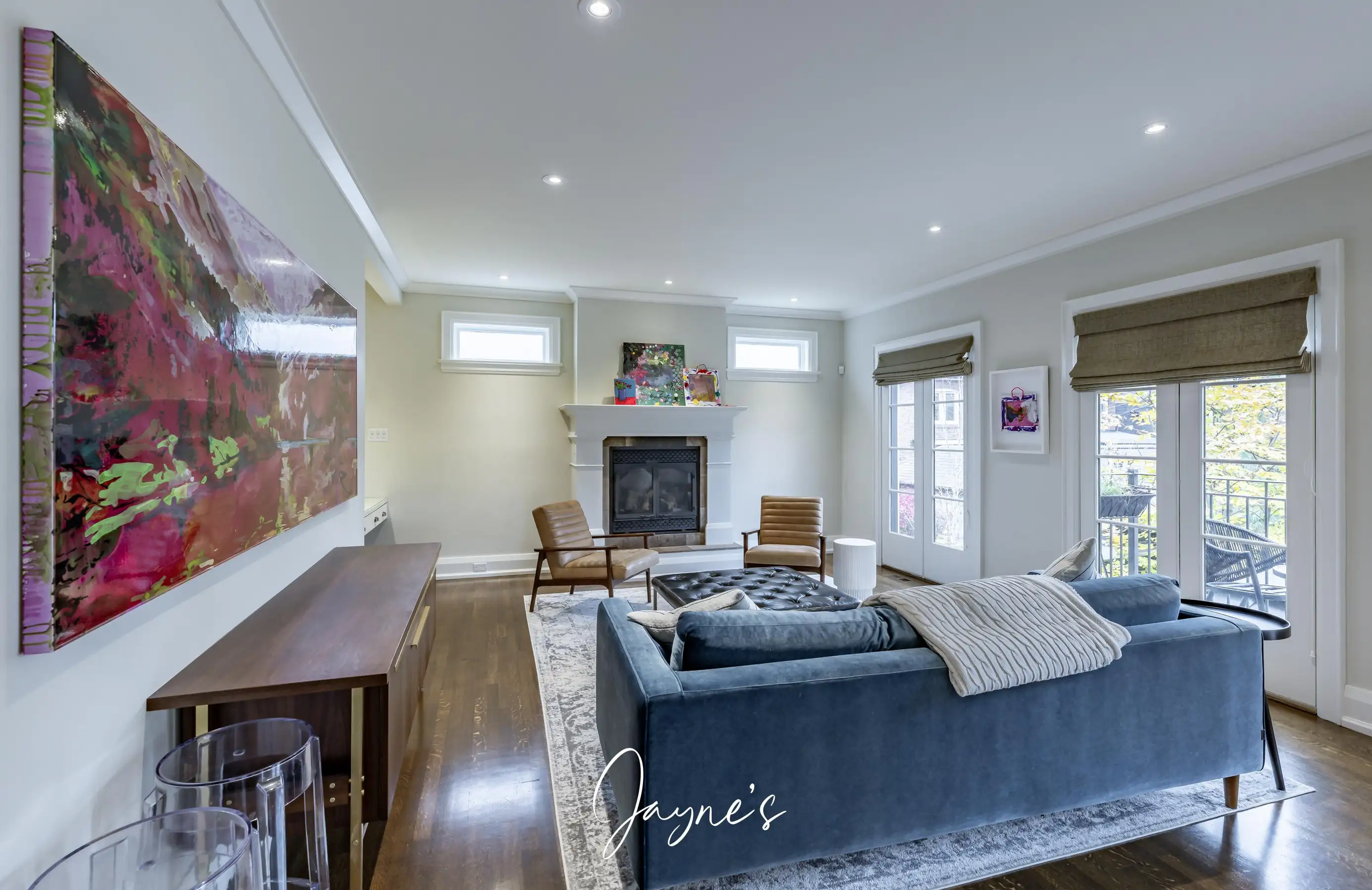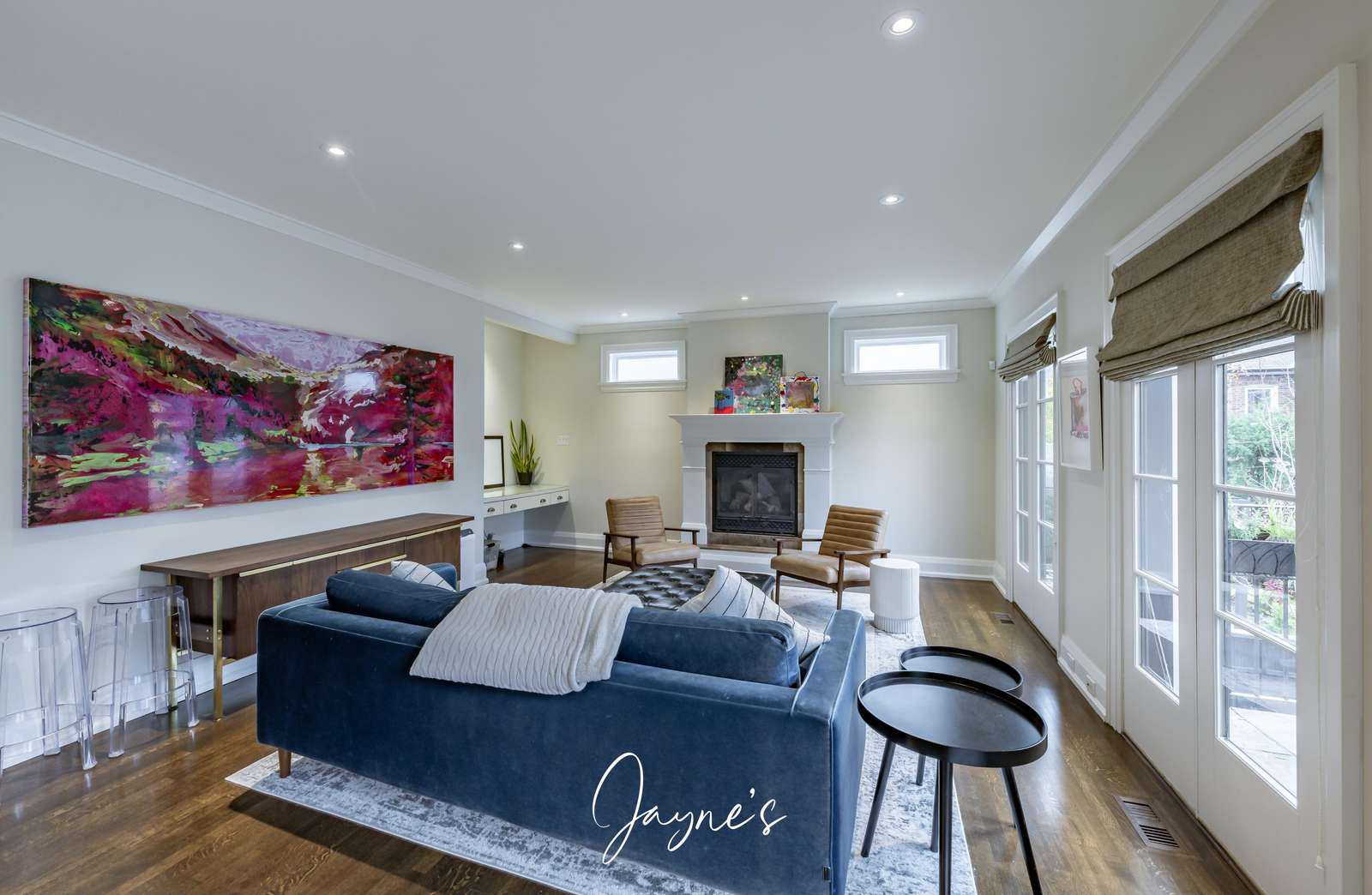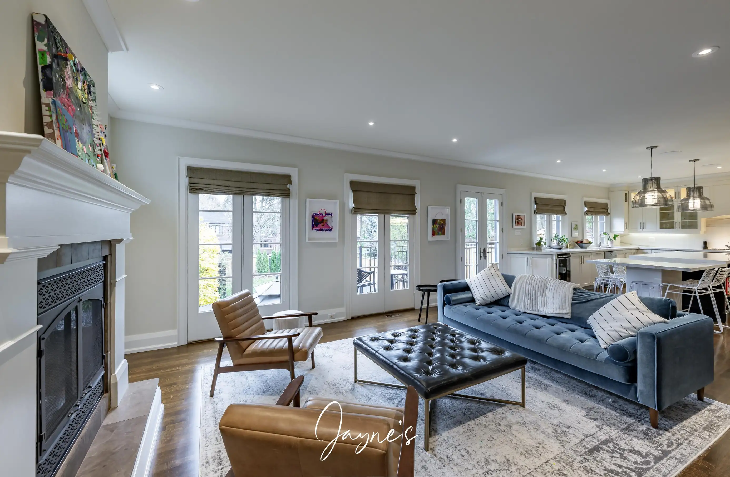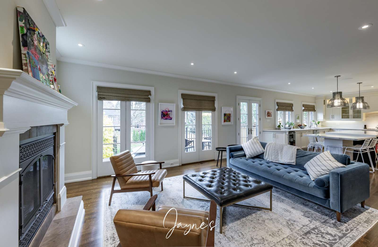 Situated in the same room as the Kitchen, the family room offers a sofa, 2 leather chairs and fireplace. Patio doors provide access to the backyard.