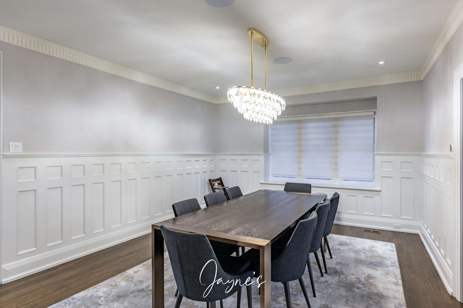 Adjacent to the living room, the romantic dining room features seating for 8 beneath a chandelier.