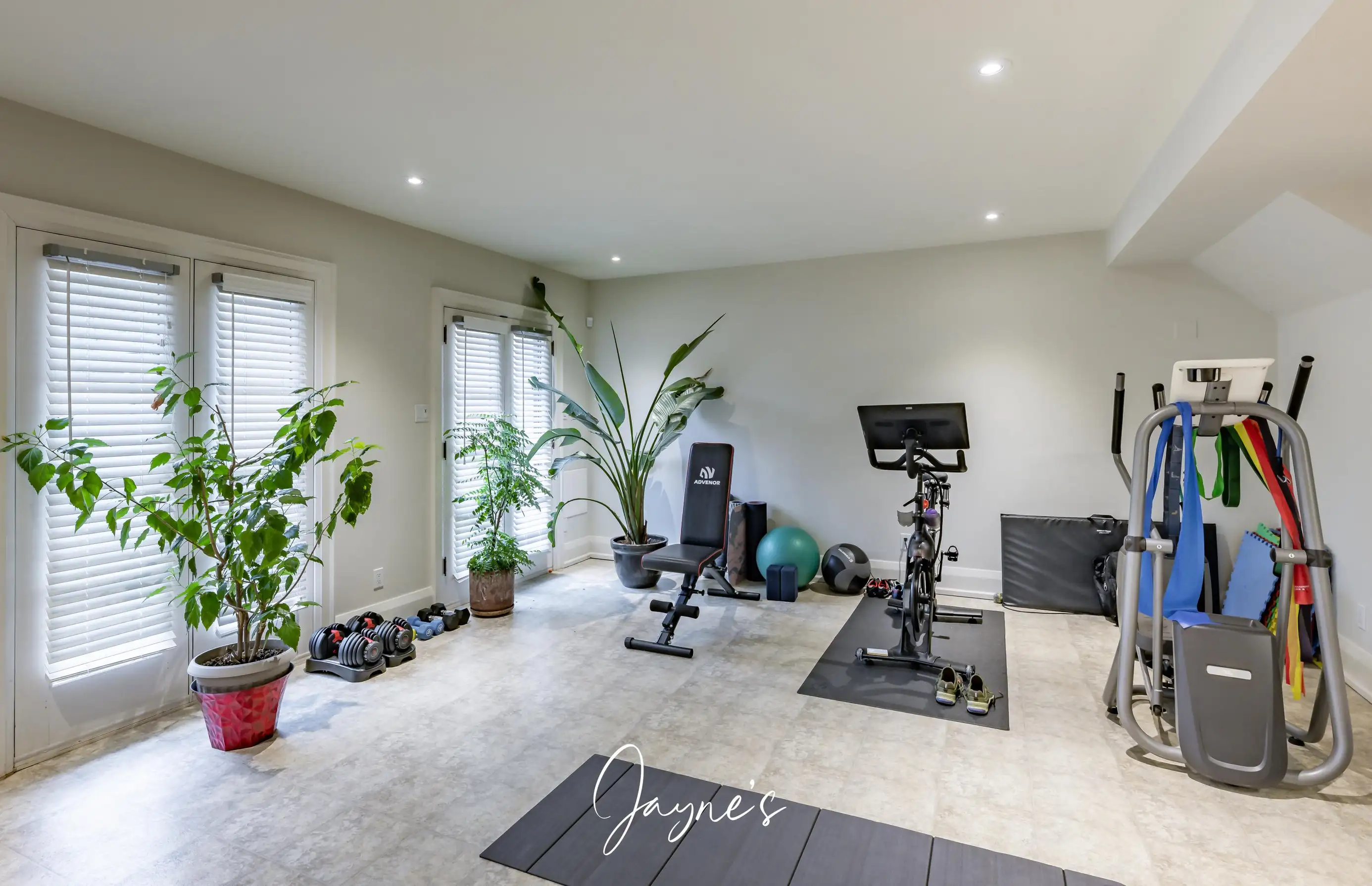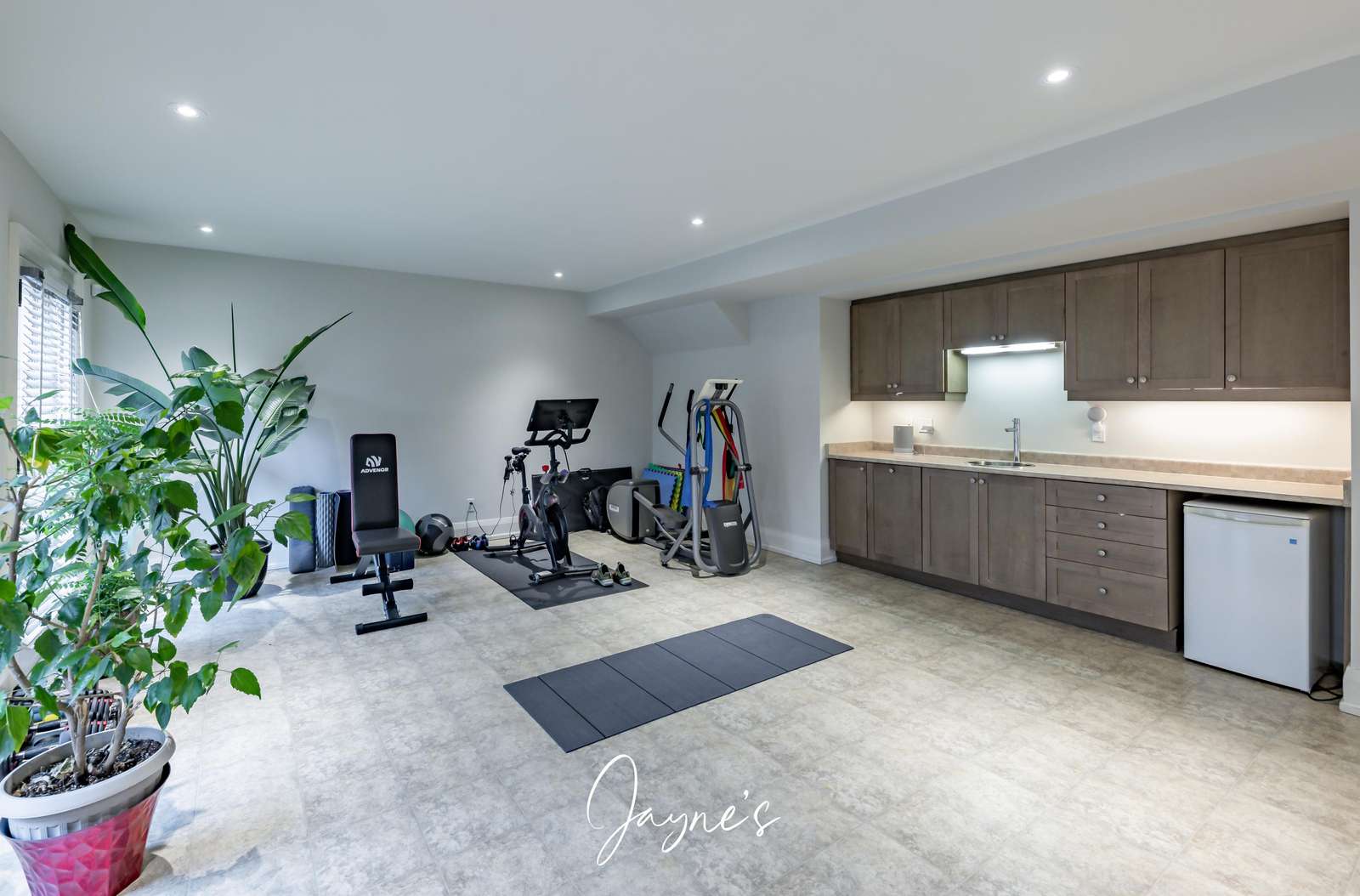 On the left, a seating area with an L-shaped sofa surrounds a TV. To the right a work out space includes a Peloton, workout bench and elliptical. Also feature is a mini bar area featuring a sink, dishwasher and mini fridge. Patio doors lead to the backyard.