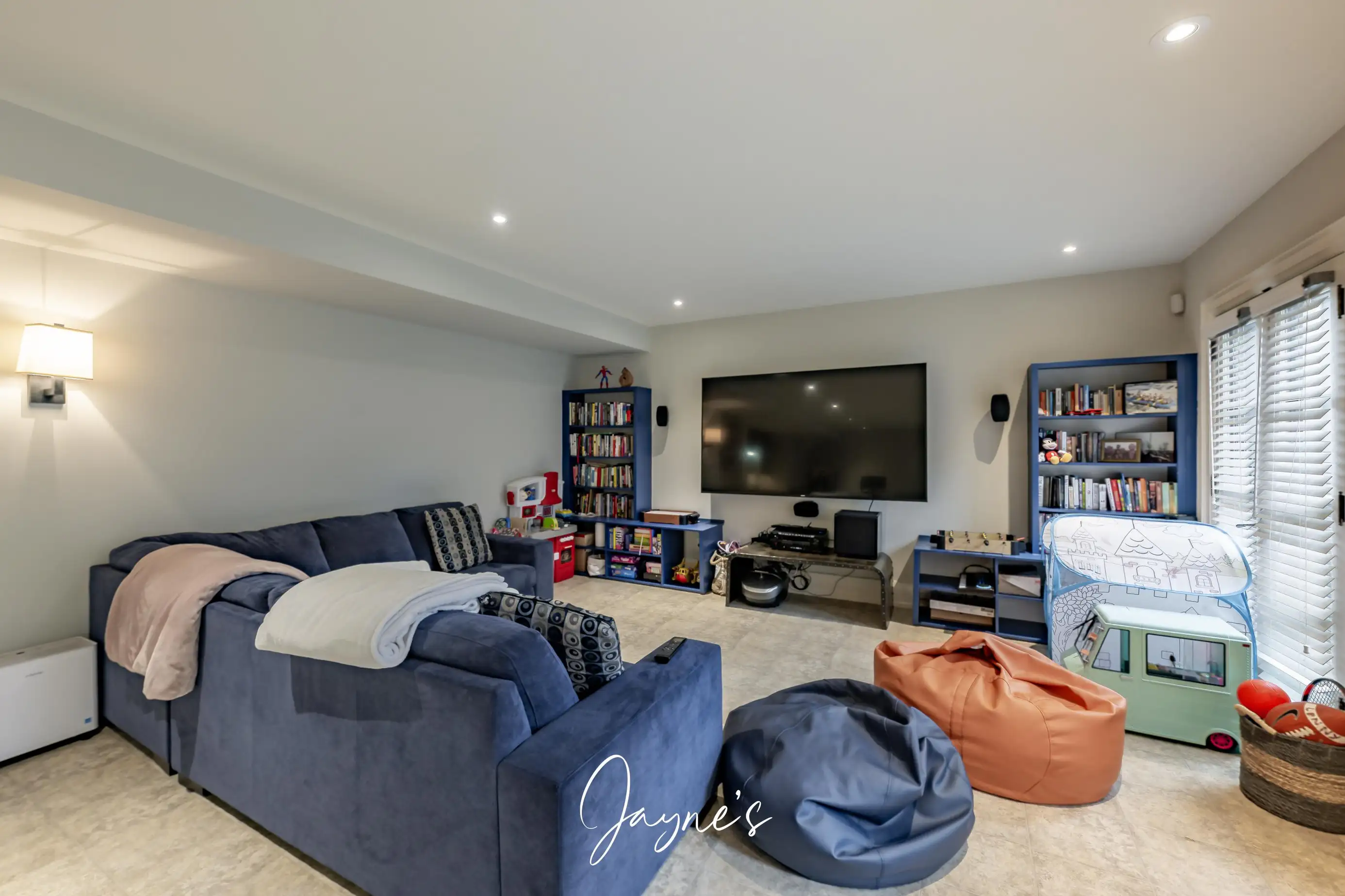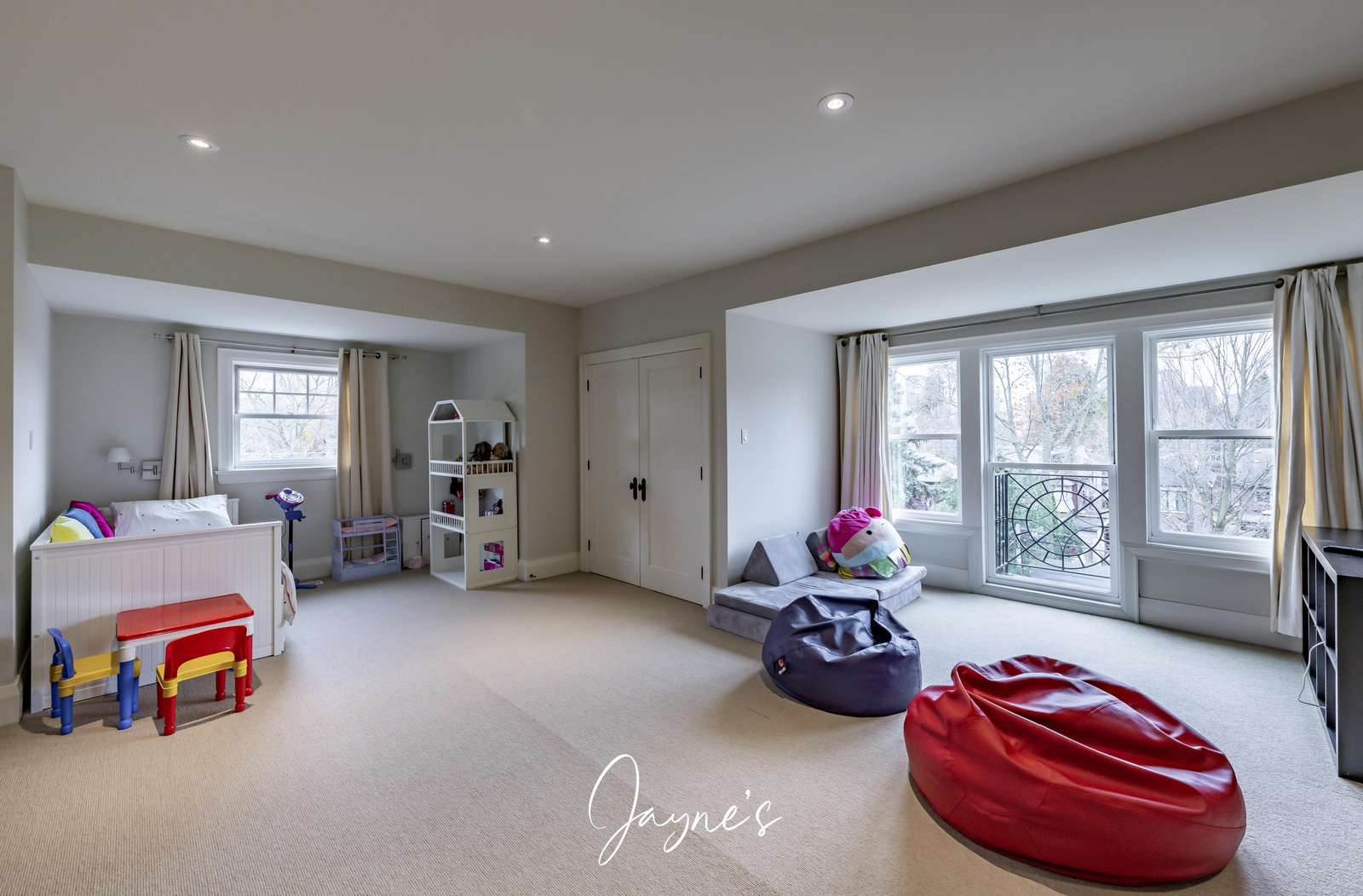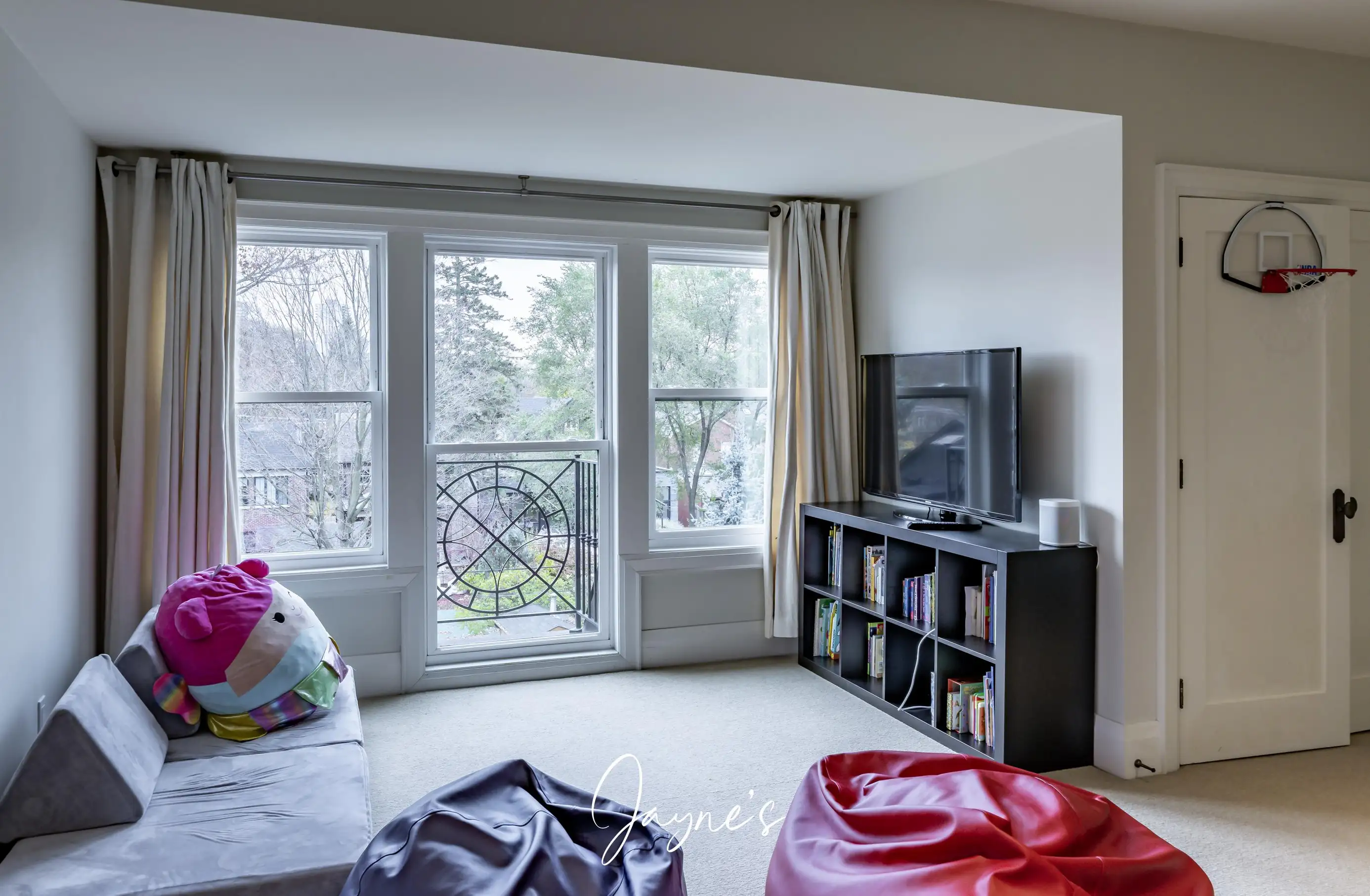 Additional bedroom / kids hangout space with TV and chairs.