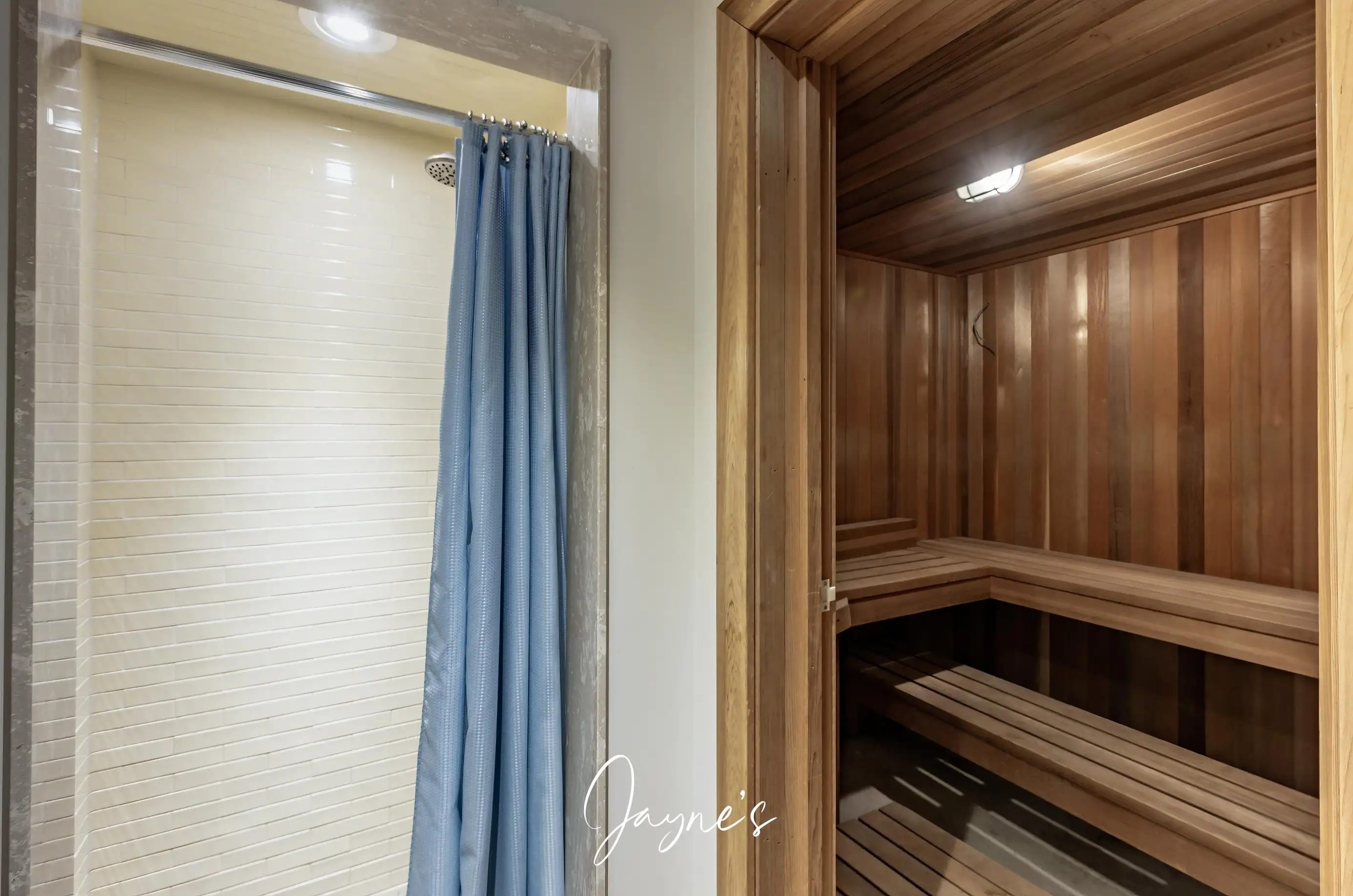 A Sauna can be found on the other side of the stairs.