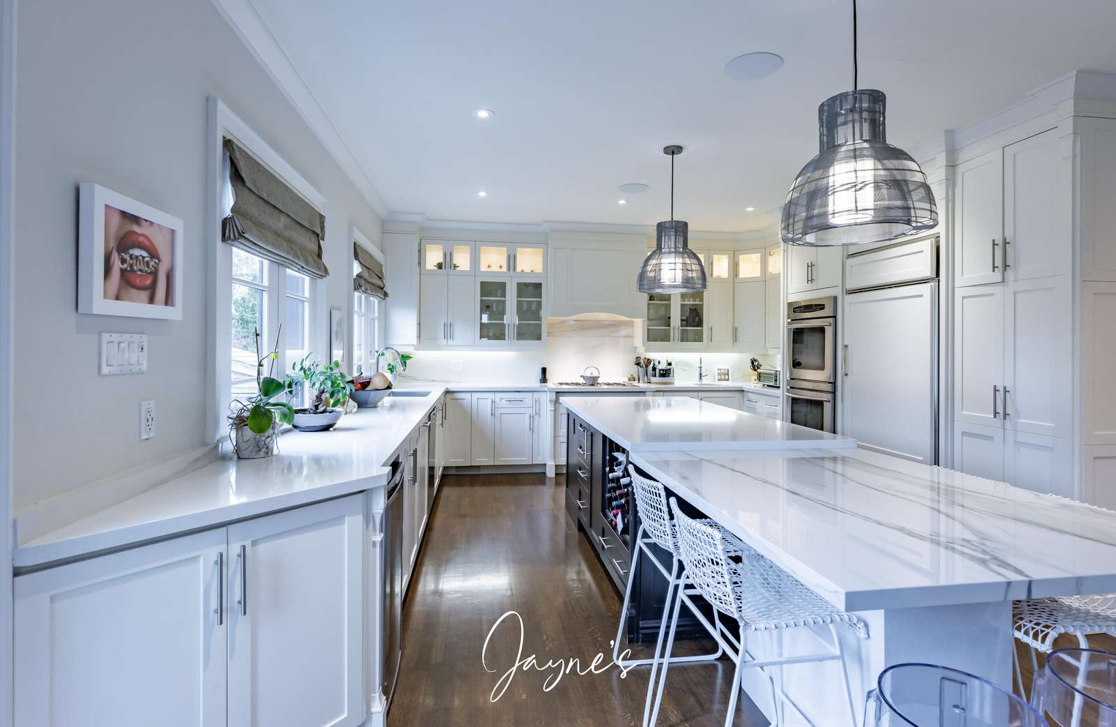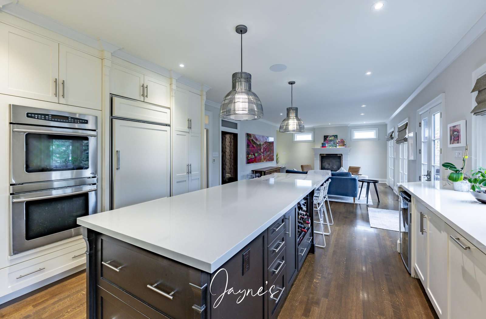 A beautiful space featuring an oversized island beneath 2 lights with seating for 6. A fridge, wall ovens, drink fridge, dishwasher and stove.