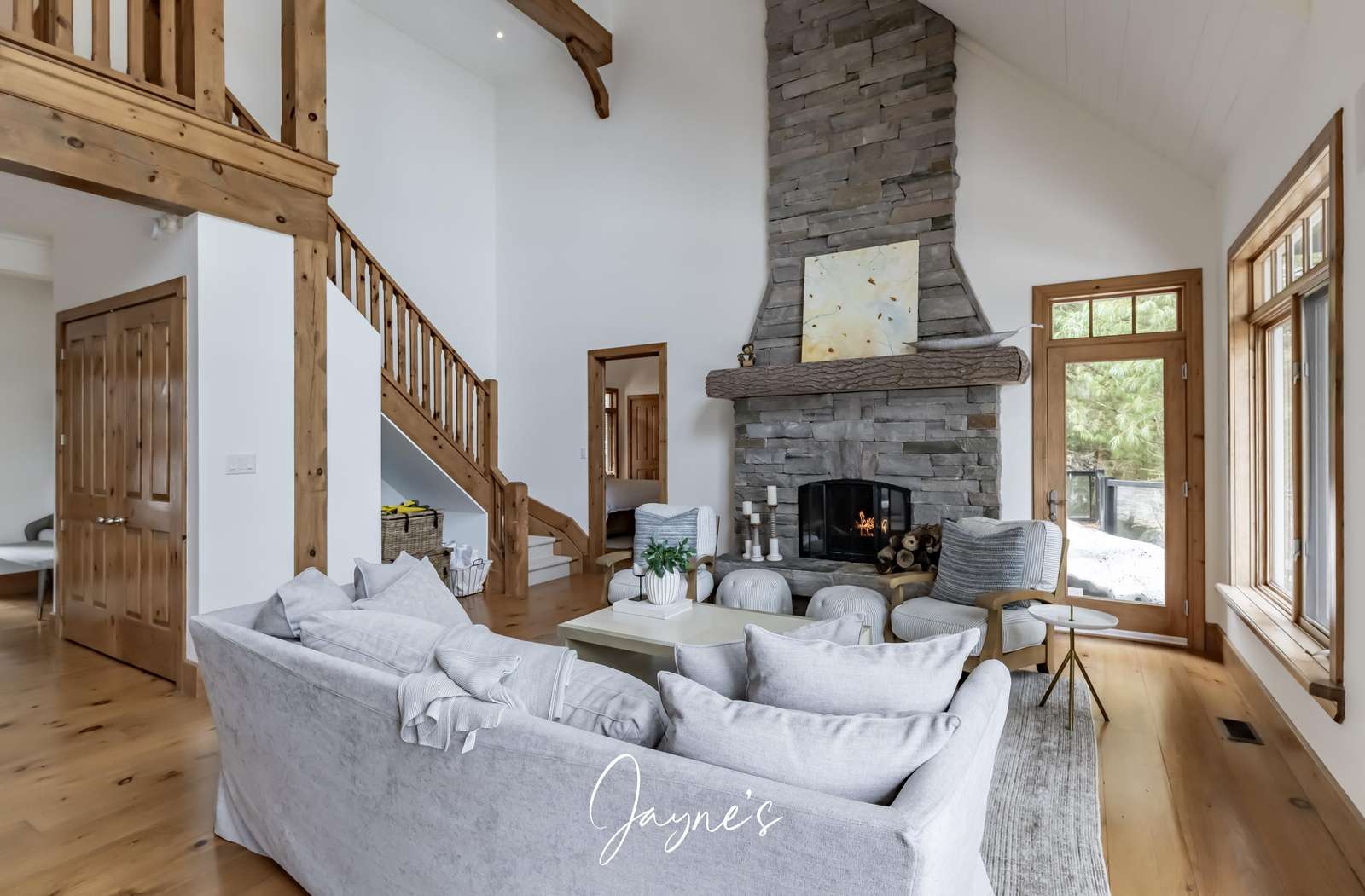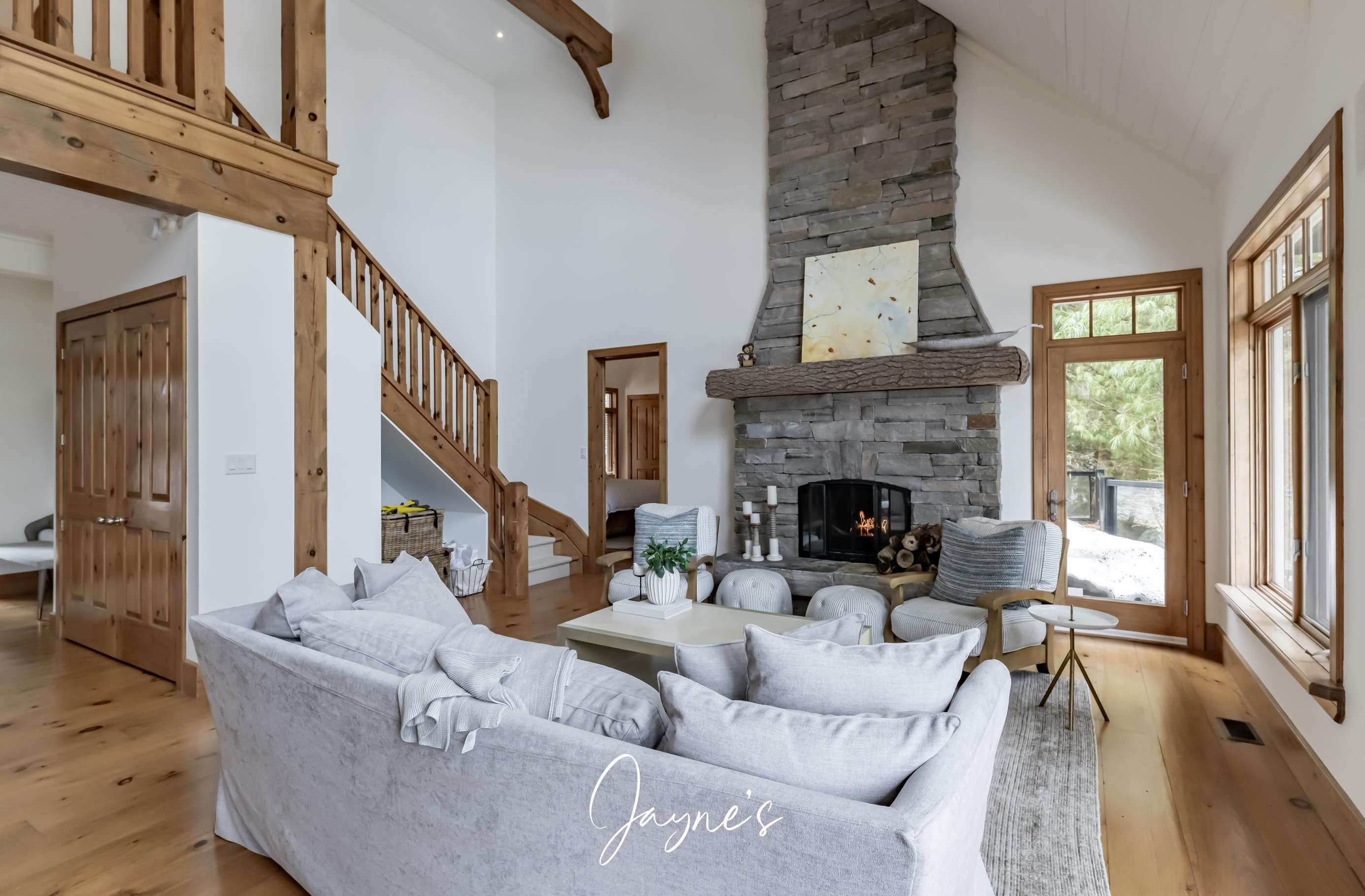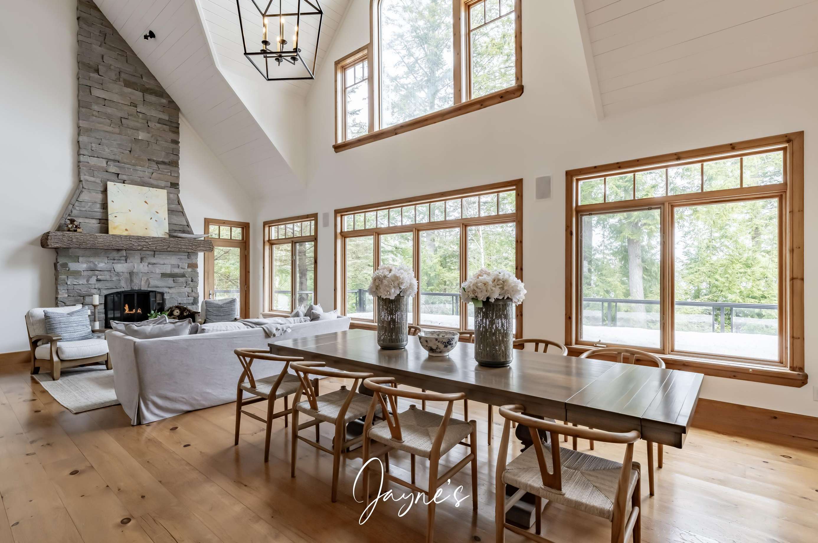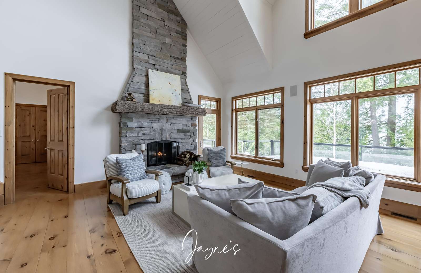 Elegant cathedral ceilings soar above a sofa and chairs. A large stone, wood-burning fireplace is captured in the centre of the room.