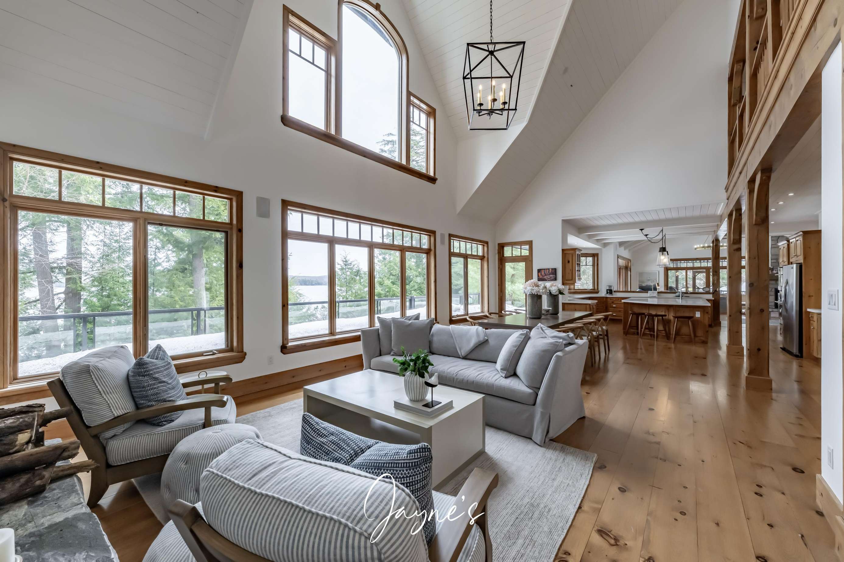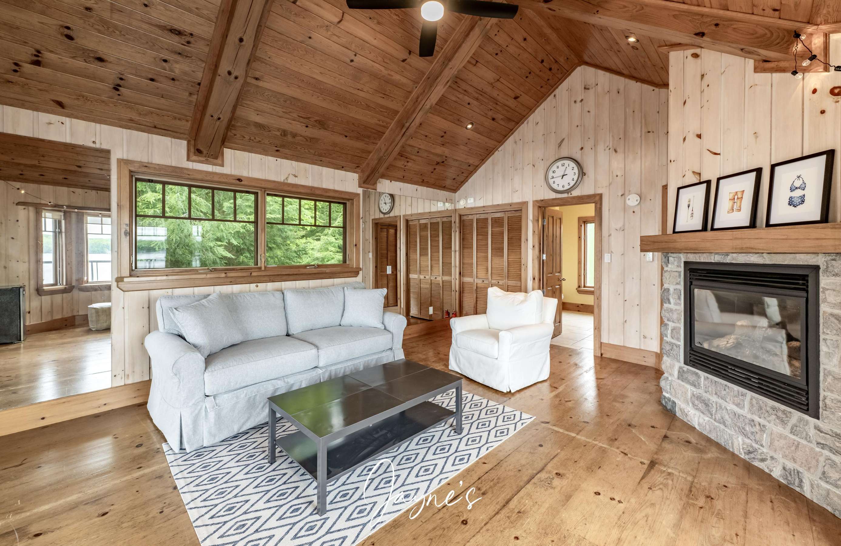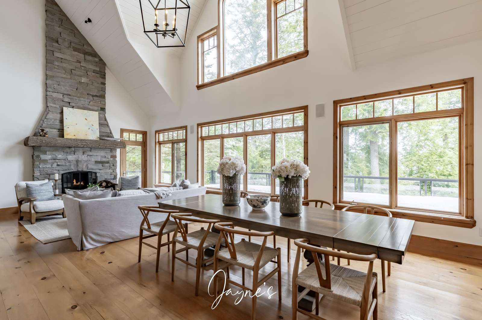 Elegant cathedral ceilings soar above a sofa and chairs. A large stone, wood-burning fireplace is captured in the centre of the room.