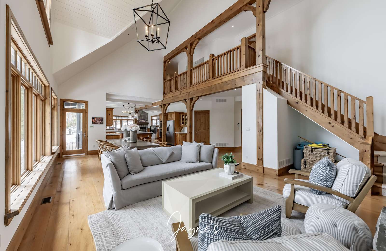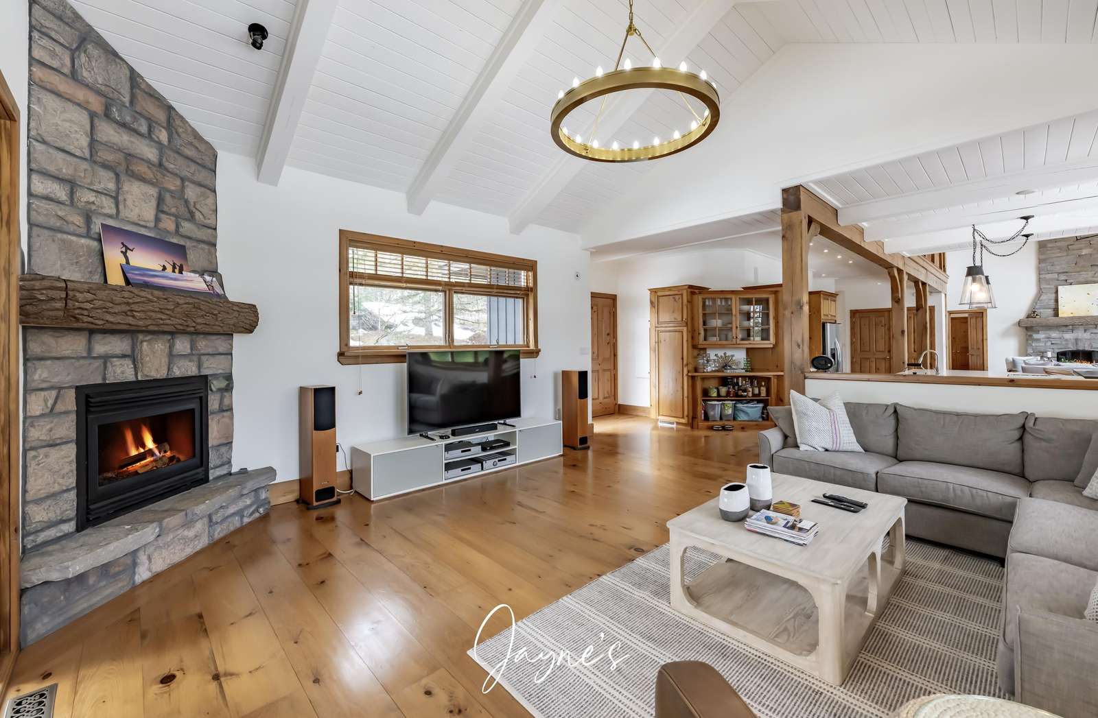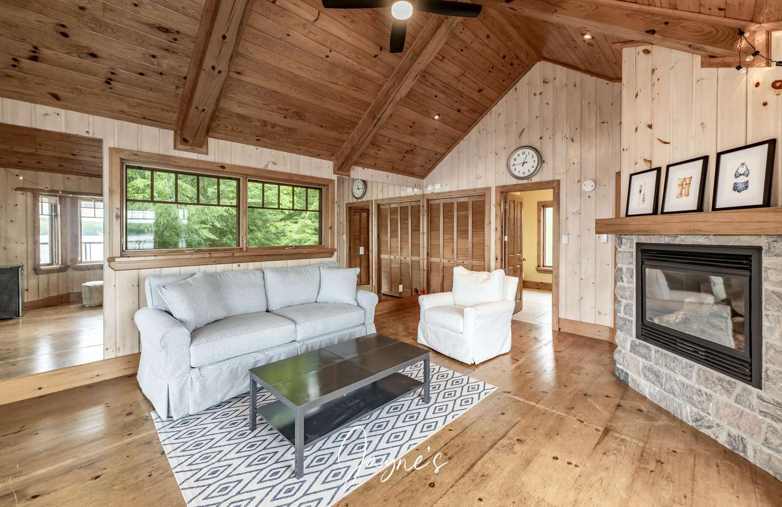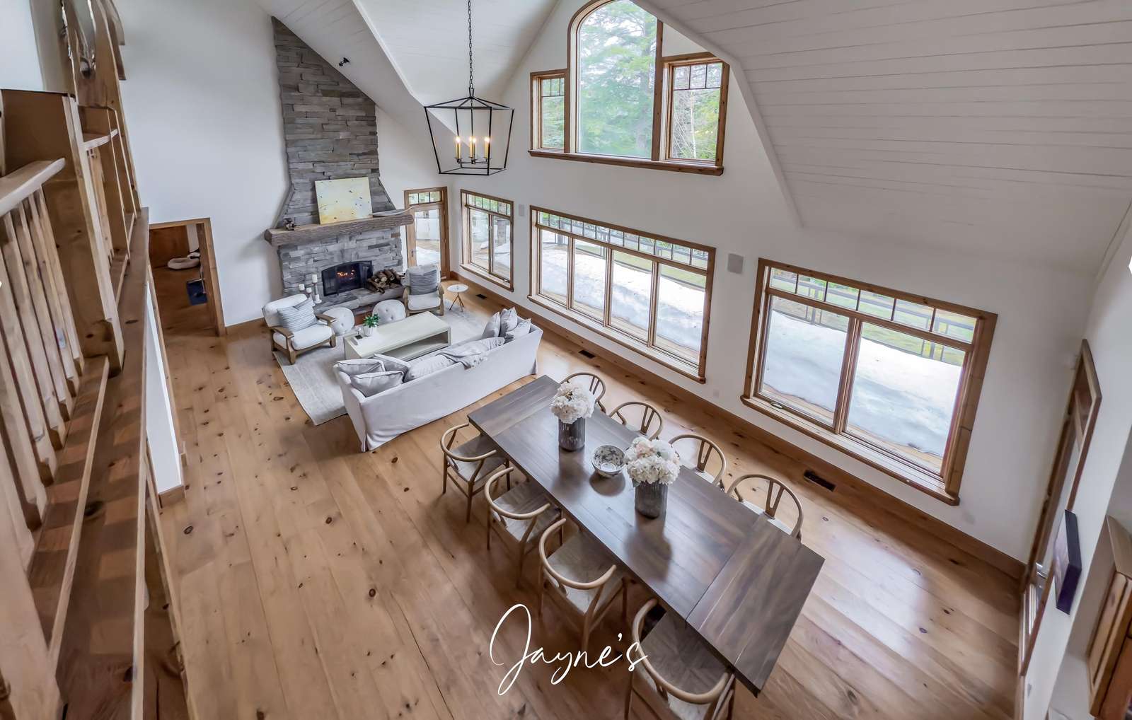 Elegant cathedral ceilings soar above a sofa and chairs. A large stone, wood-burning fireplace is captured in the centre of the room.