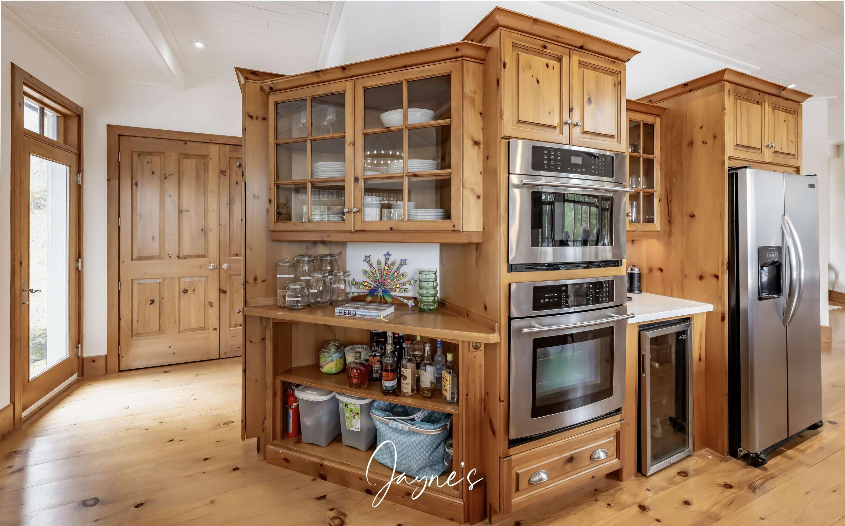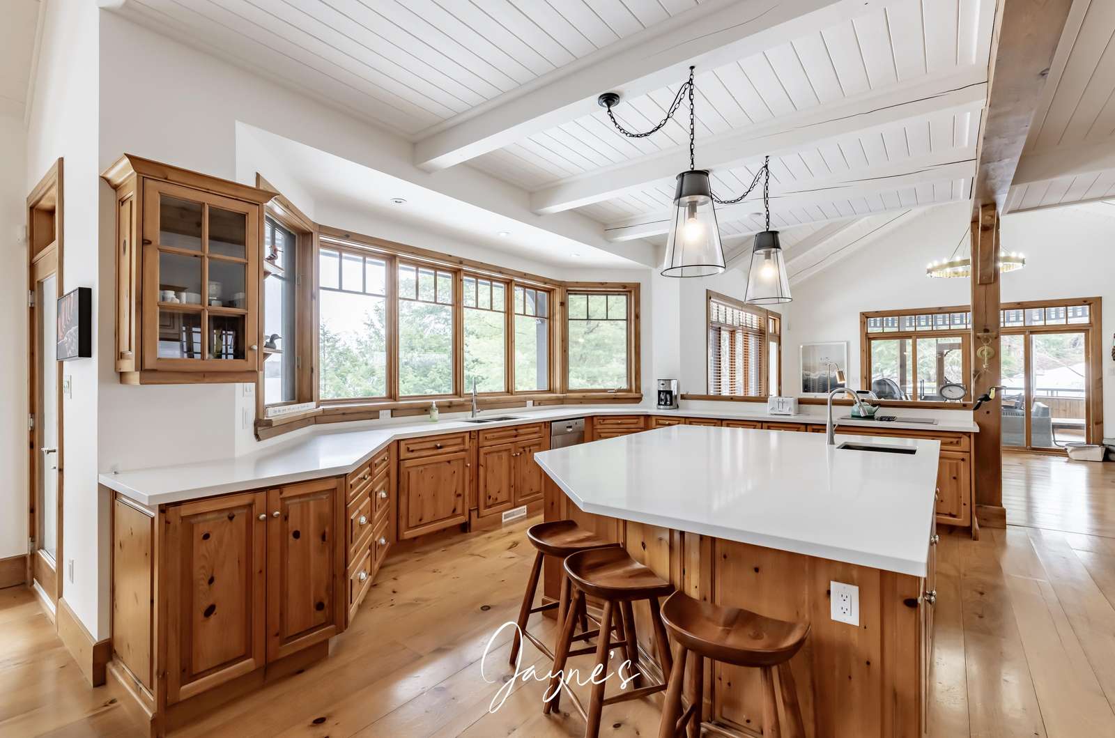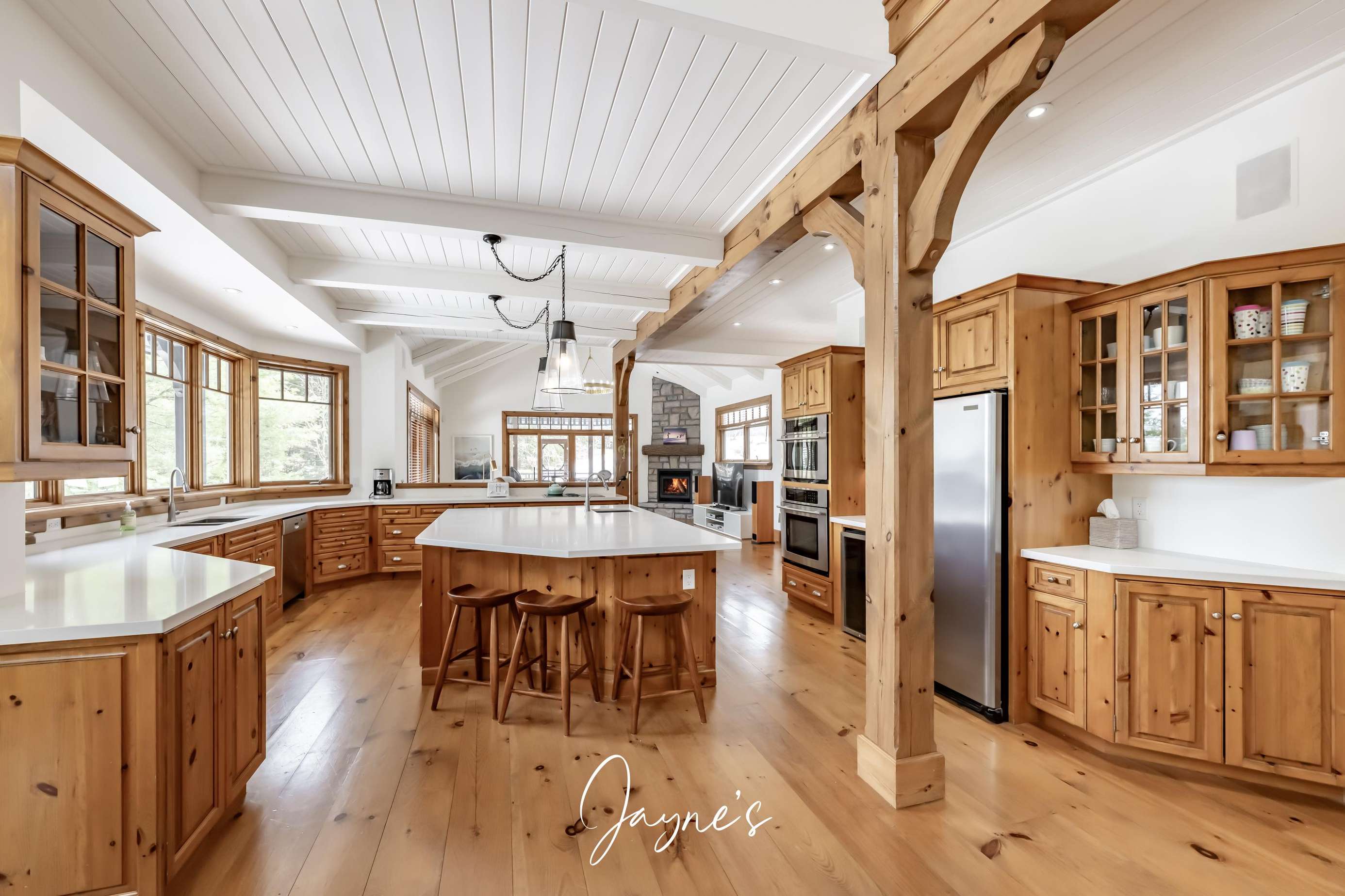 This spacious kitchen features a farmhouse sink overlooking the lake, fridge/freezer, dishwasher, wall ovens, microwave and a cooktop. An oversized island is encircled by 6 bar stools and features a small with small sink for additional use!