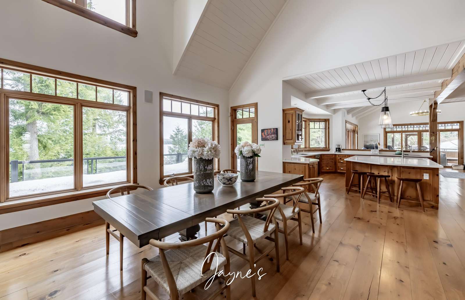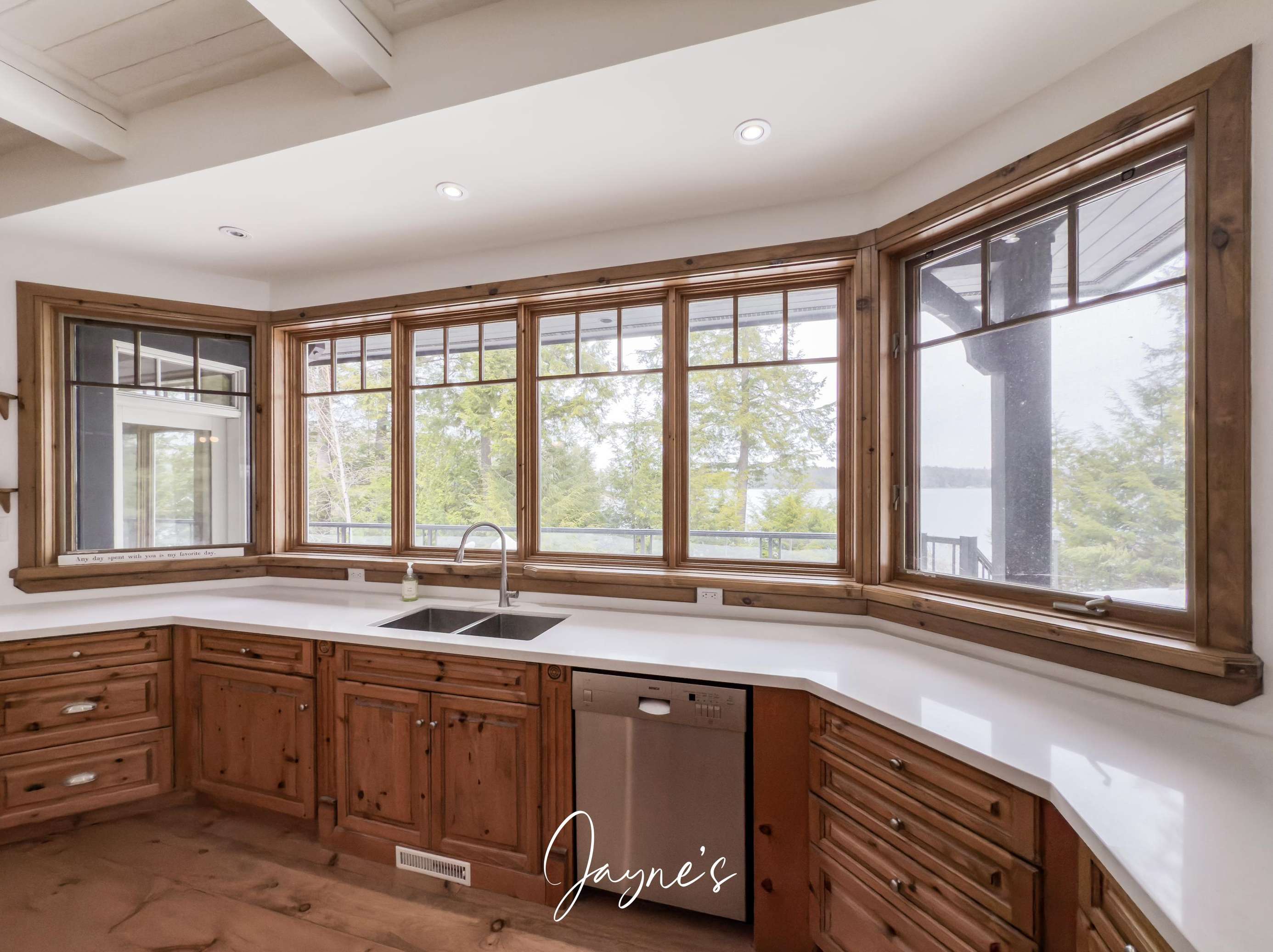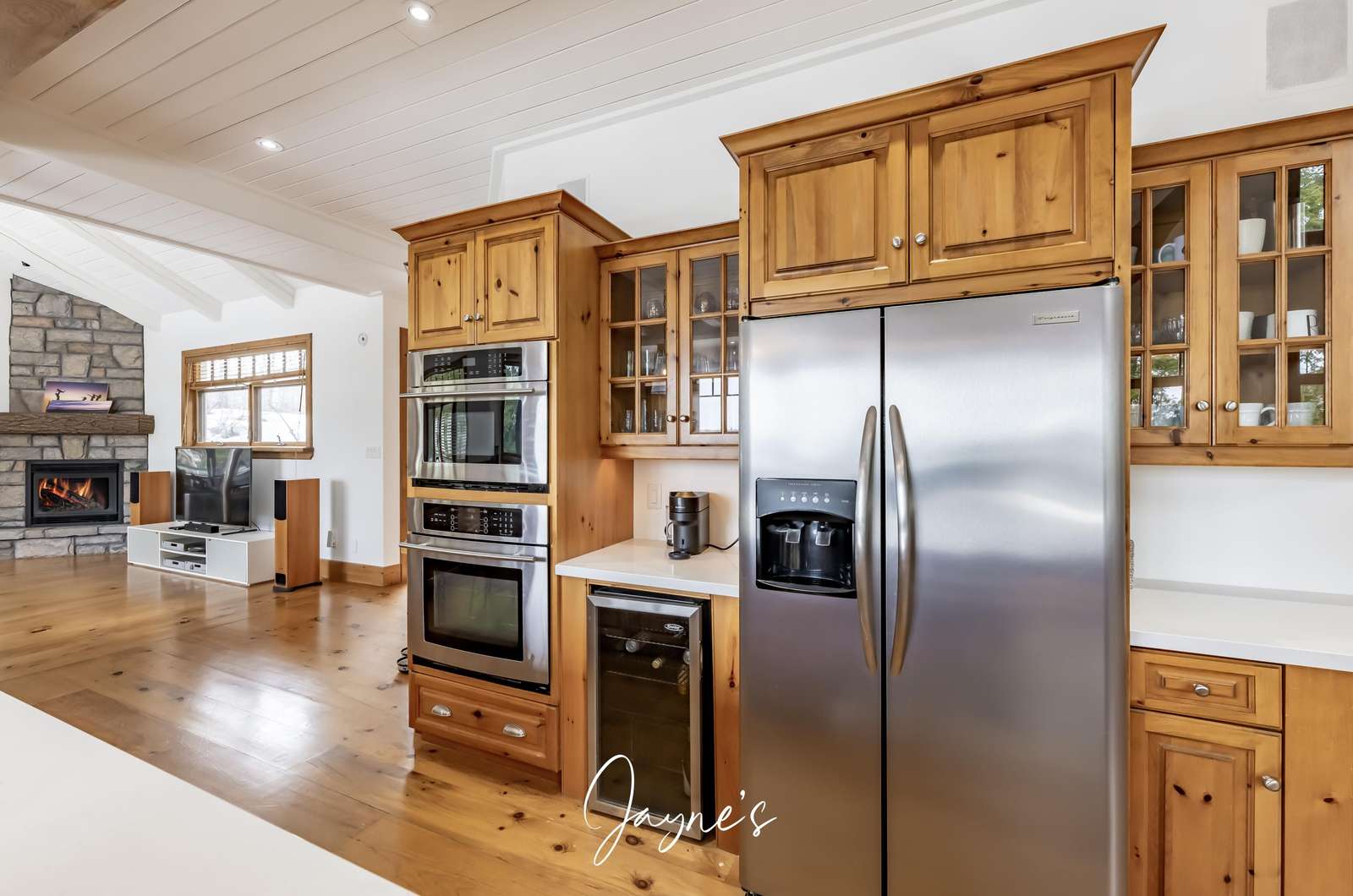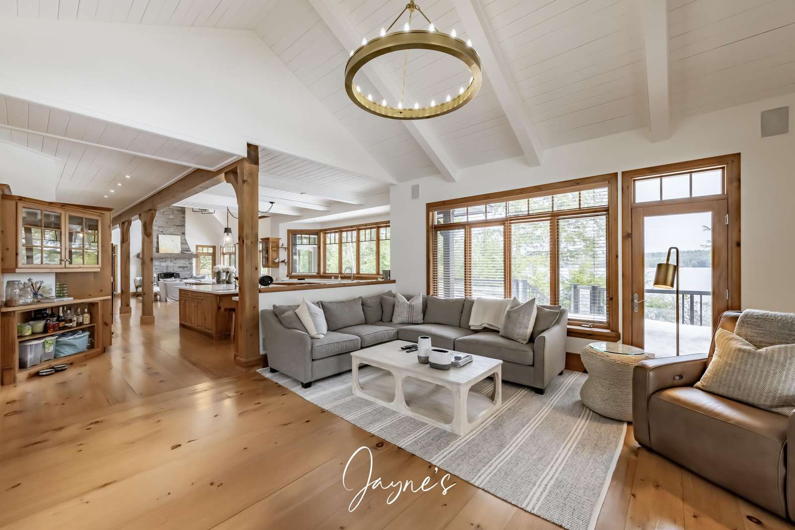 This spacious kitchen features a farmhouse sink overlooking the lake, fridge/freezer, dishwasher, wall ovens, microwave and a cooktop. An oversized island is encircled by 6 bar stools and features a small with small sink for additional use!