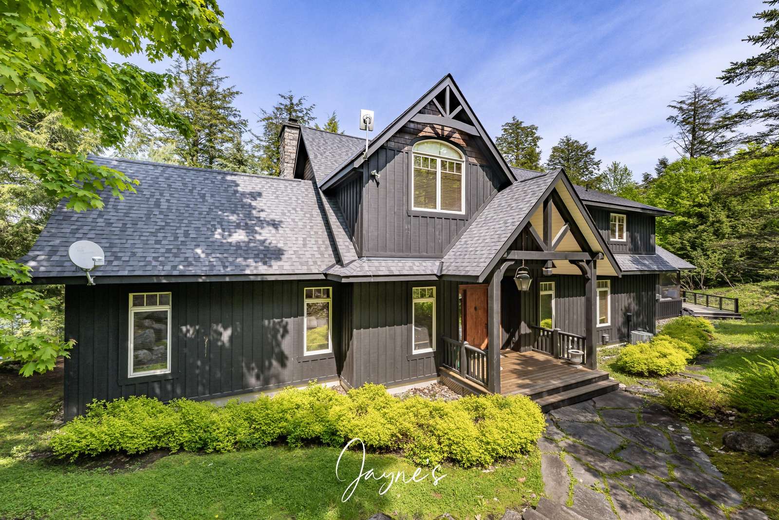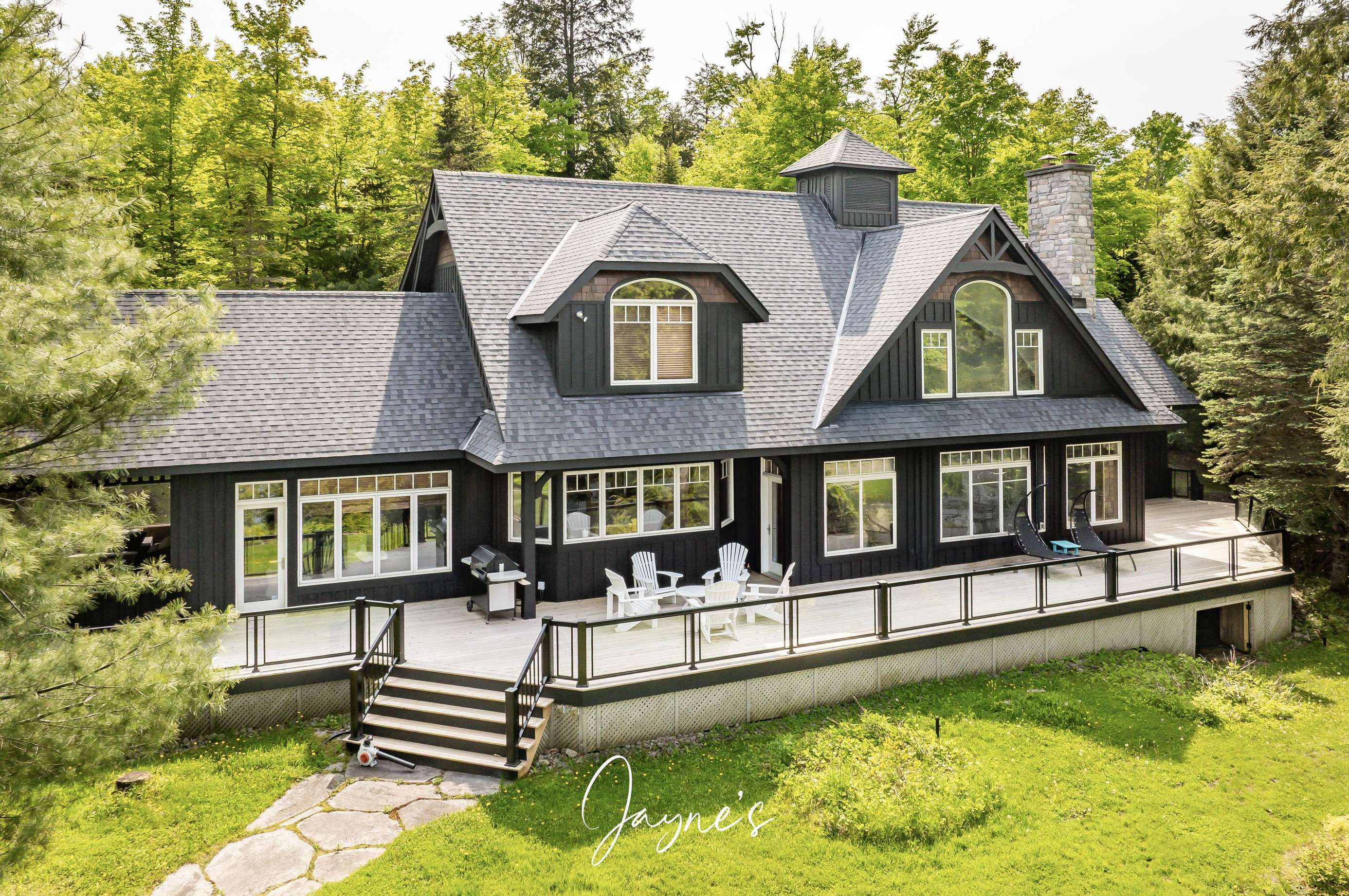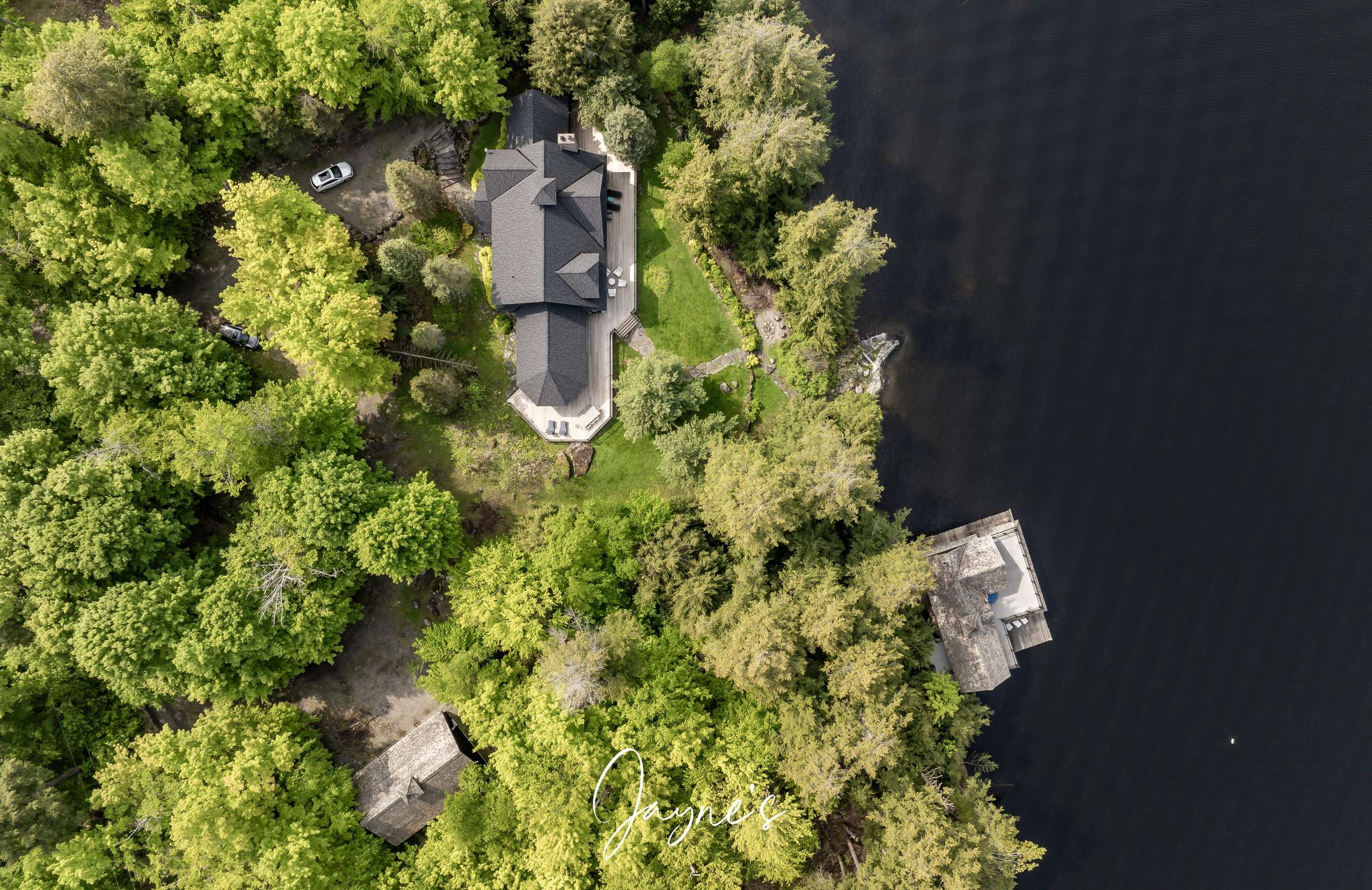 GOLDEN SANCTUARY - A spacious driveway bring you to the cottage where a few steps lead you down to the Main Cottage. An elegant wrap-around deck transitions from the Muskoka Room, around the lakeside of the cottage - boasting ample room for lounging in the sun. As the first rays of sunlight peek over the horizon, they paint the sky in vibrant hues. It also offers an outdoor dining set and BBQ to enjoy a hot lunch. The property is adorned with beautiful gardens - easily traversable land with take you down to the expansive boathouse.